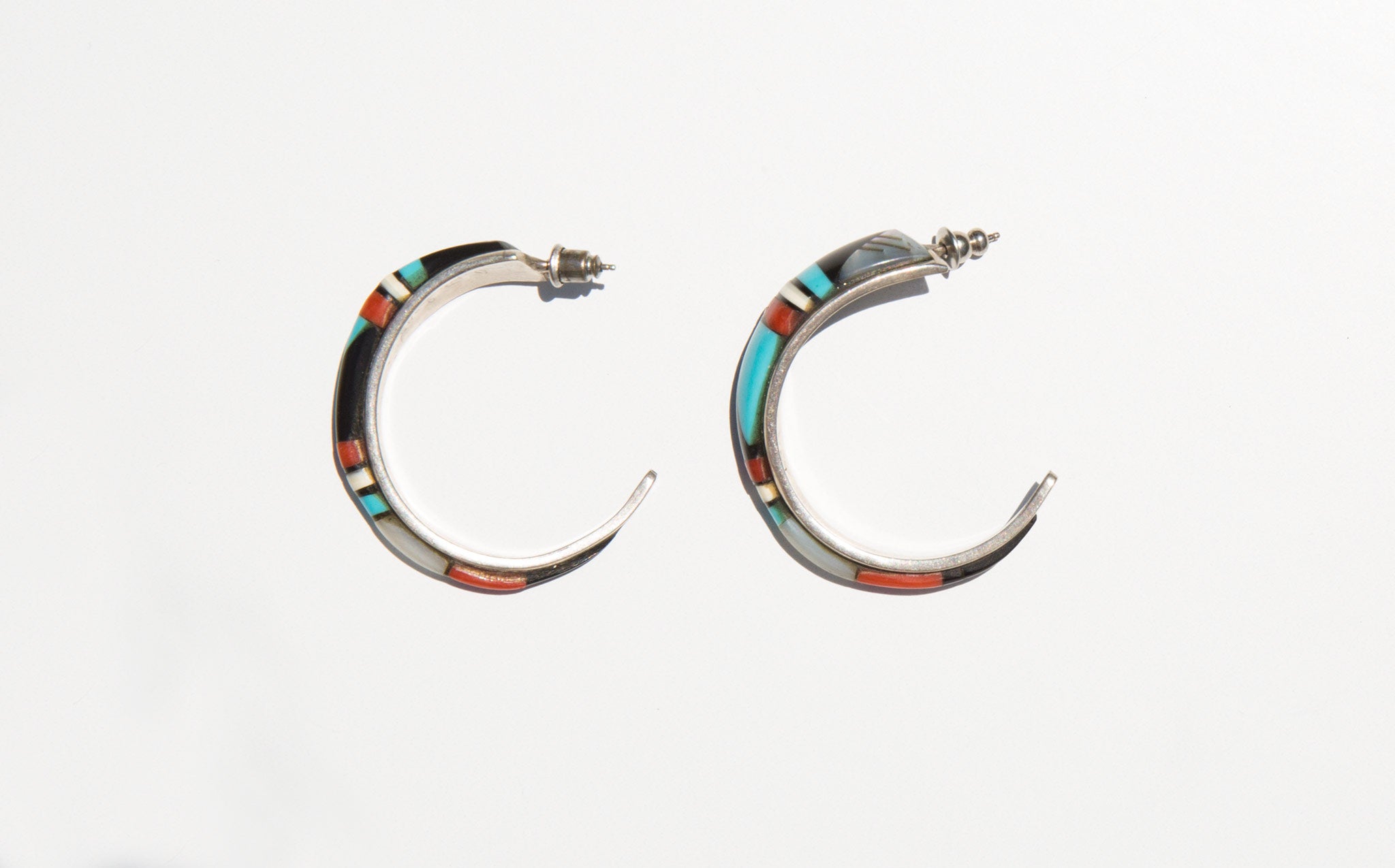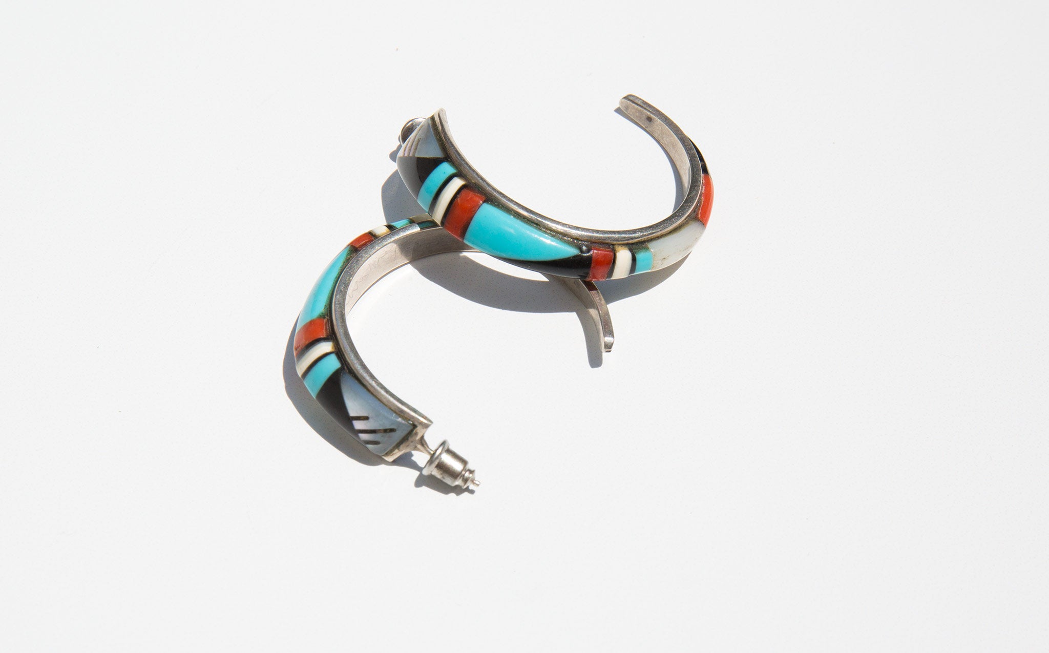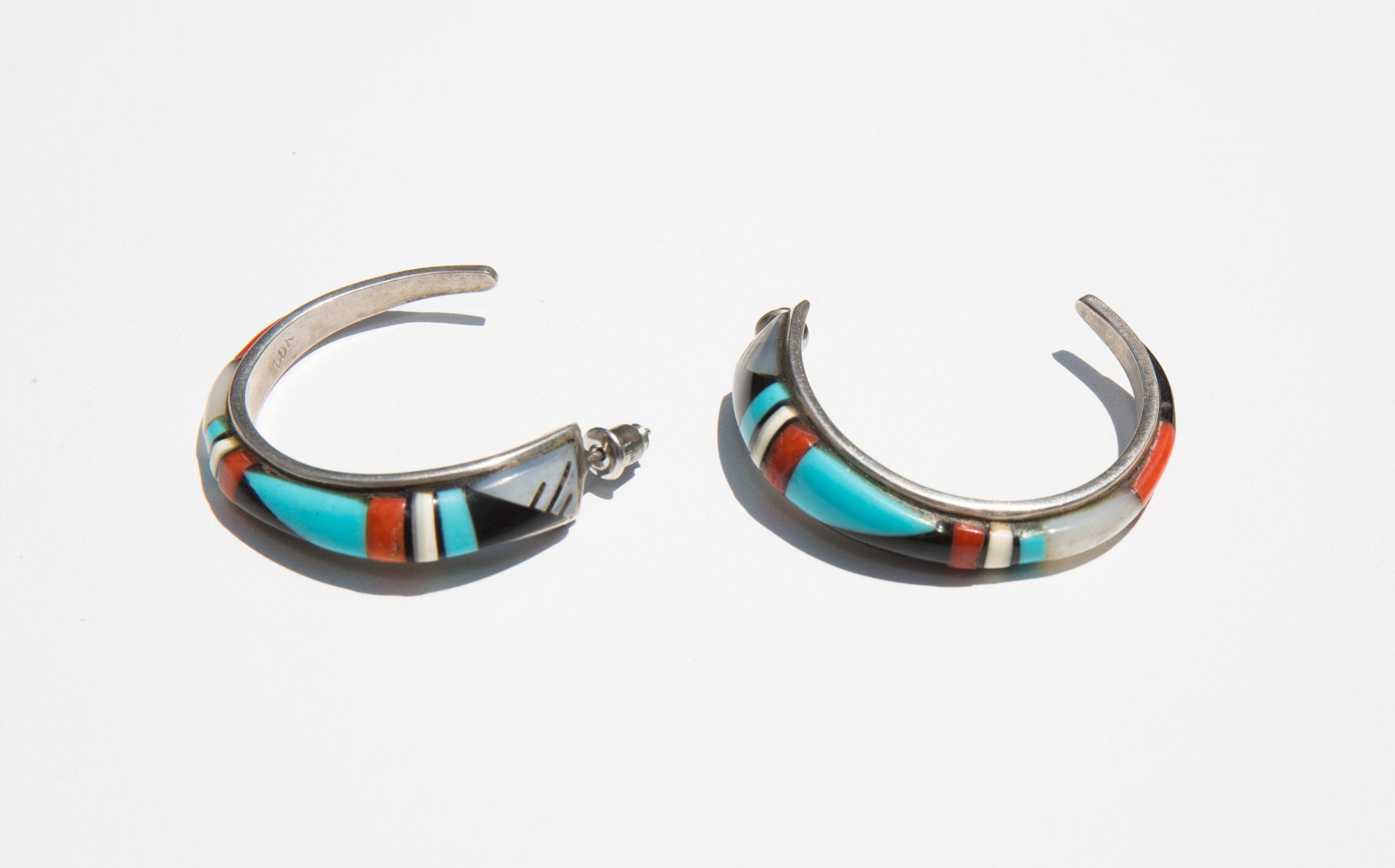 Signed sterling silver and turquoise, jet, shell, mother of pearl, and natural coral inlay Zuni earrings from the 1950's.