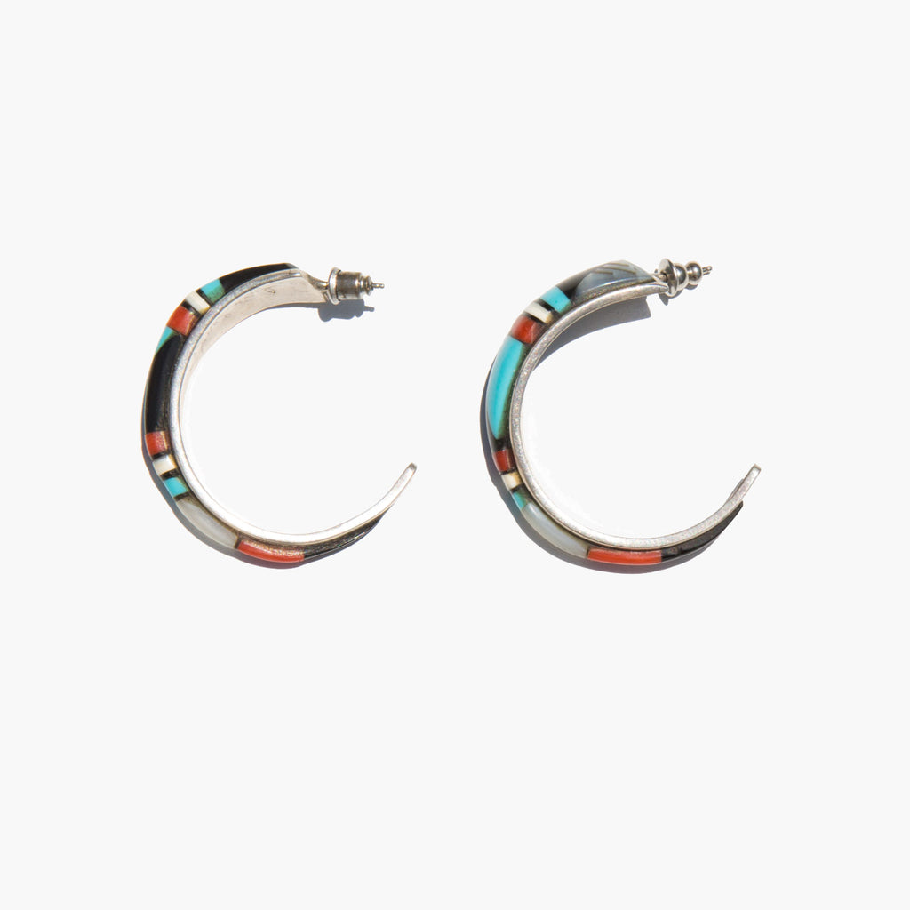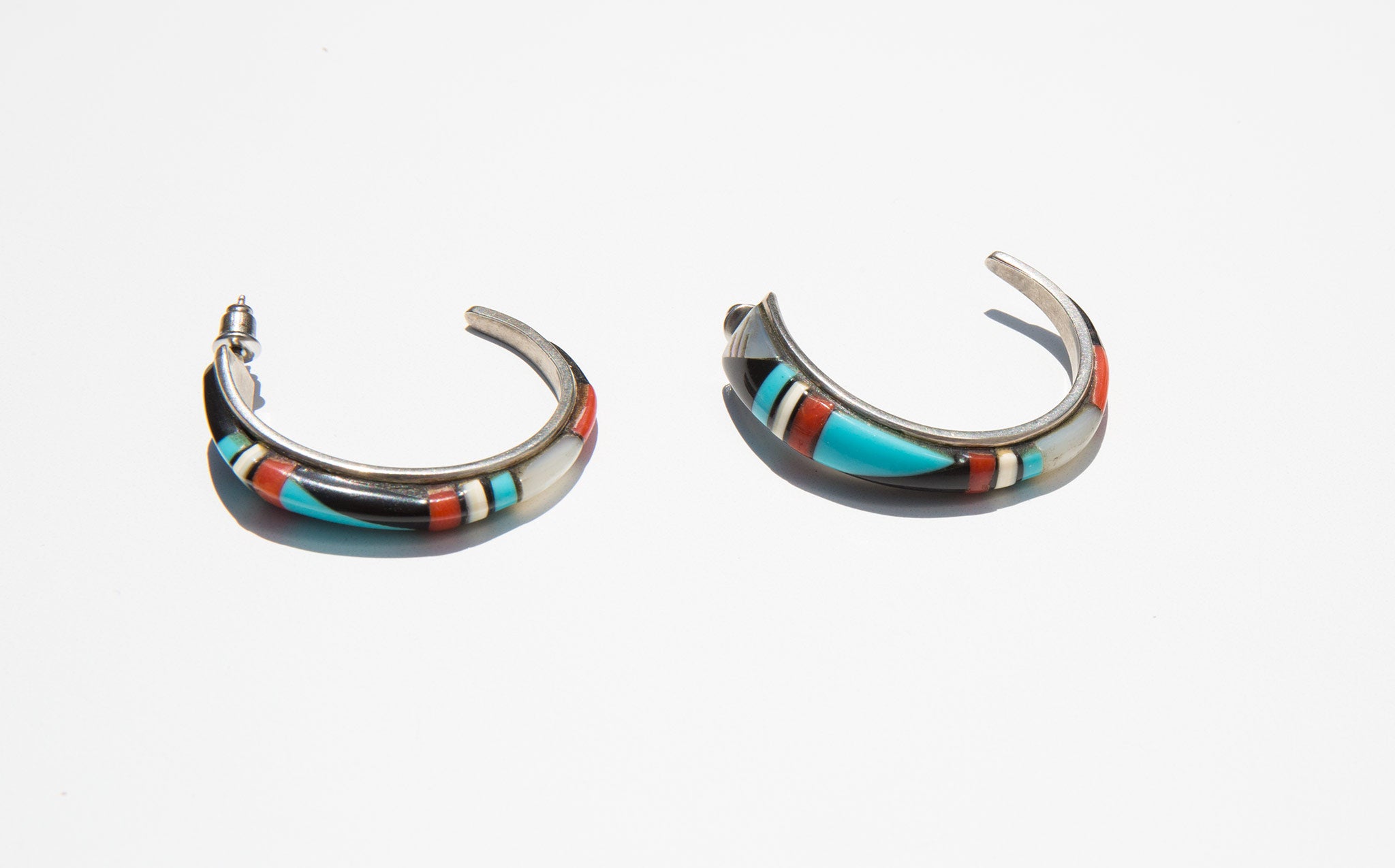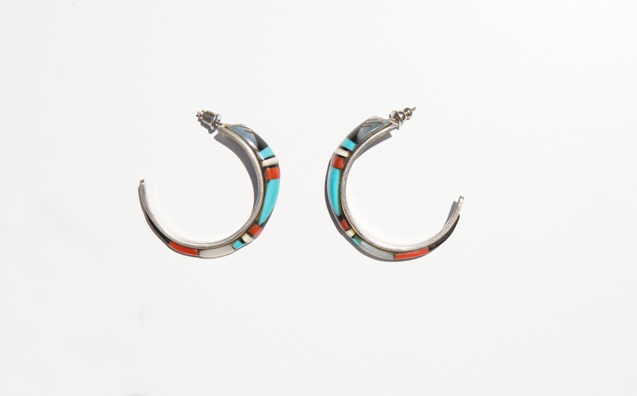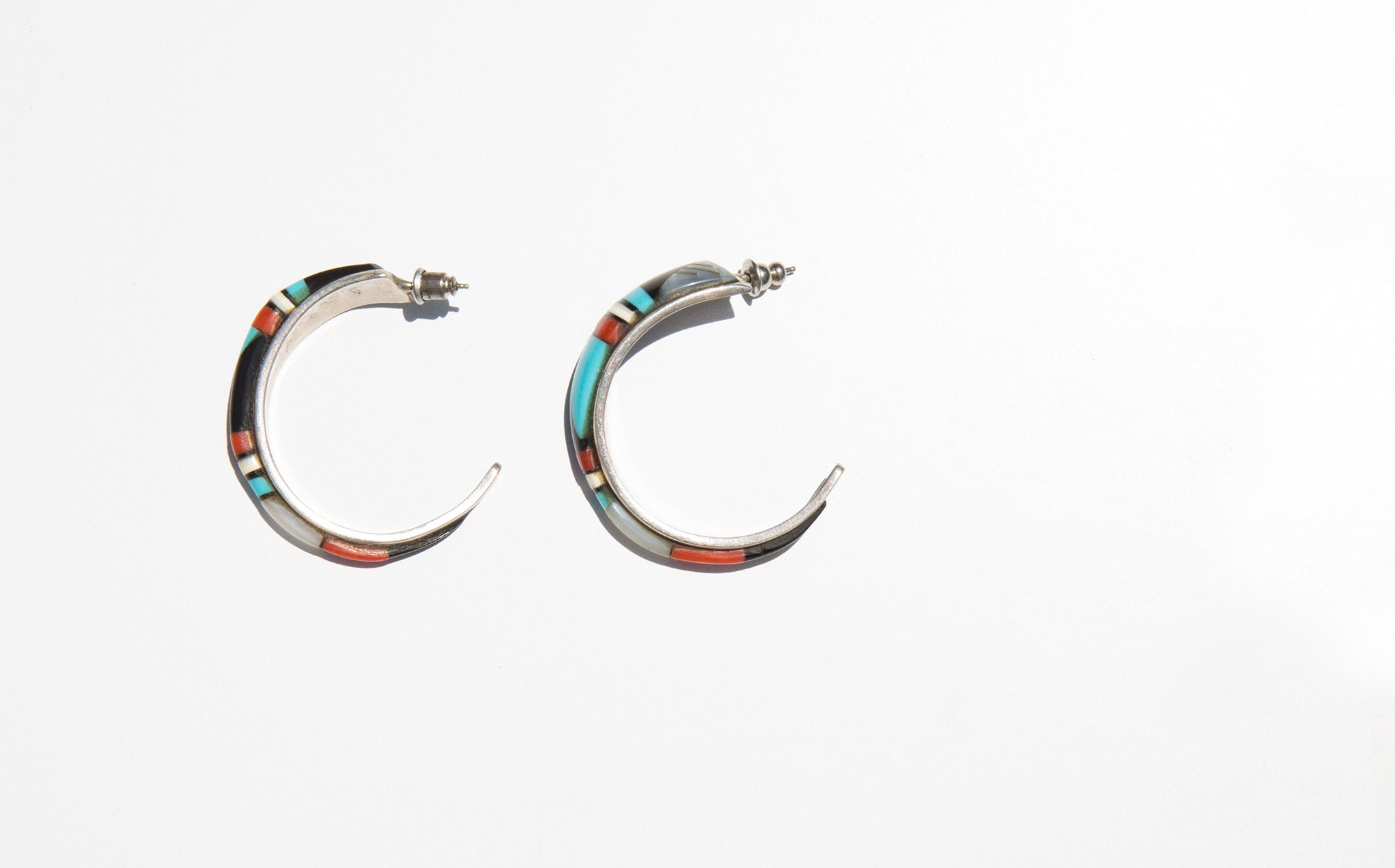Signed sterling silver and turquoise, jet, shell, mother of pearl, and natural coral inlay Zuni earrings from the 1950's.