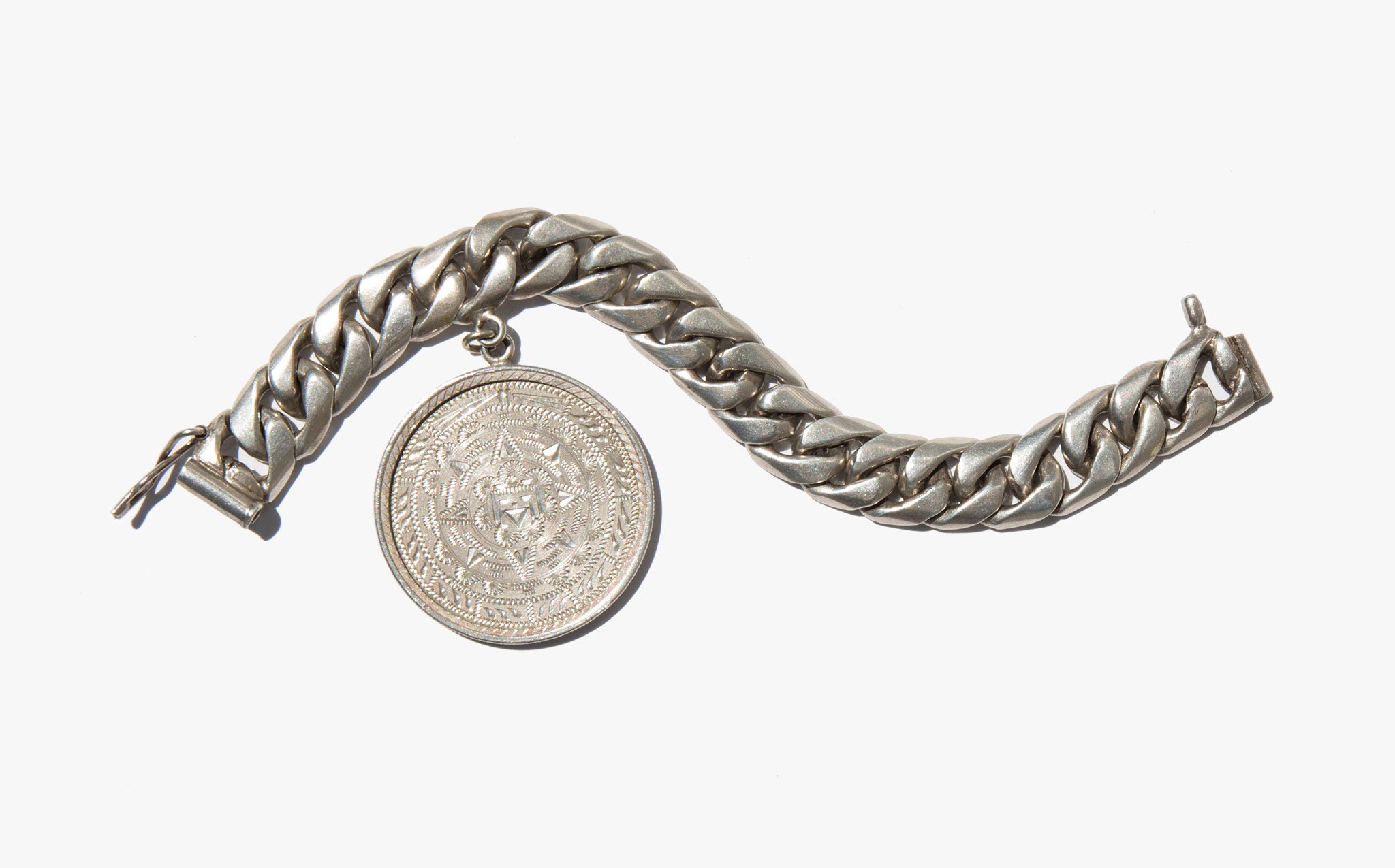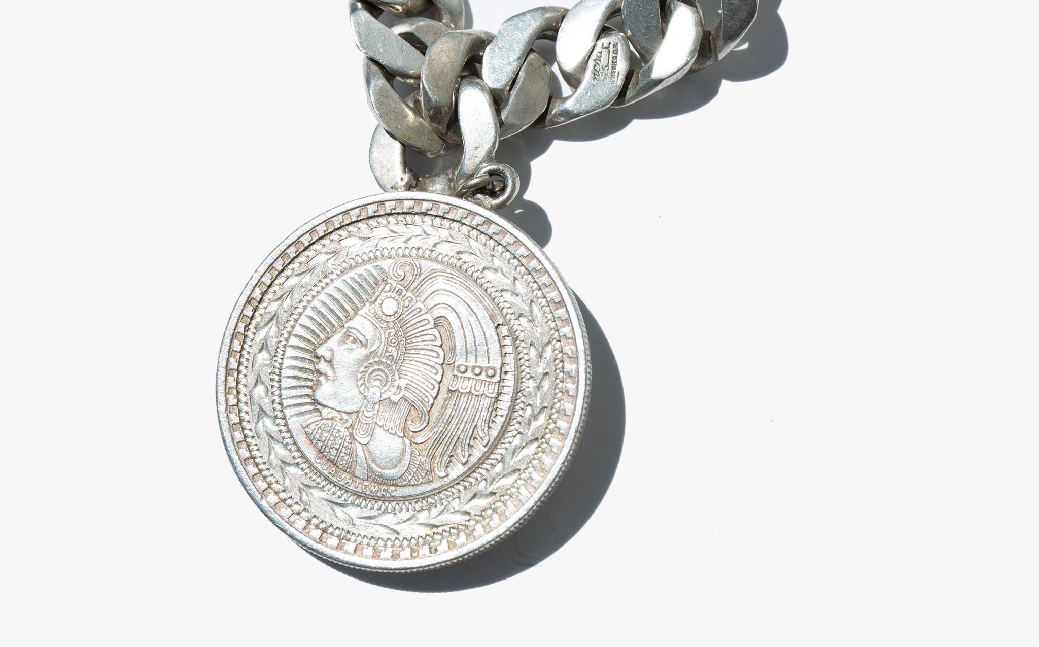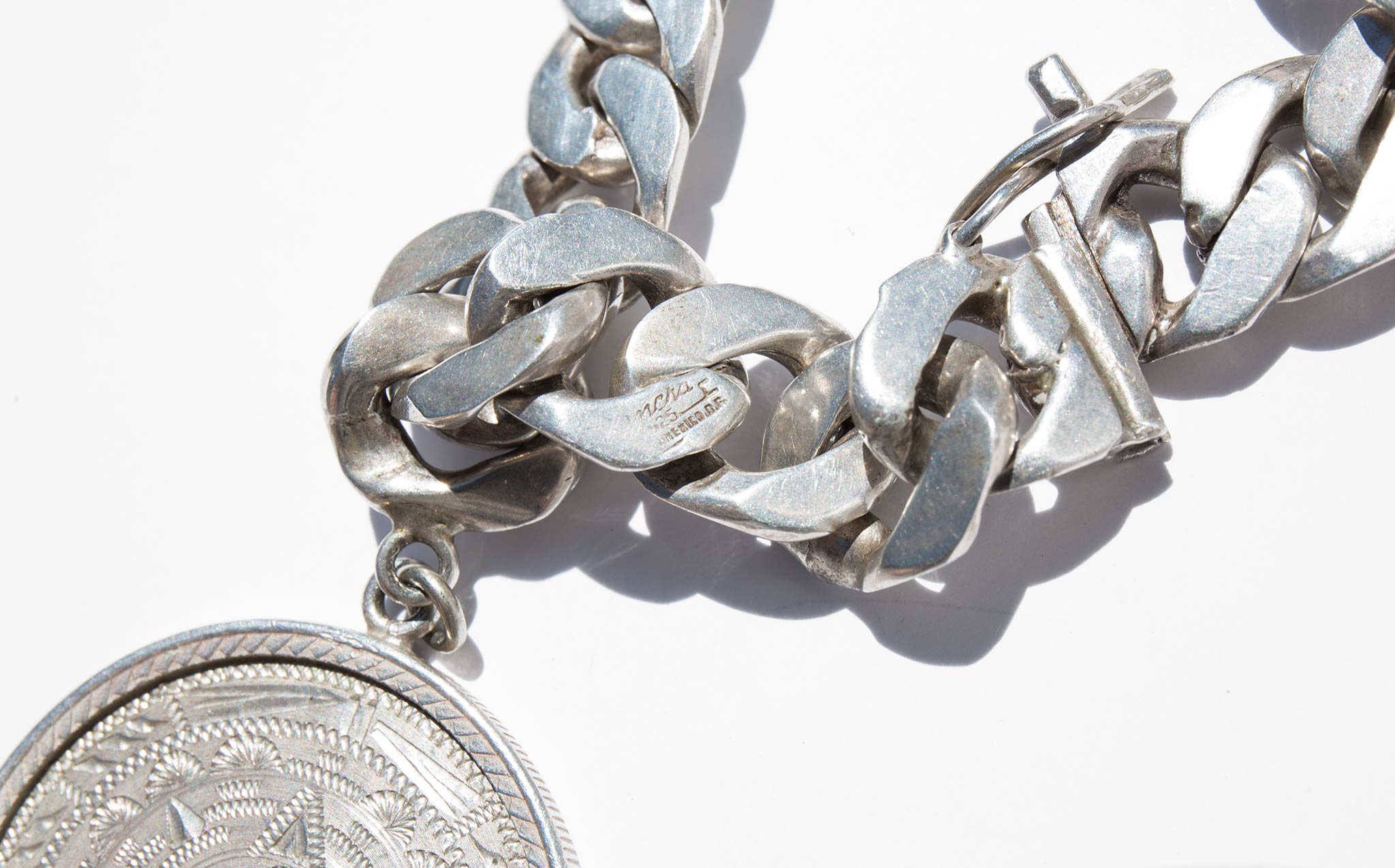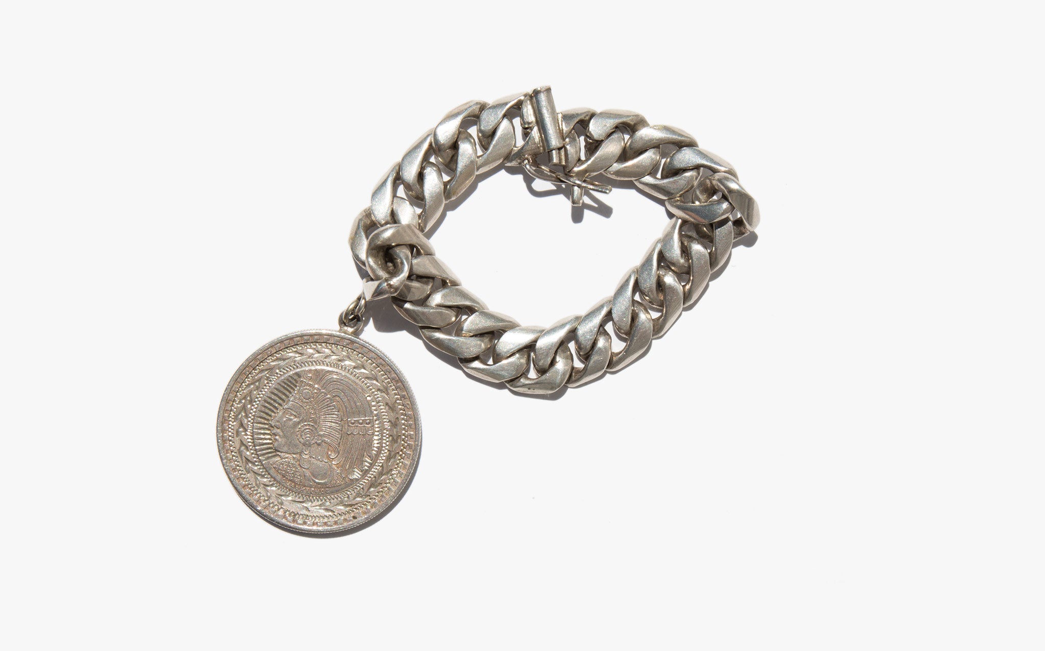 Heavy, vintage, solid Mexican sterling silver bracelet with an oversized coin depicting the last Aztec emperor Cuautémoc and a representation of the Aztec calendar. A stunning, unusual piece.