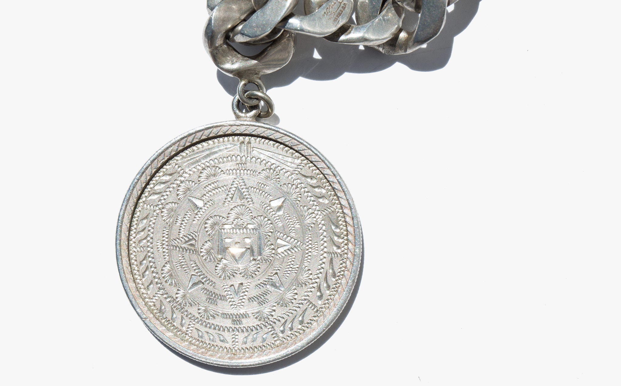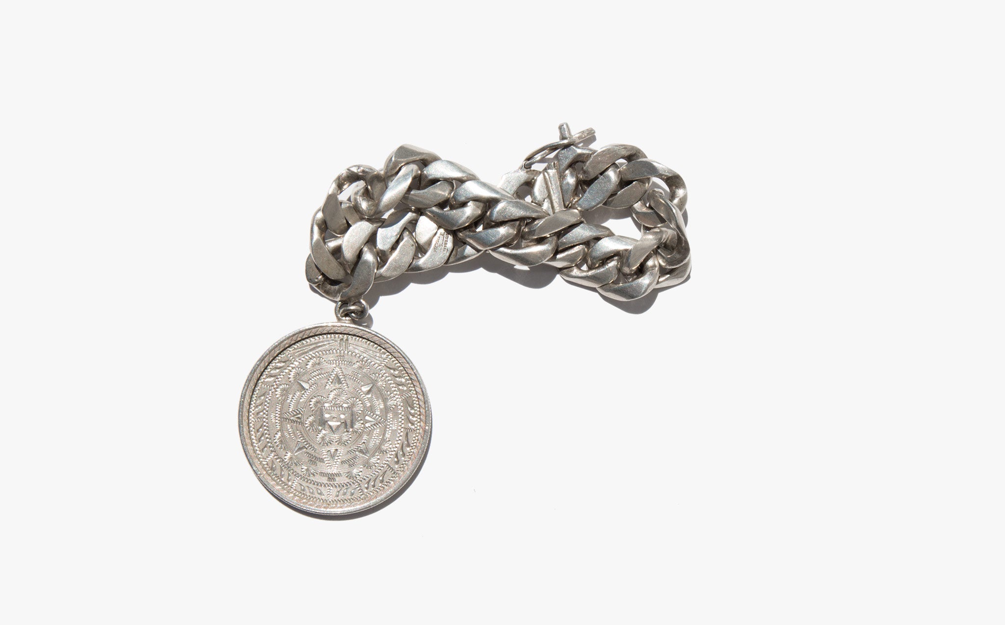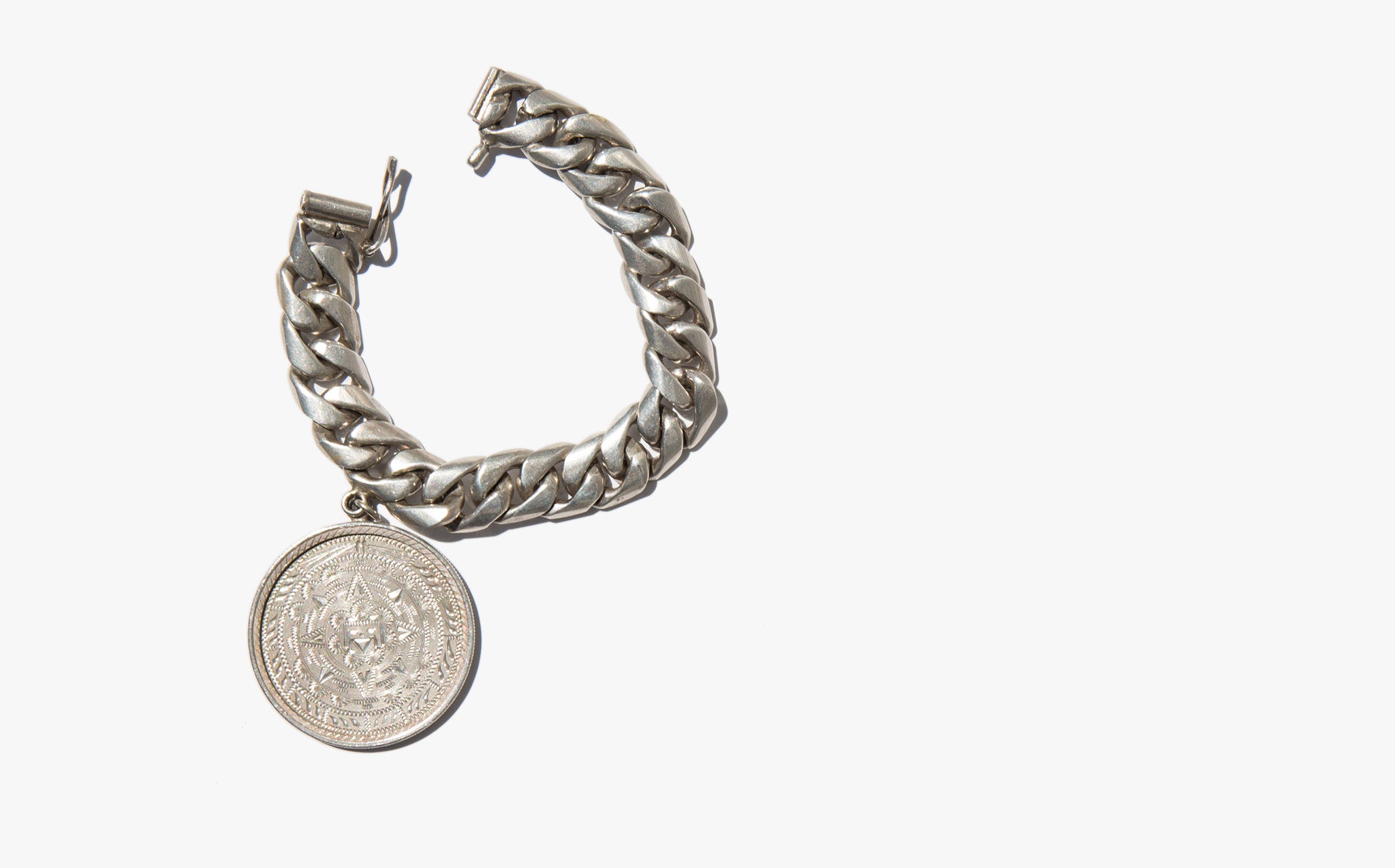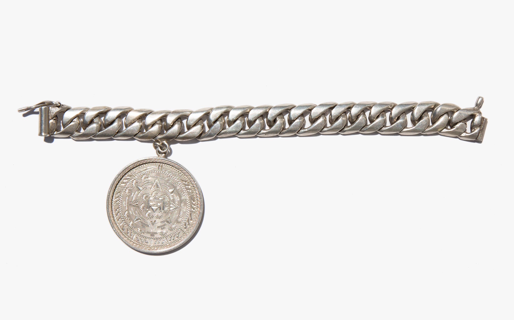 Heavy, vintage, solid Mexican sterling silver bracelet with an oversized coin depicting the last Aztec emperor Cuautémoc and a representation of the Aztec calendar. A stunning, unusual piece.