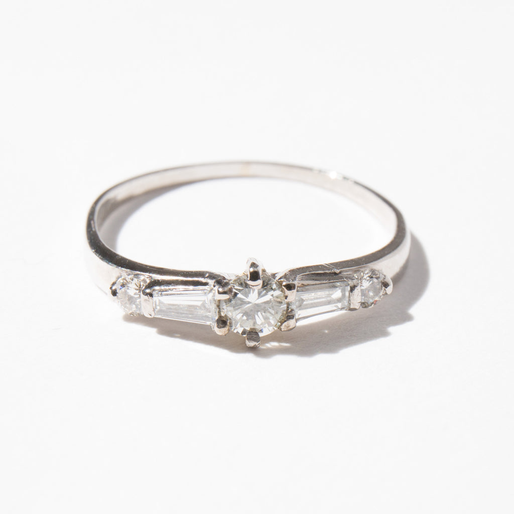 1960's rhodium plated platinum band, slightly curved so it can be worn with an engagement ring. Tapered baguettes with three melee diamonds. Total diamond weight is 1/2 ct.