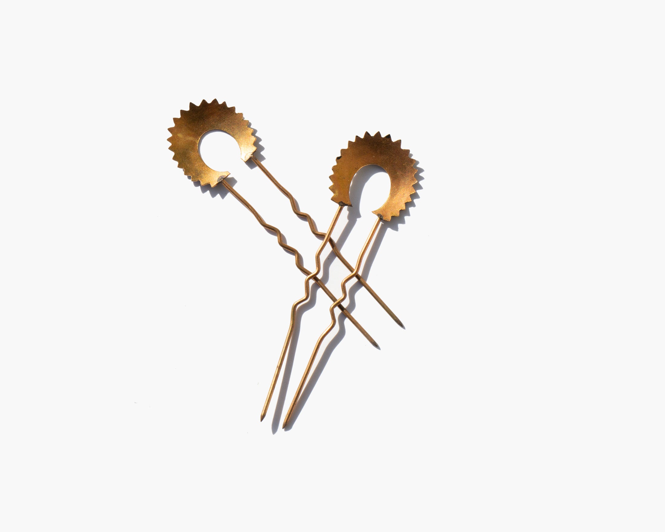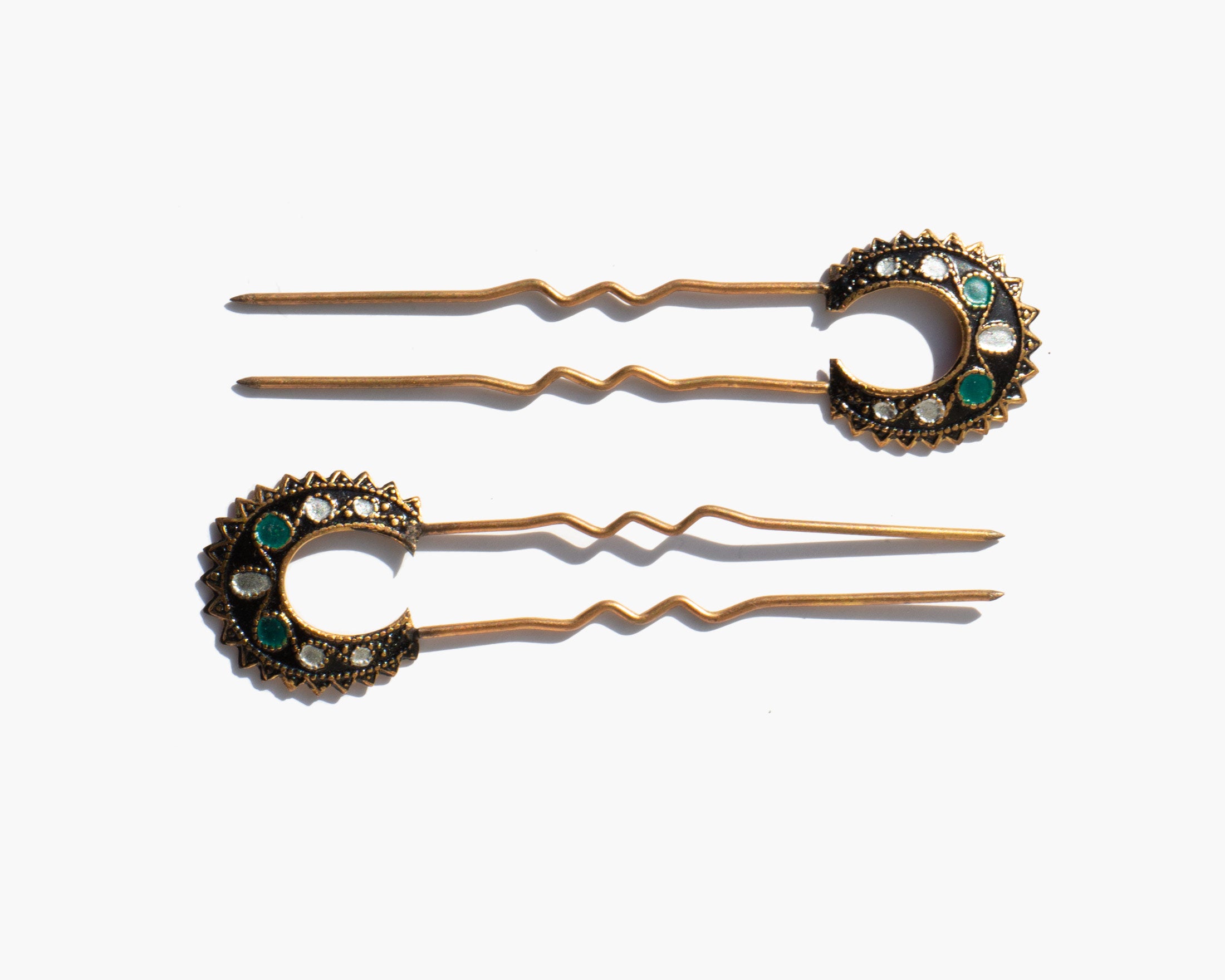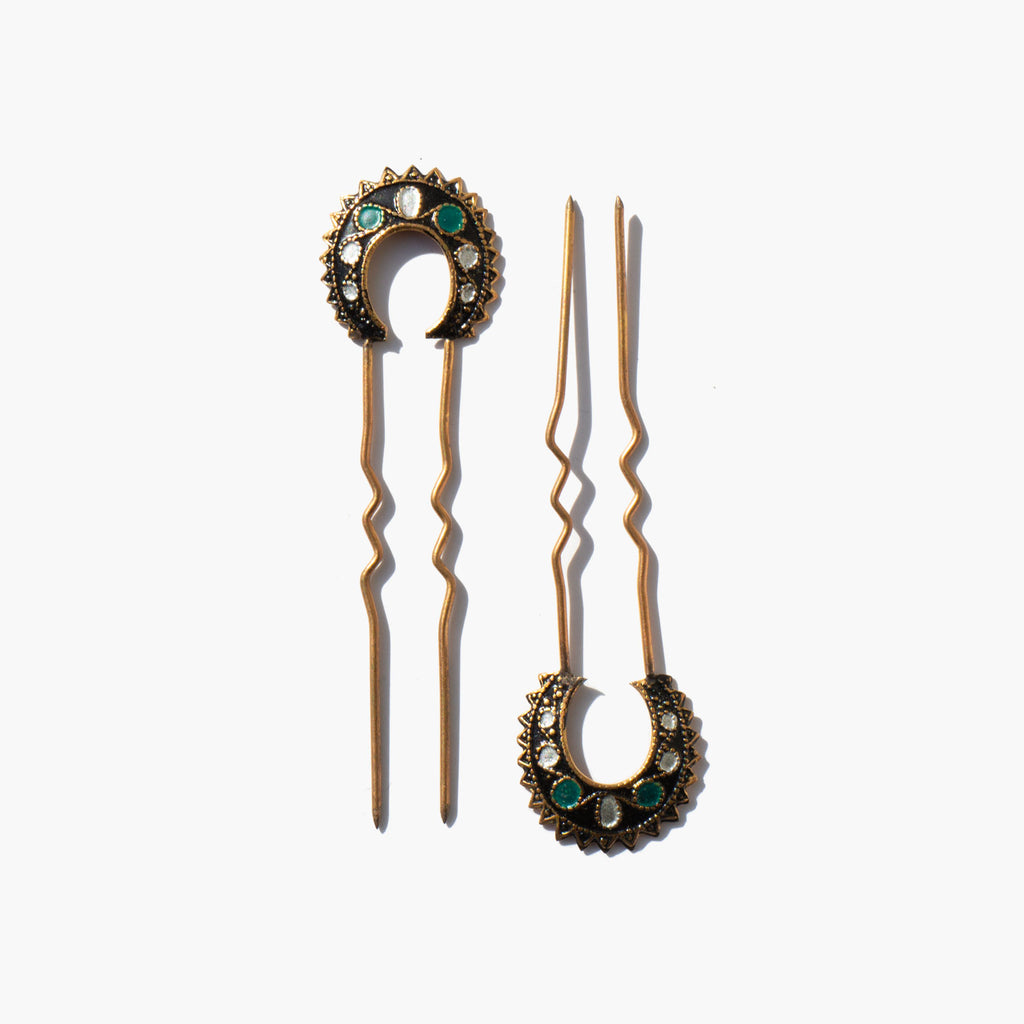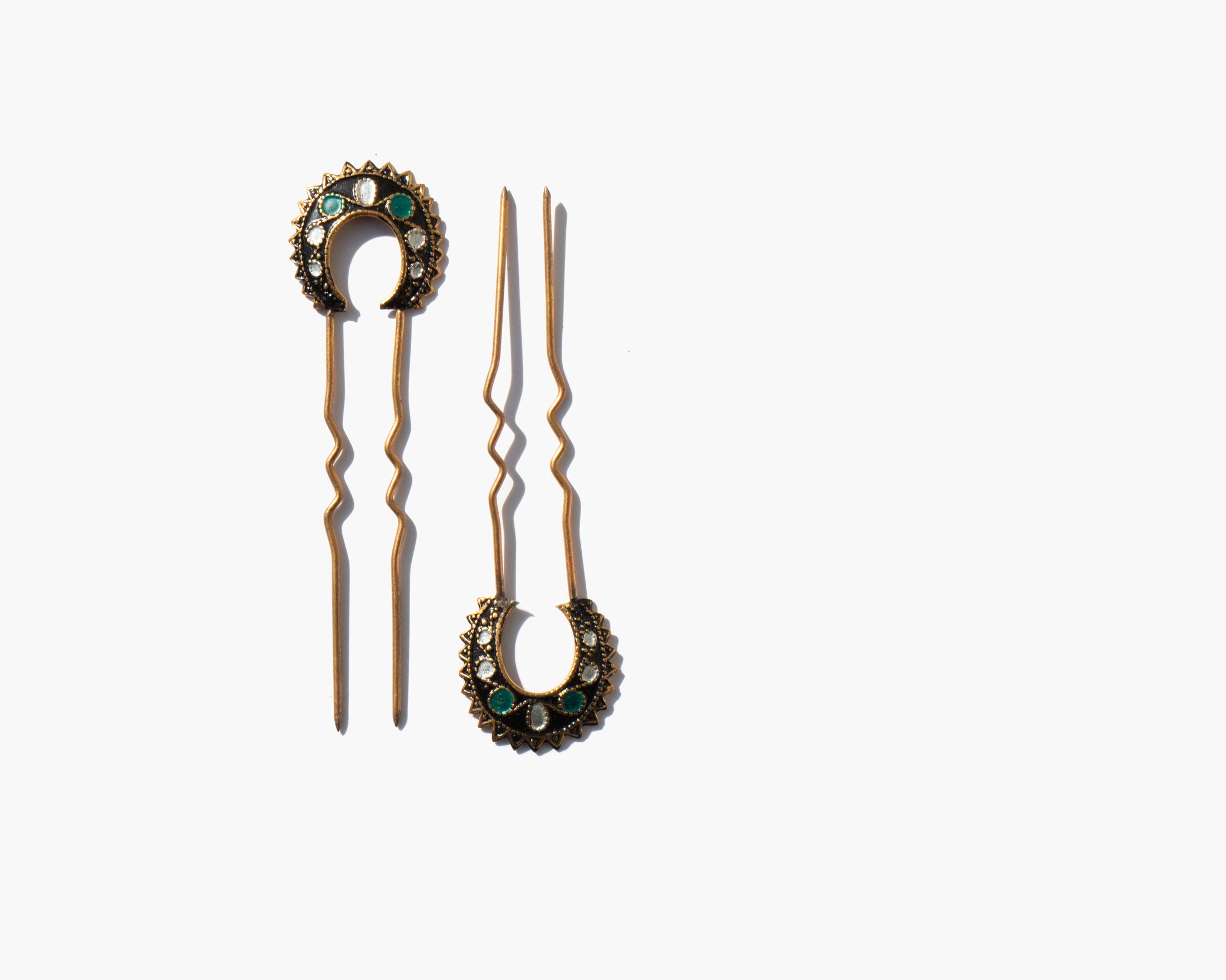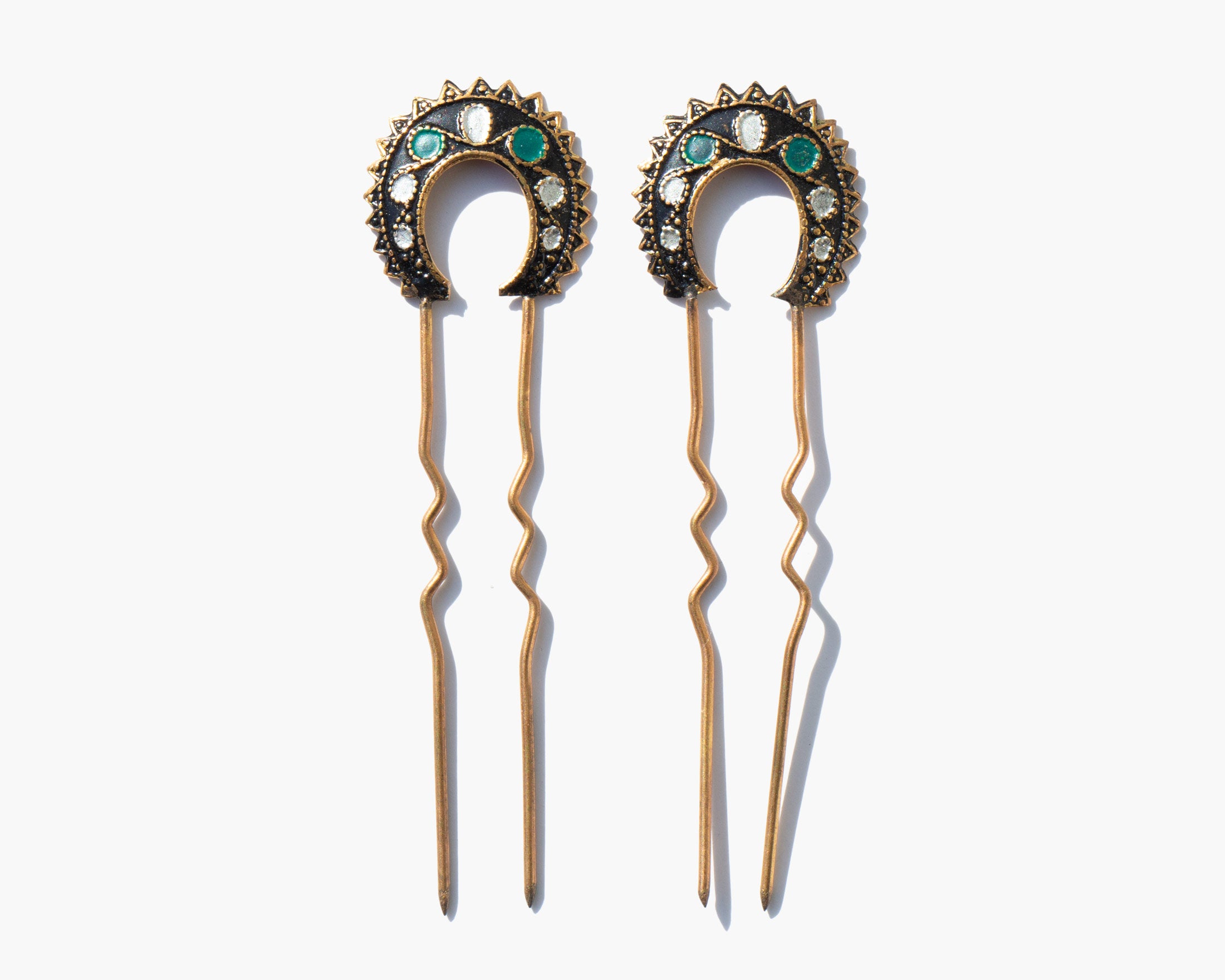Pair of antique Damascene hand painted horseshoe hairpins.