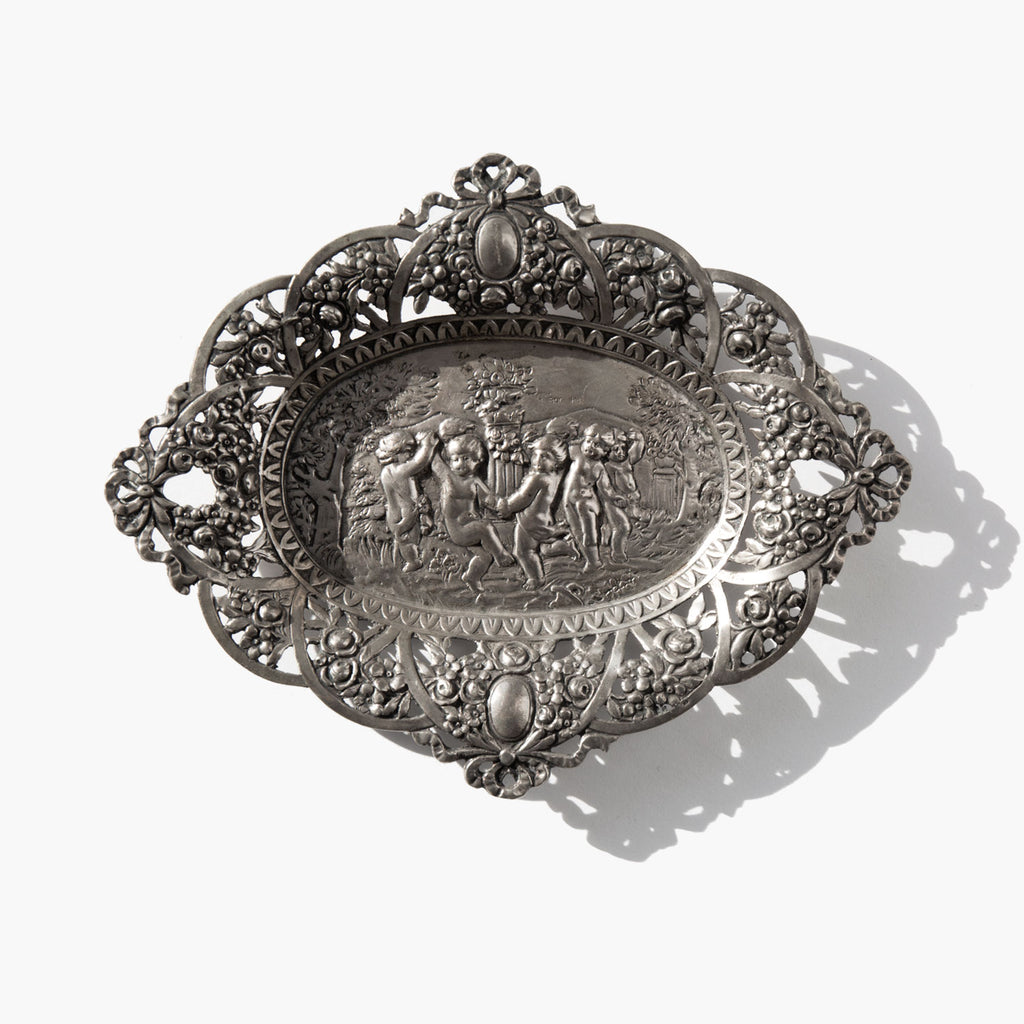 Ornate antique German sterling silver jewelry tray circa 1900. The tray has a floral motif with a centerpiece of cherubs joyfully dancing.