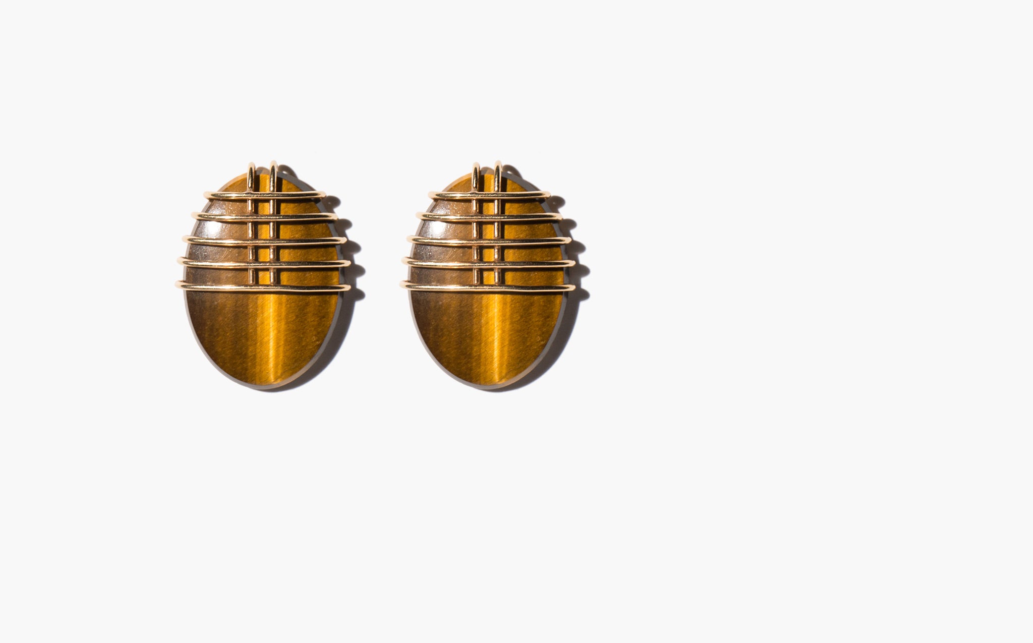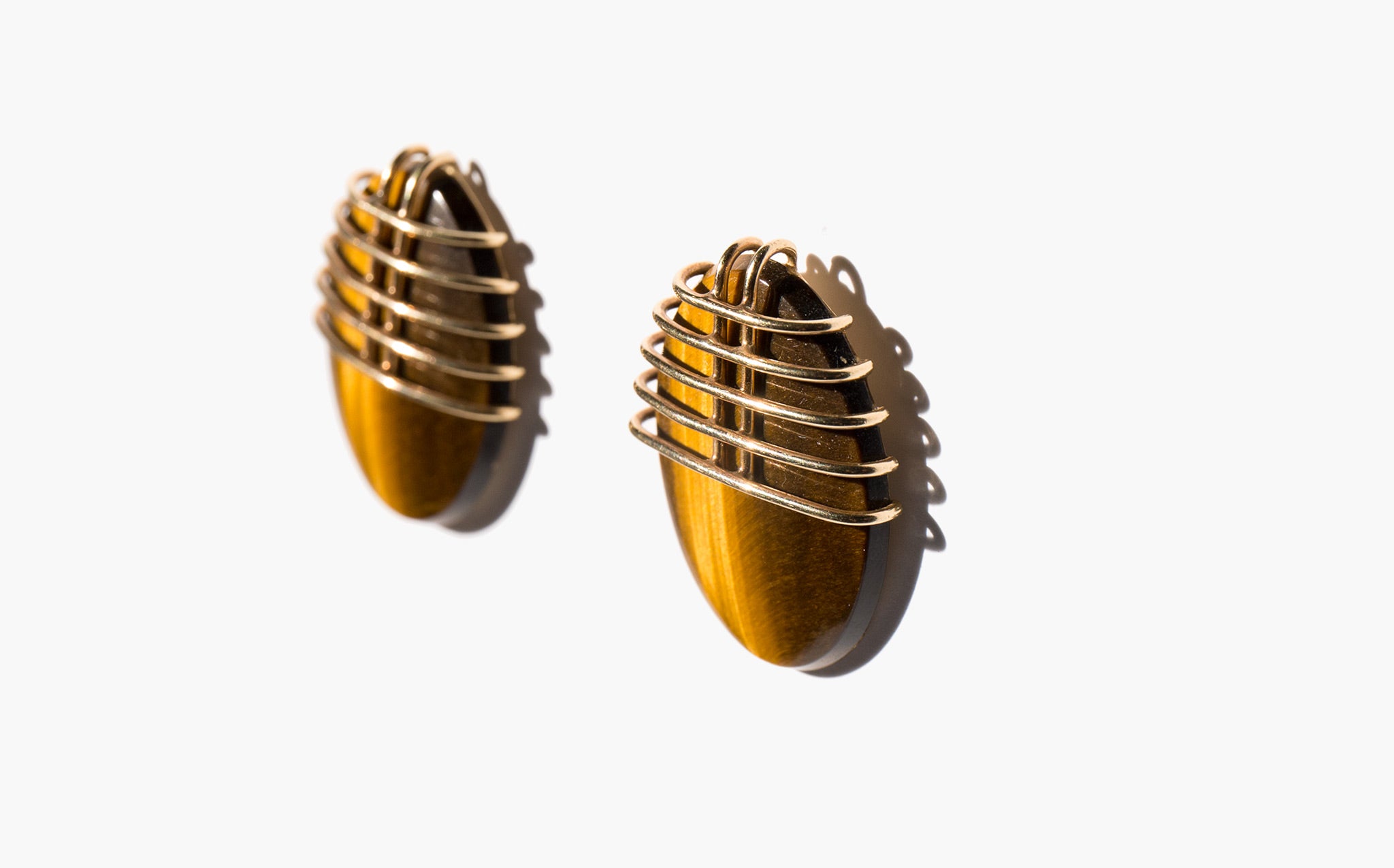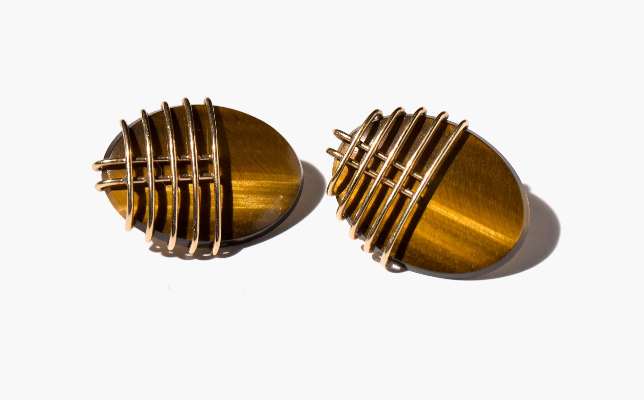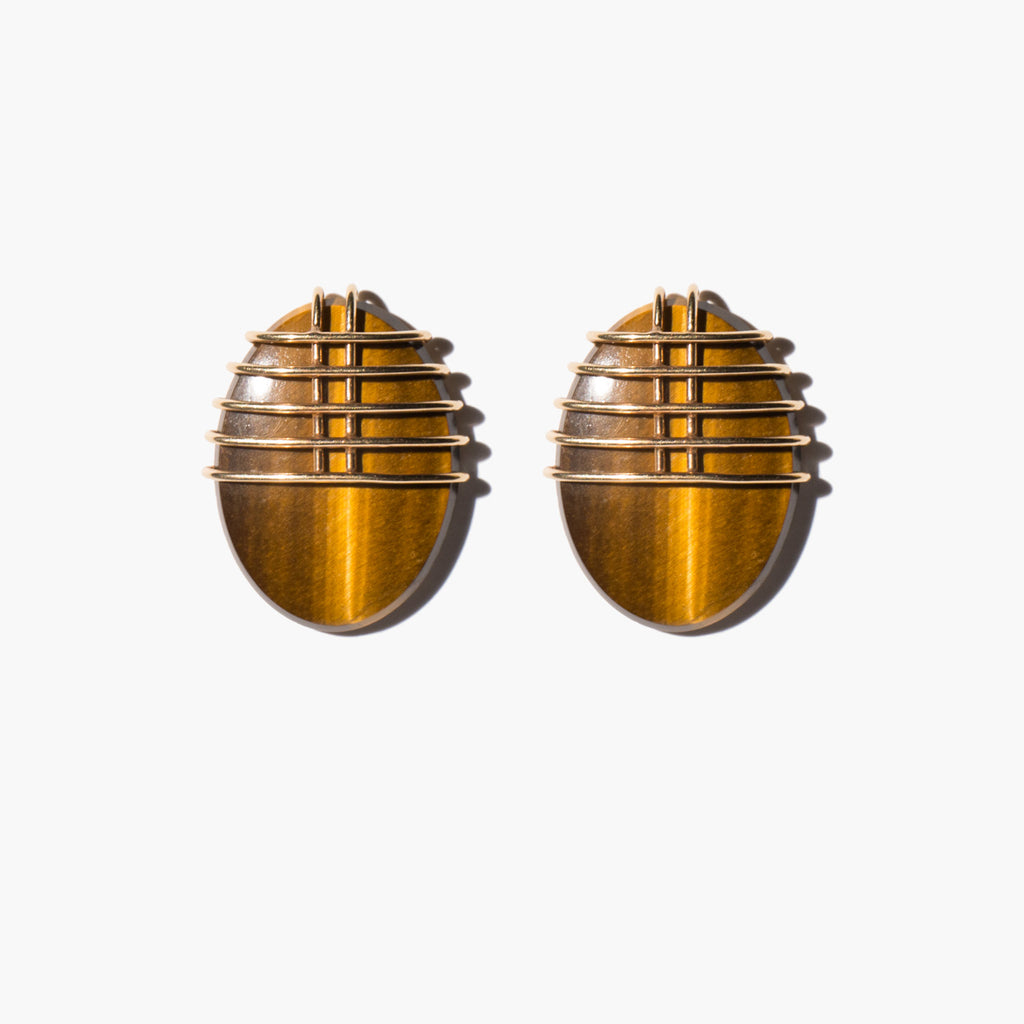 Sculptural and chic earrings of natural tiger's eye set in 14k gold.