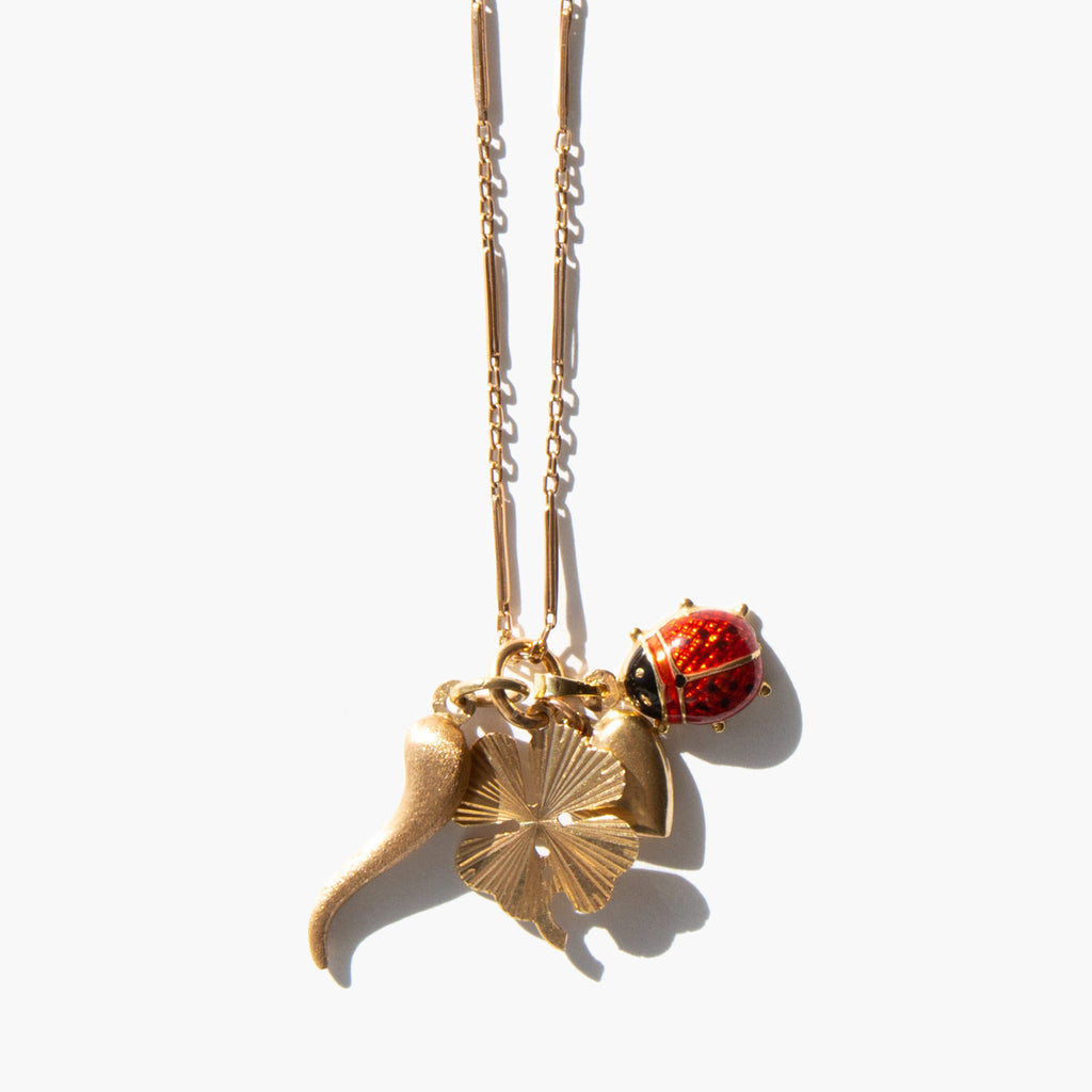Pretty and unusual 14k gold fetter link chain with a cluster of charms for love, luck, and protection. The 14k gold and enamel ladybug is a symbol of positivity because the ladybug is thought to bring happiness, luck, and good fortune. The 14k gold corna, or Italian horn amulet, is used to ward off bad luck and the malocchio or evil eye, one of the most ancient superstitions. The 14k gold four leaf clover is a symbol of good fortune and security. Because of their rarity, four leaf clovers are considered lucky and some believe them to have magical powers of protection.