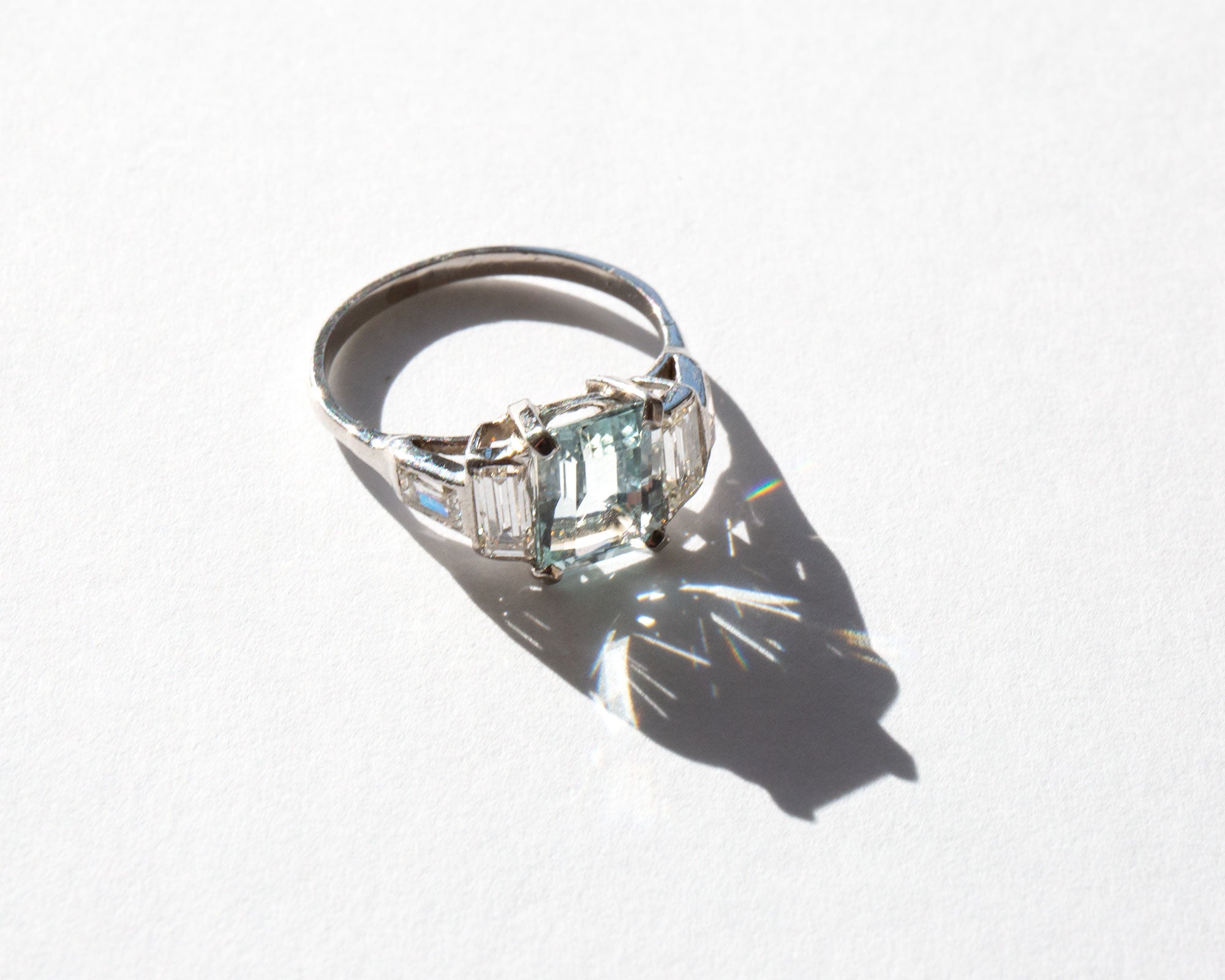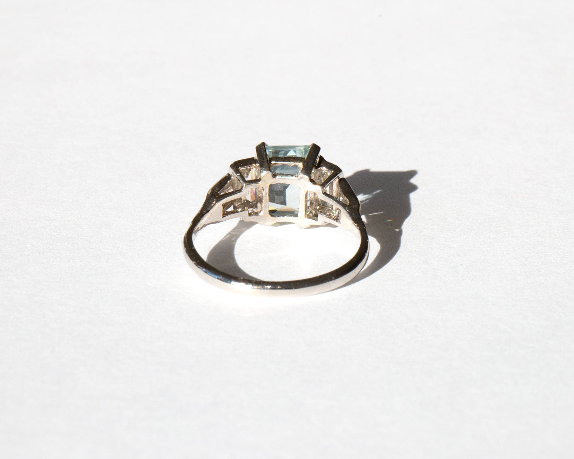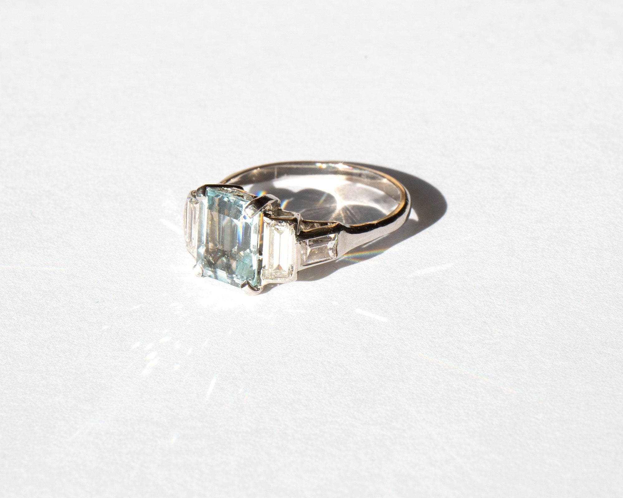 Beautifully set platinum ring with a powder blue aquamarine flanked with 1 carat of diamonds.