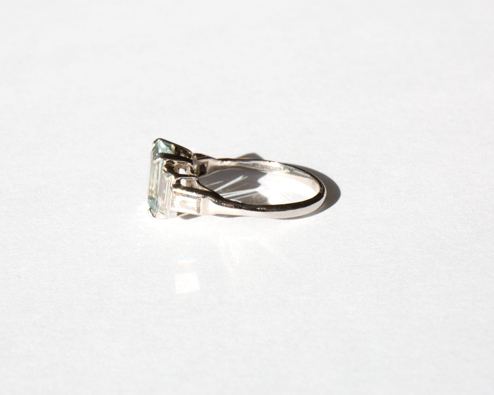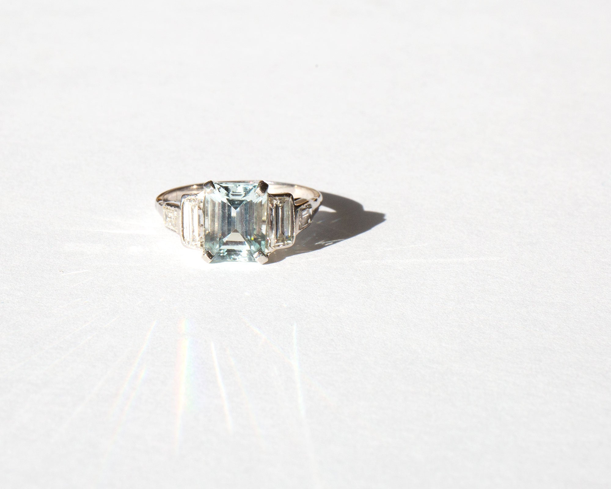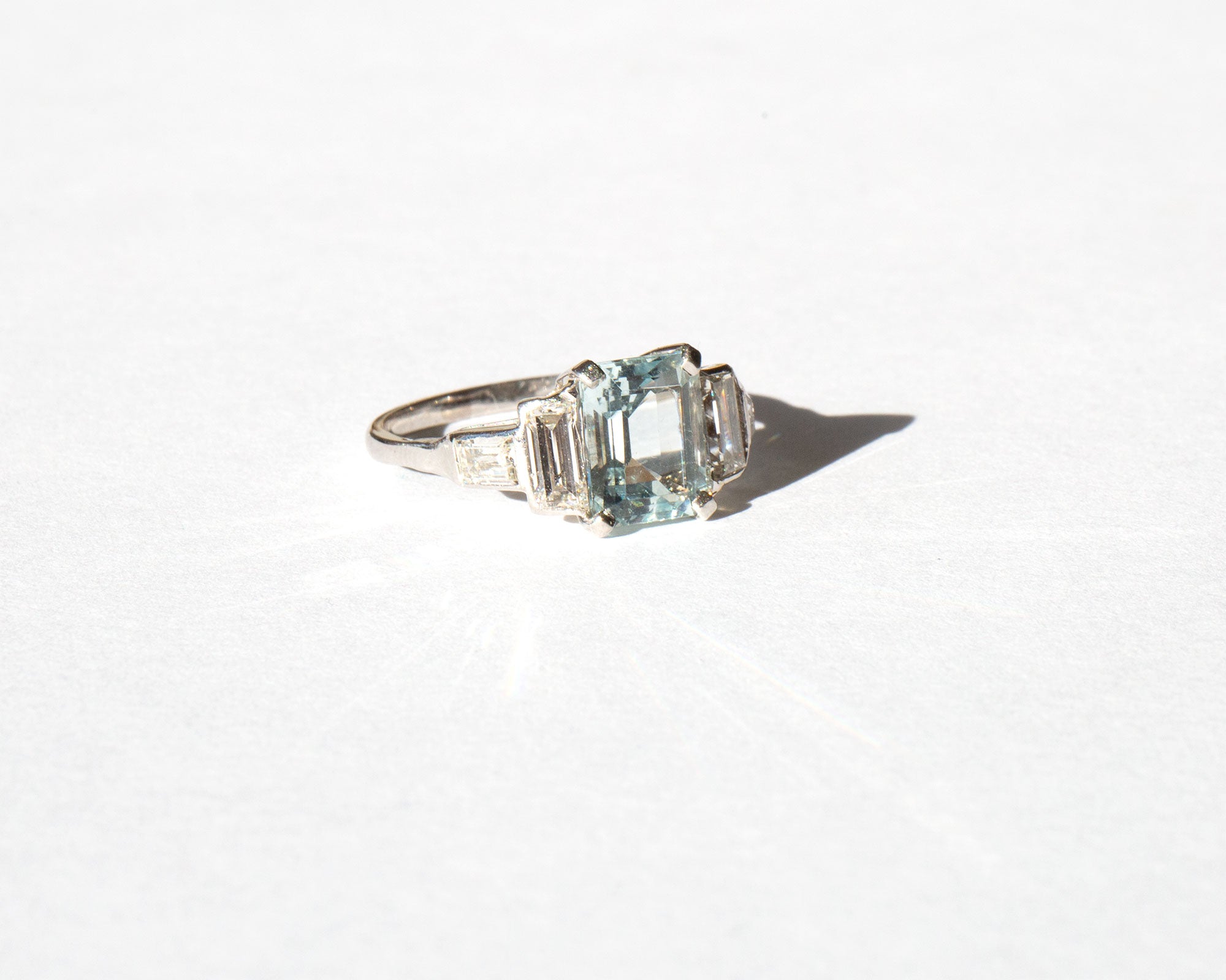 Beautifully set platinum ring with a powder blue aquamarine flanked with 1 carat of diamonds.