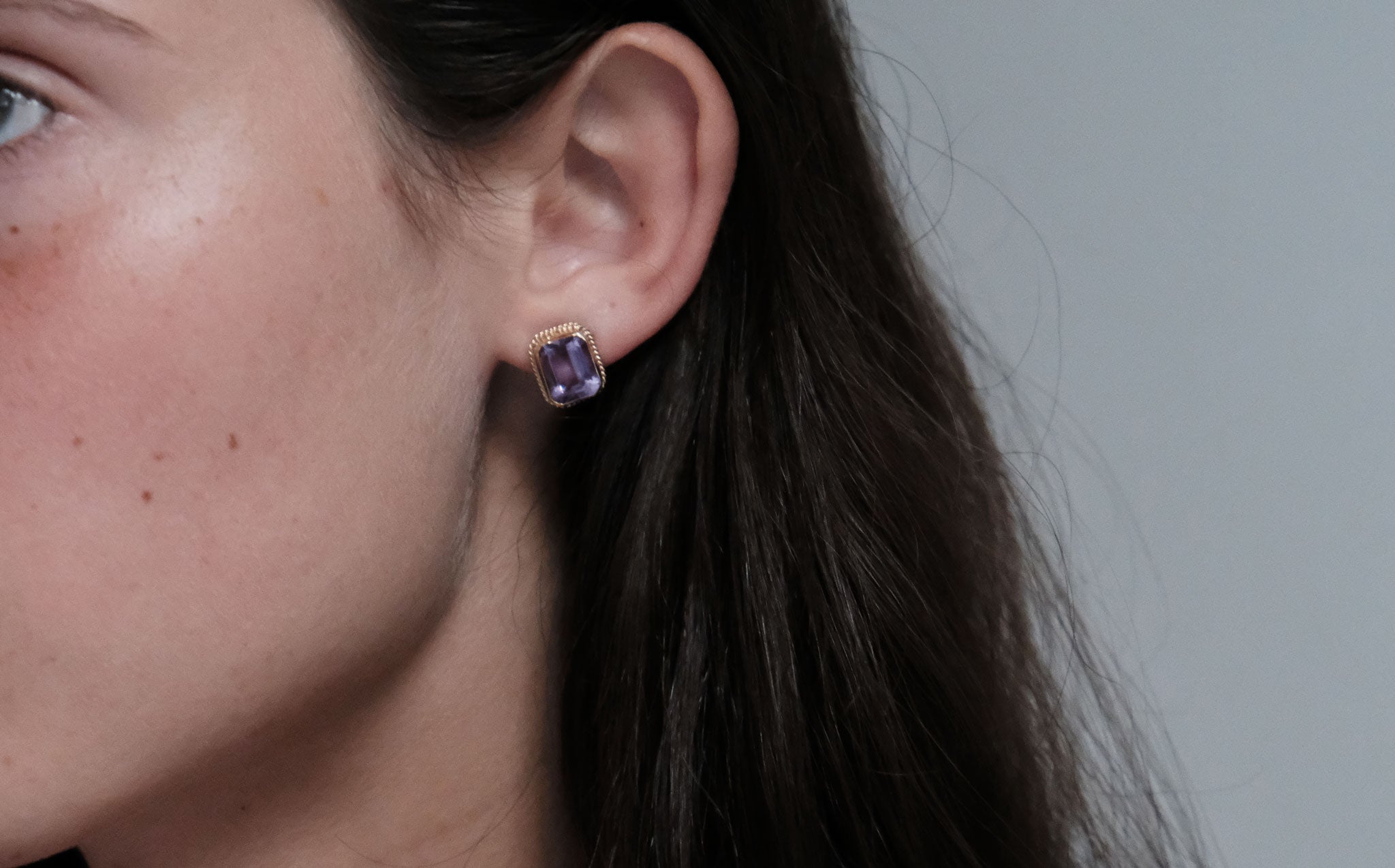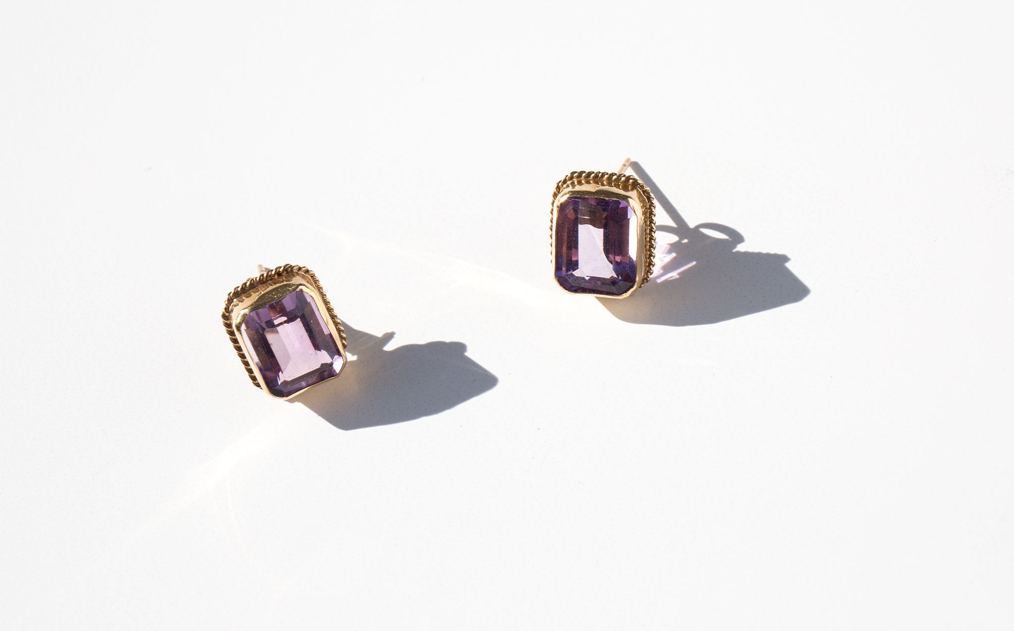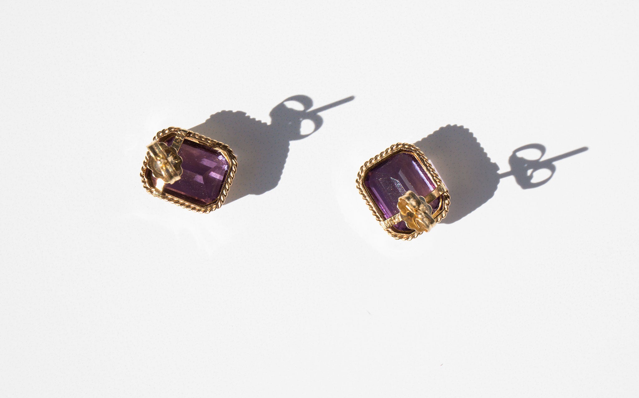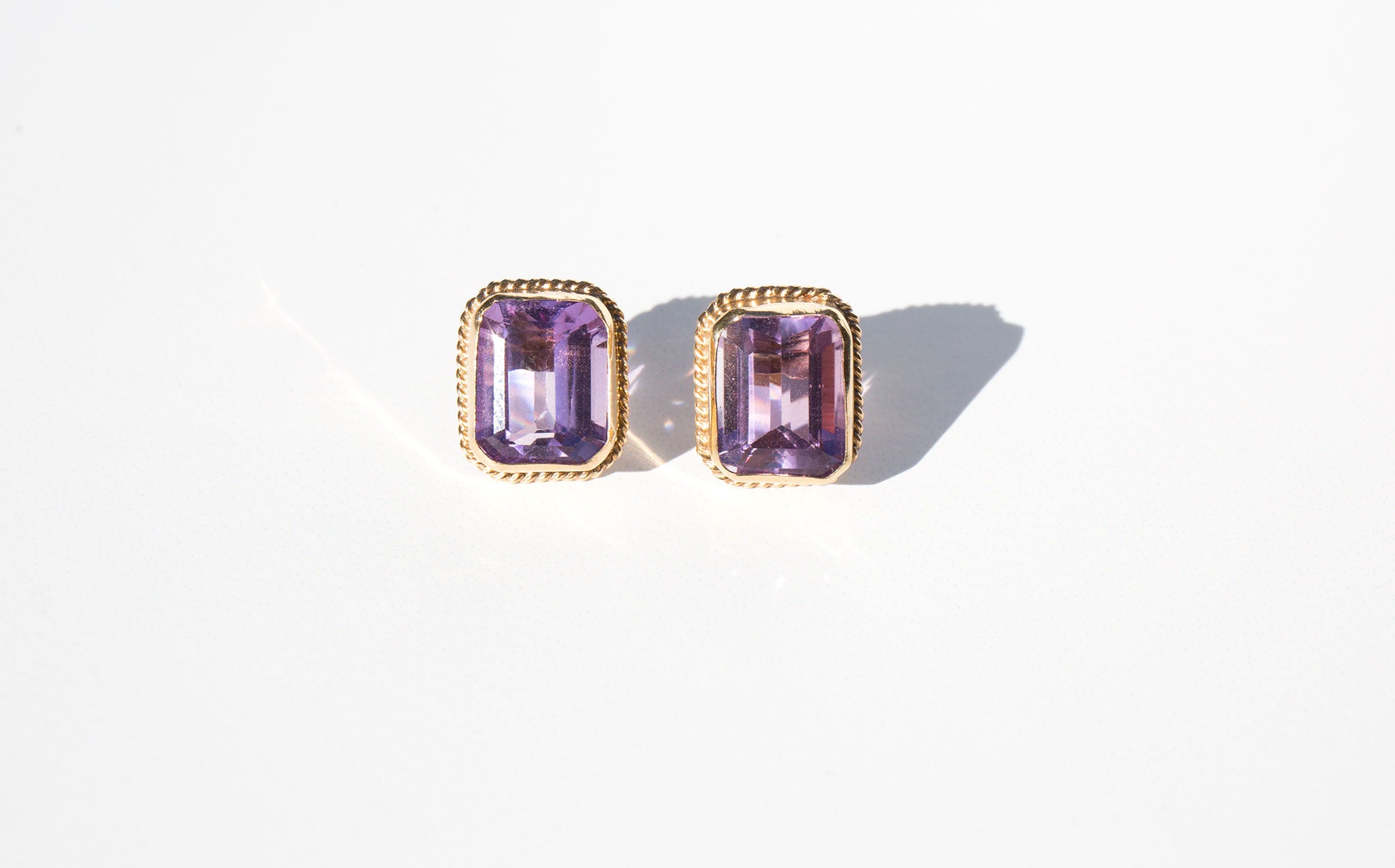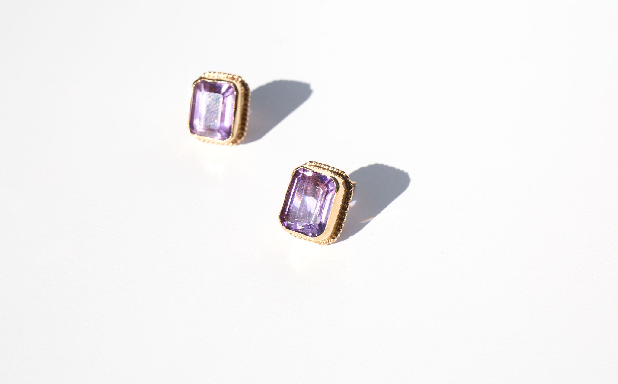 Bright and clear 14k gold and amethyst stud earrings. The amethyst has been worn throughout the centuries as a symbol of purity and spirituality, an amulet of protection against evil, and as a talisman of success and wealth.