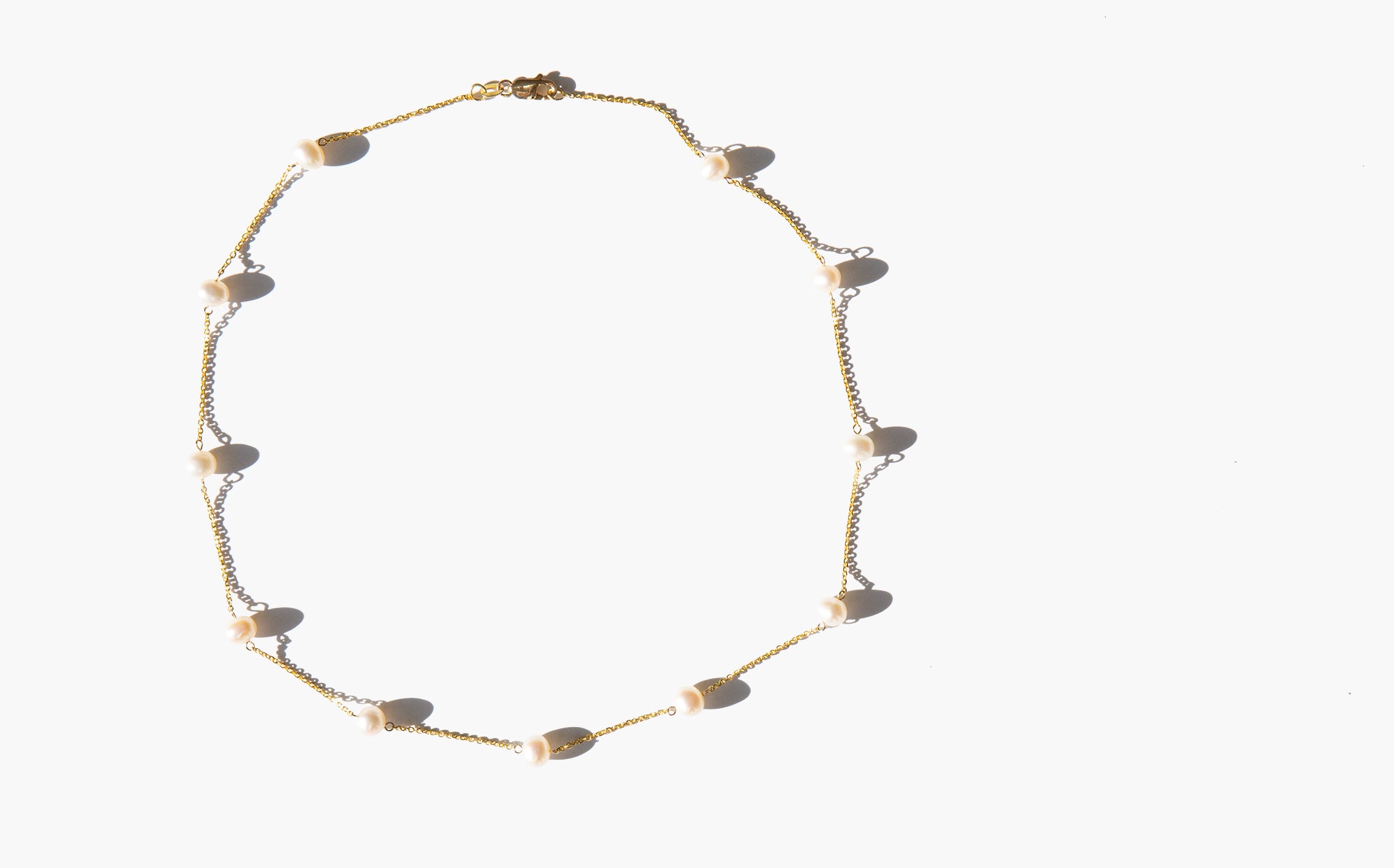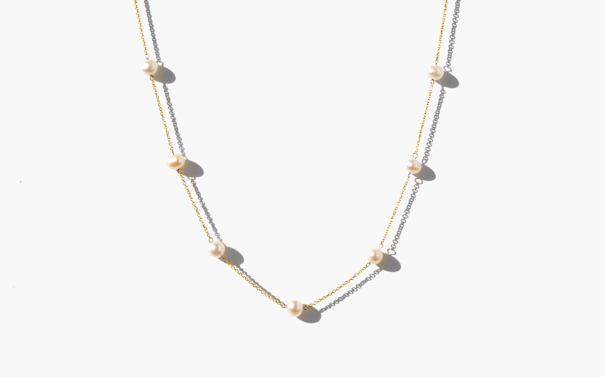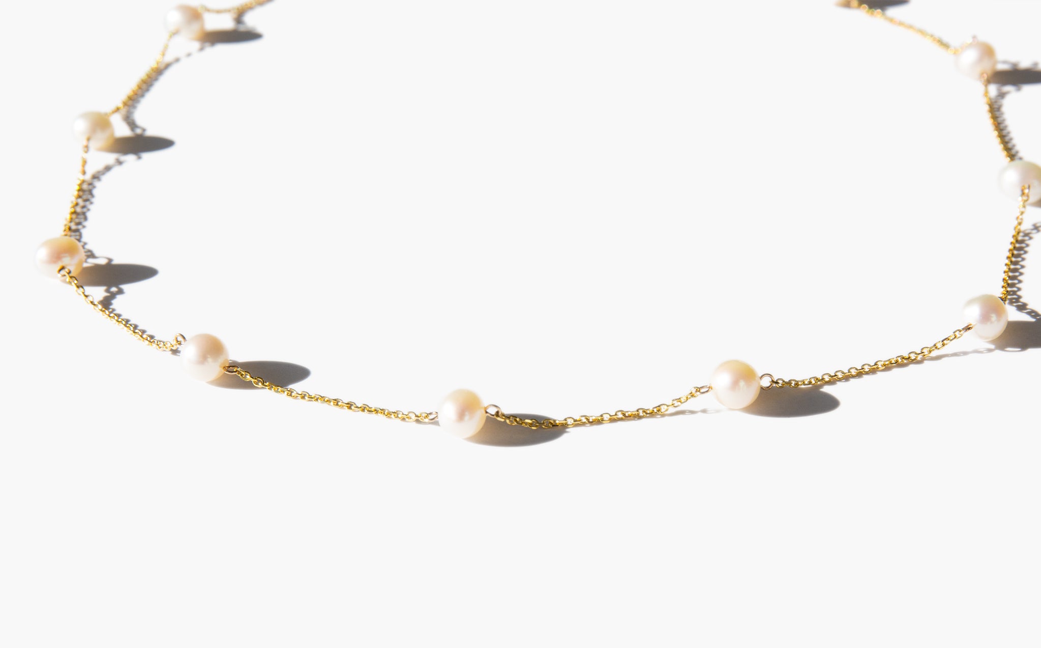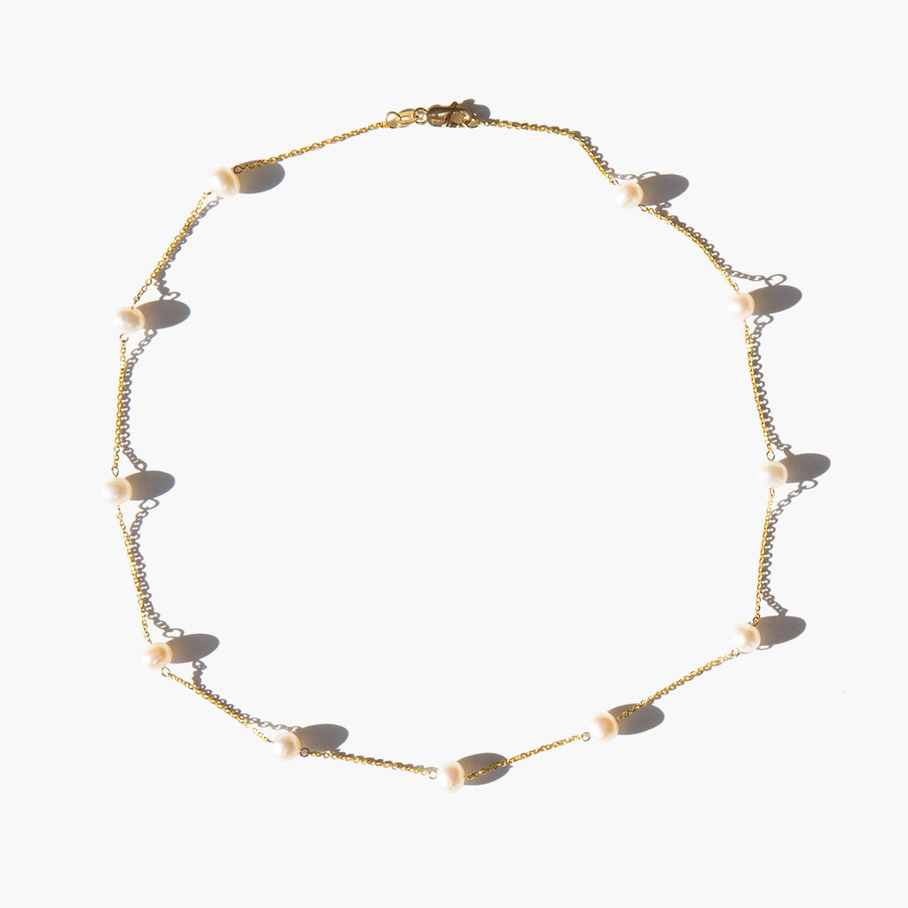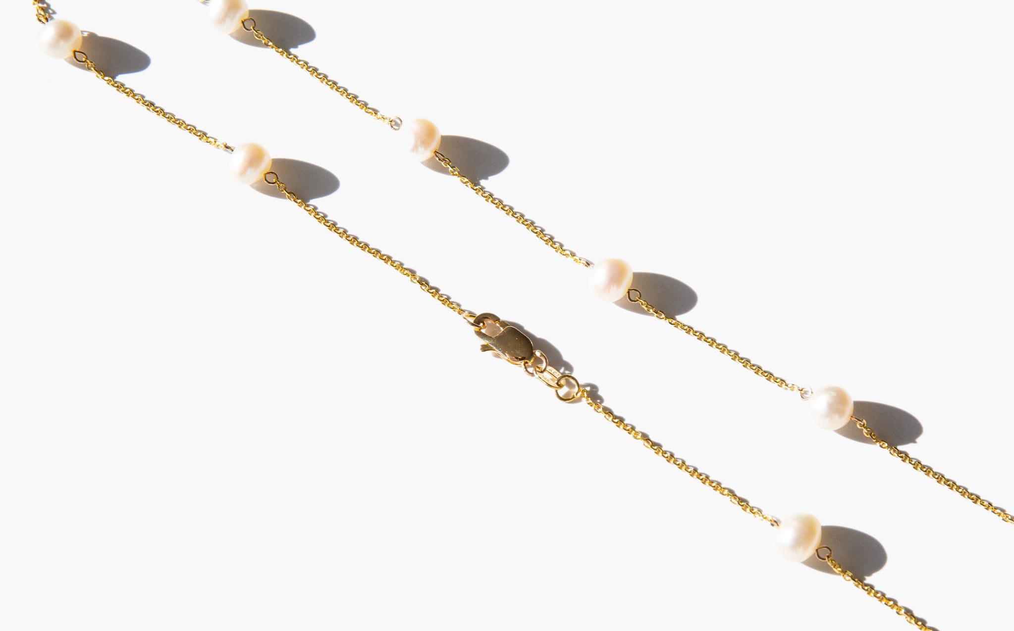 Elegant 14k gold chain with creamy, iridescent pearl accents.