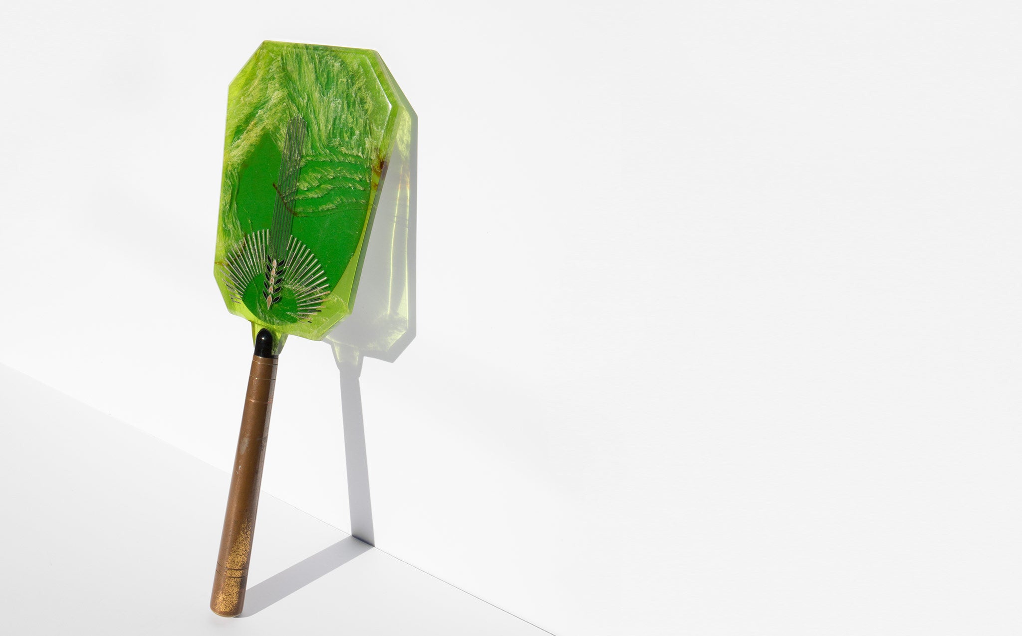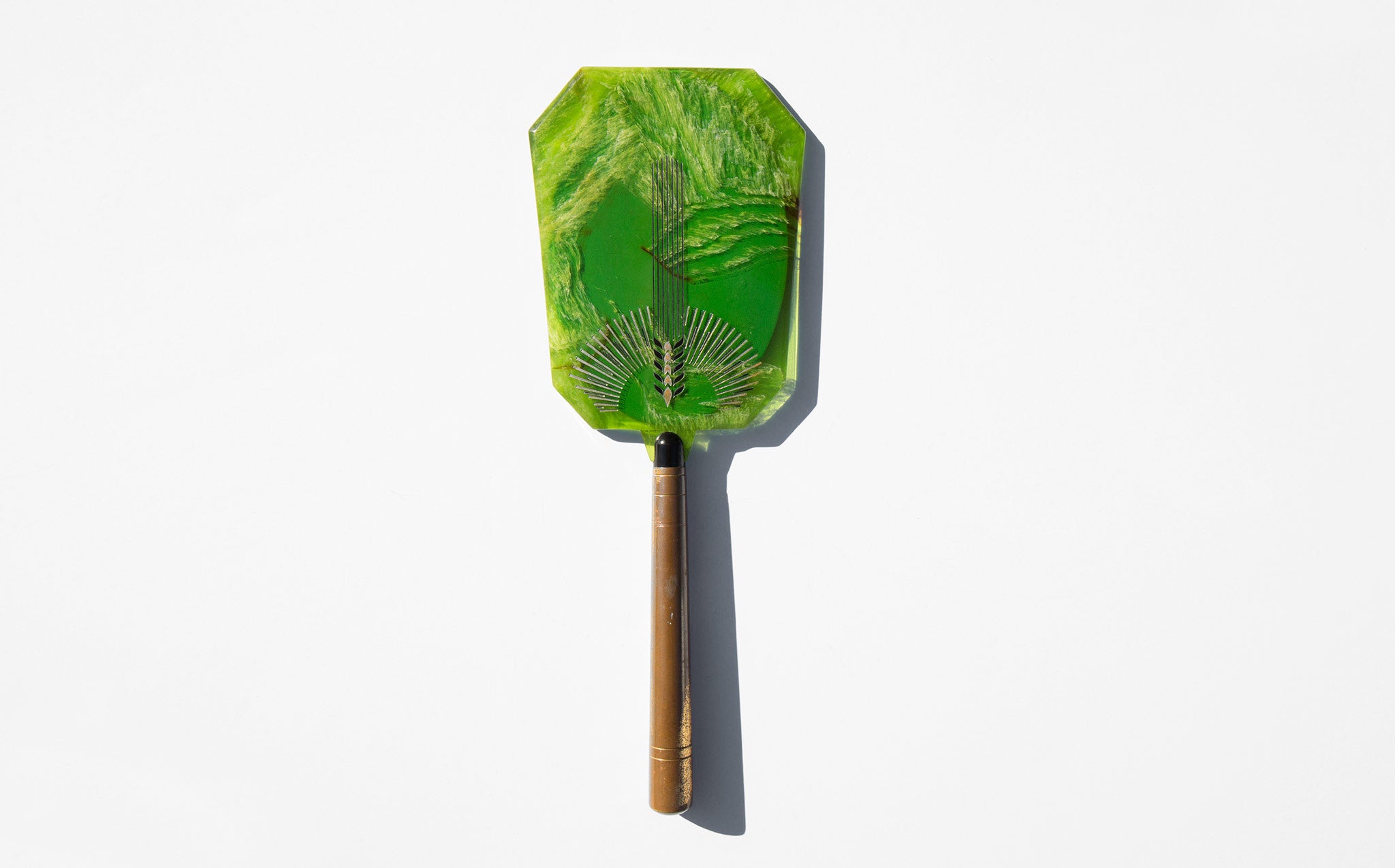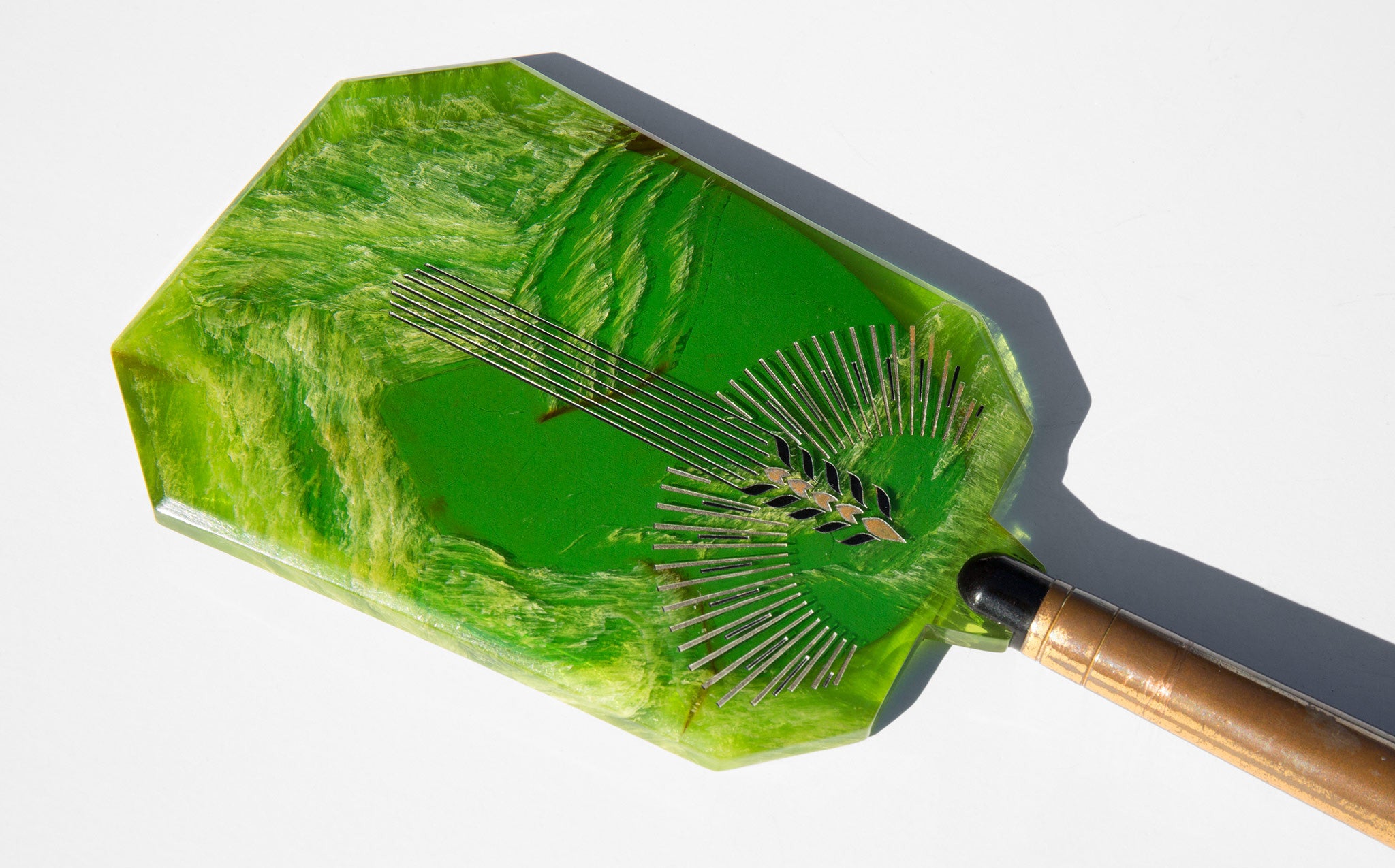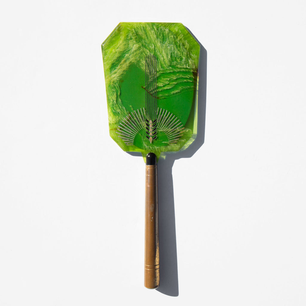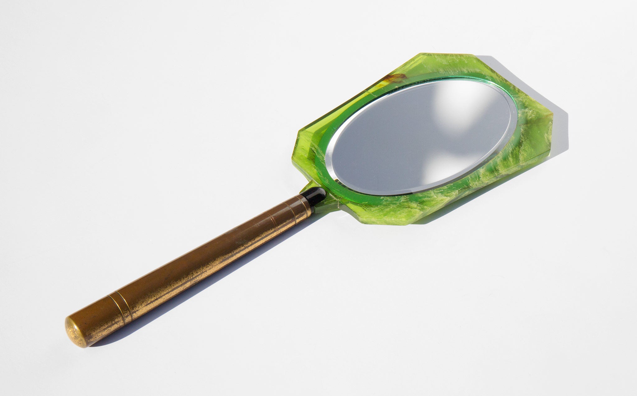 1930s celluloid hand mirror engraved with art deco design. Marbelized lime green celluloid top with inset, beveled edge mirror and brass handle.