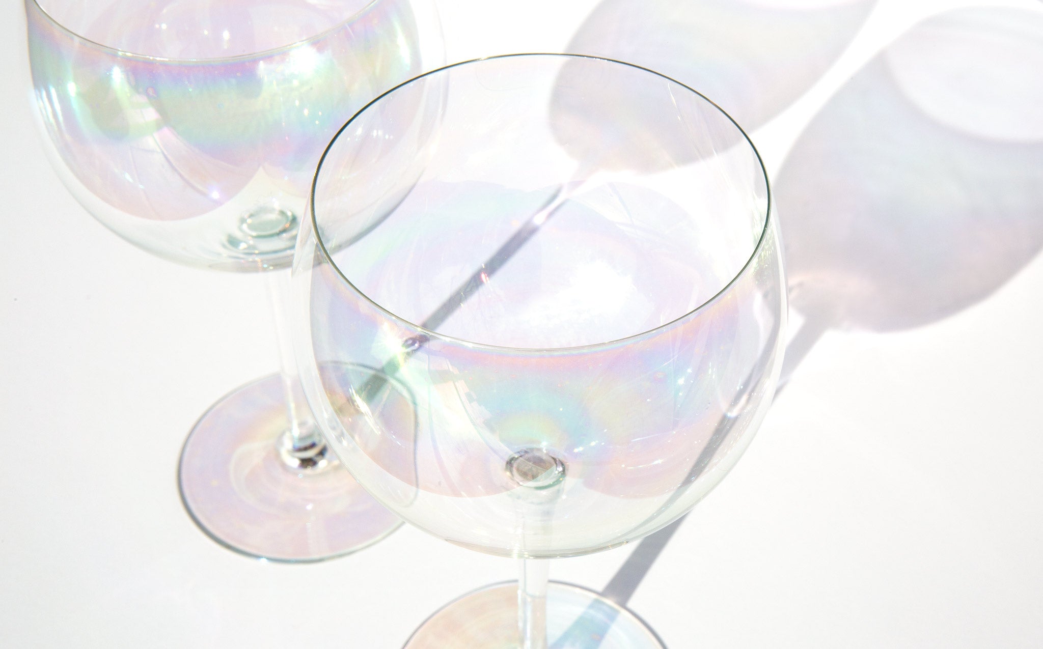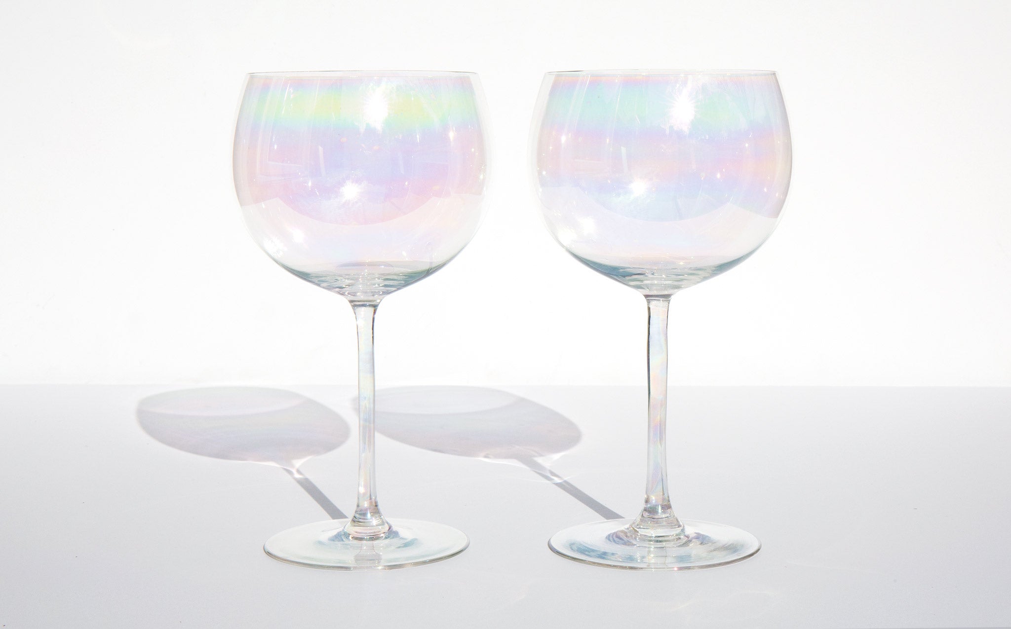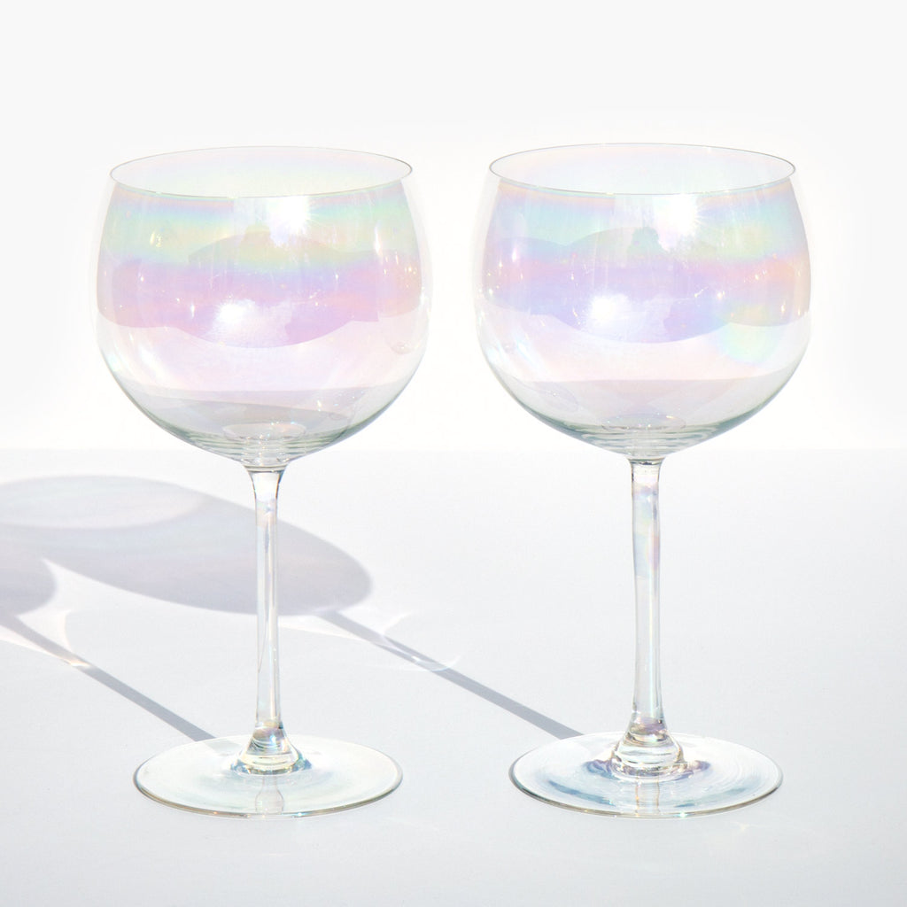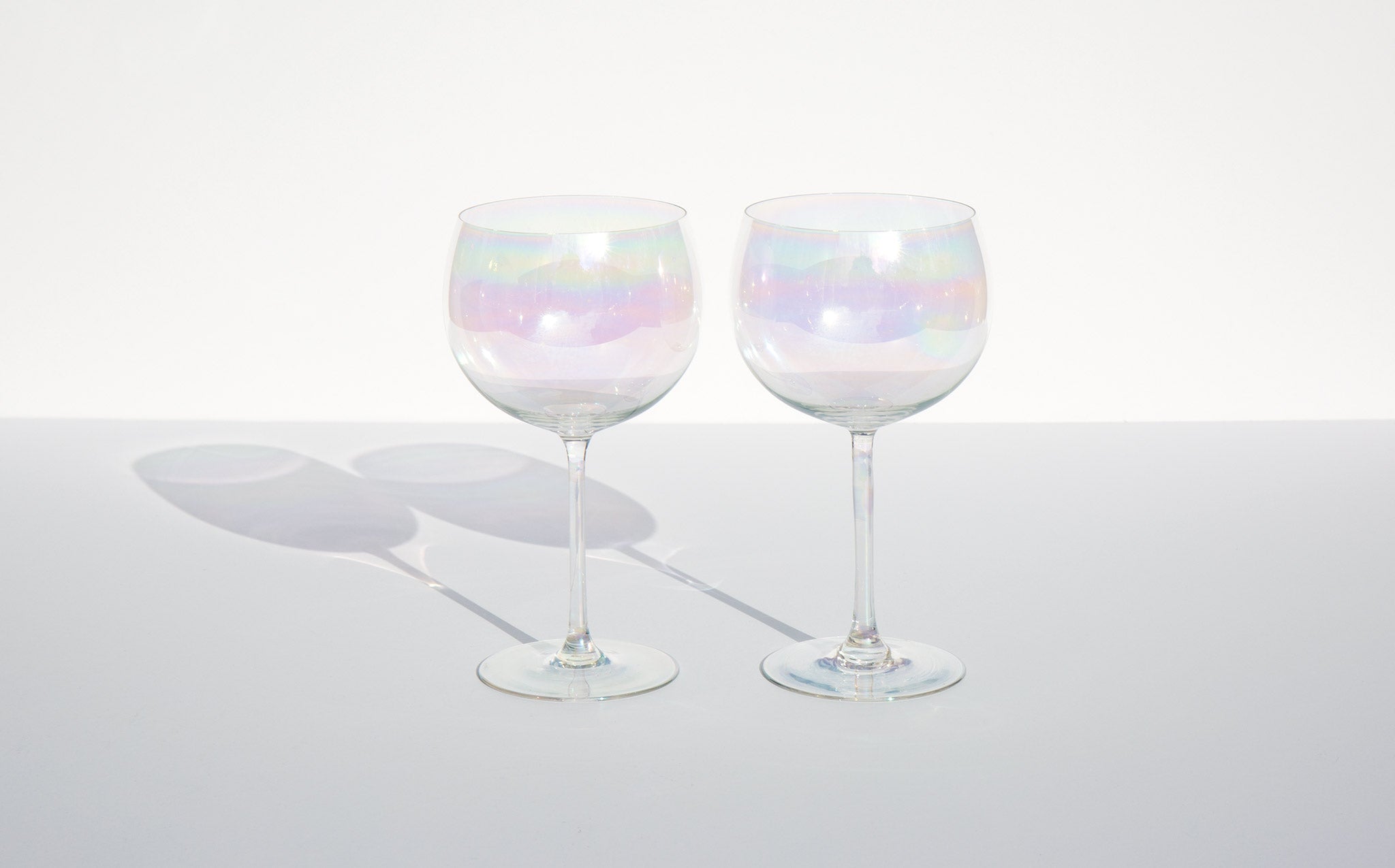 Dorothy Thorpe mother of pearl hued iridescent wine glasses. Set of 2.