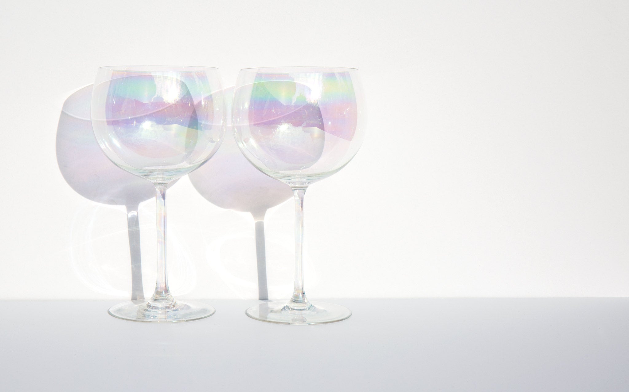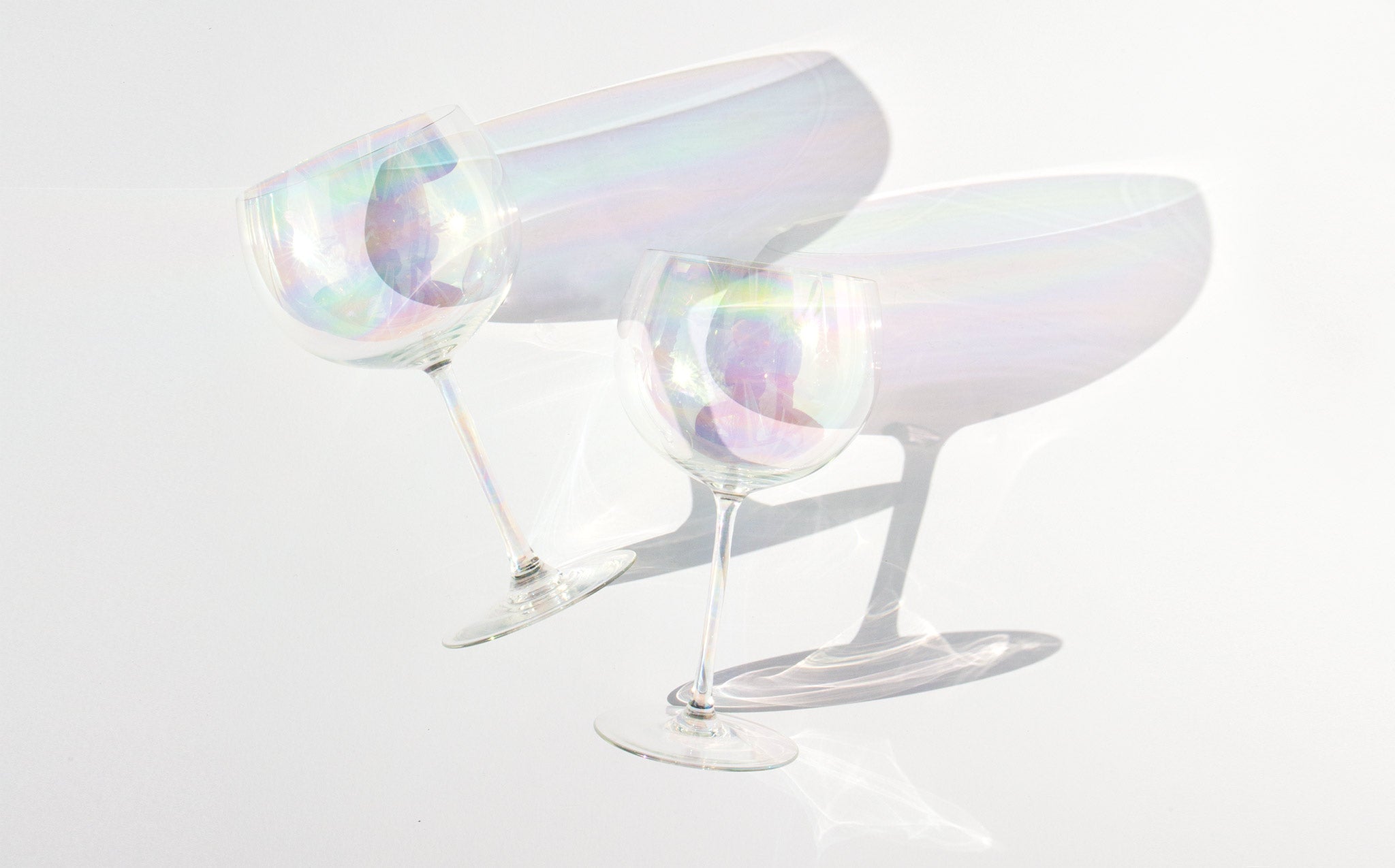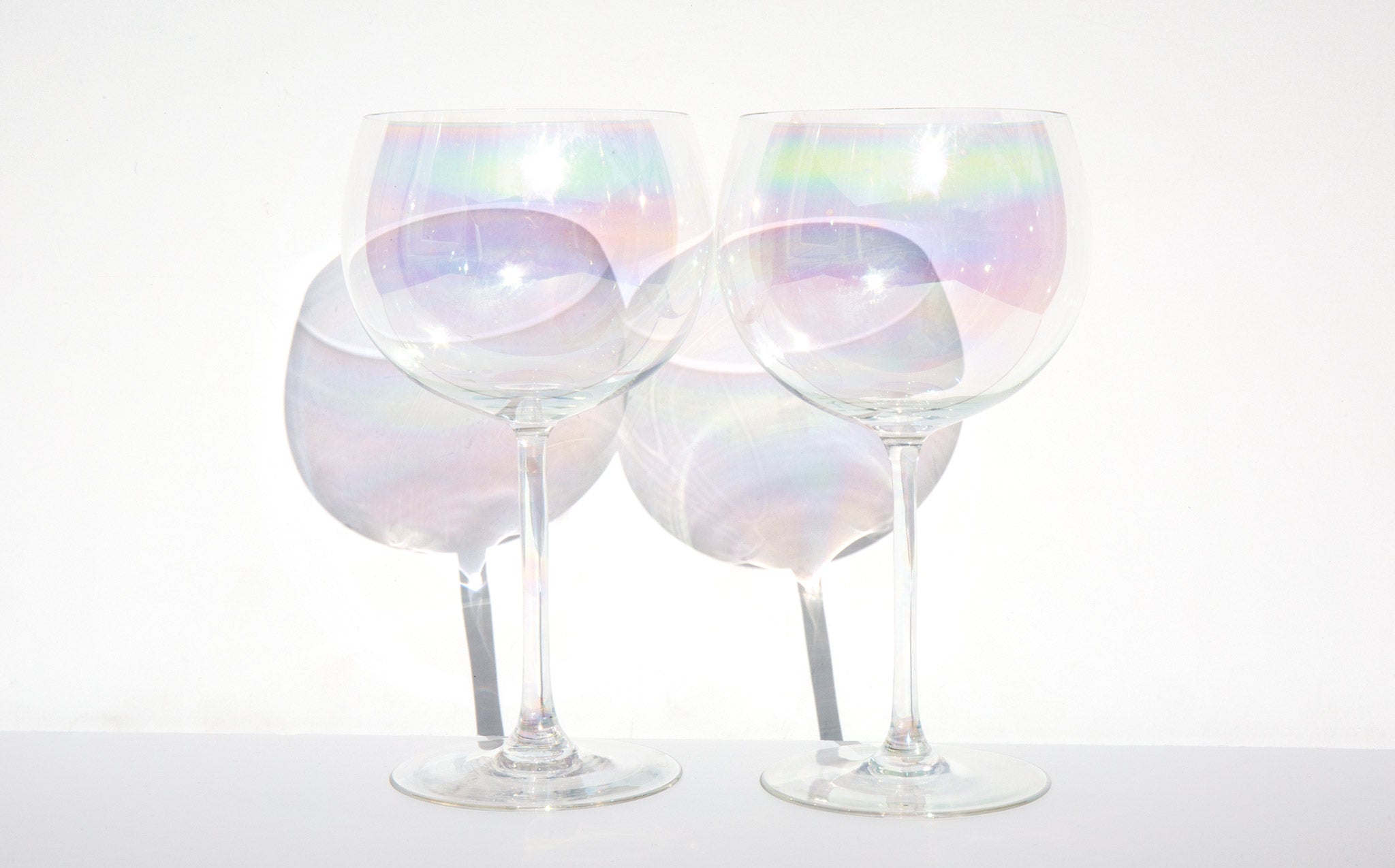 Dorothy Thorpe mother of pearl hued iridescent wine glasses. Set of 2.