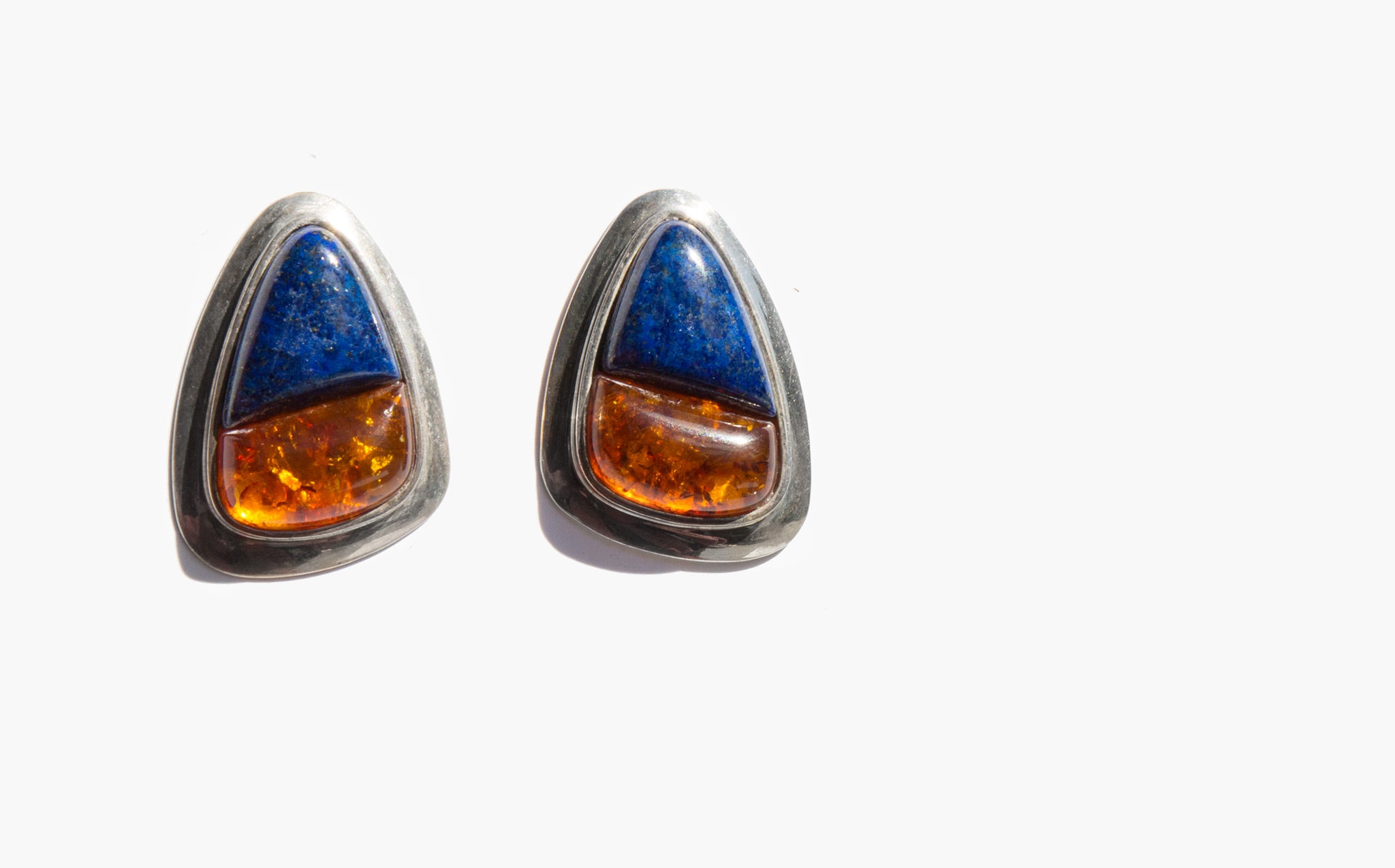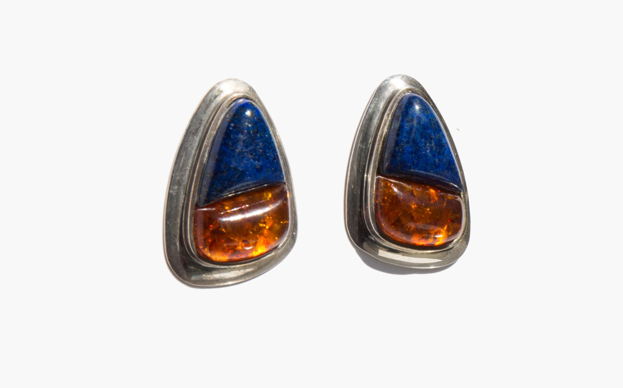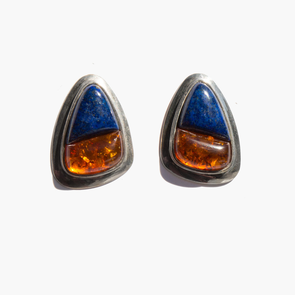 Sculptural sterling silver earrings with large inset amber and lapis stones.