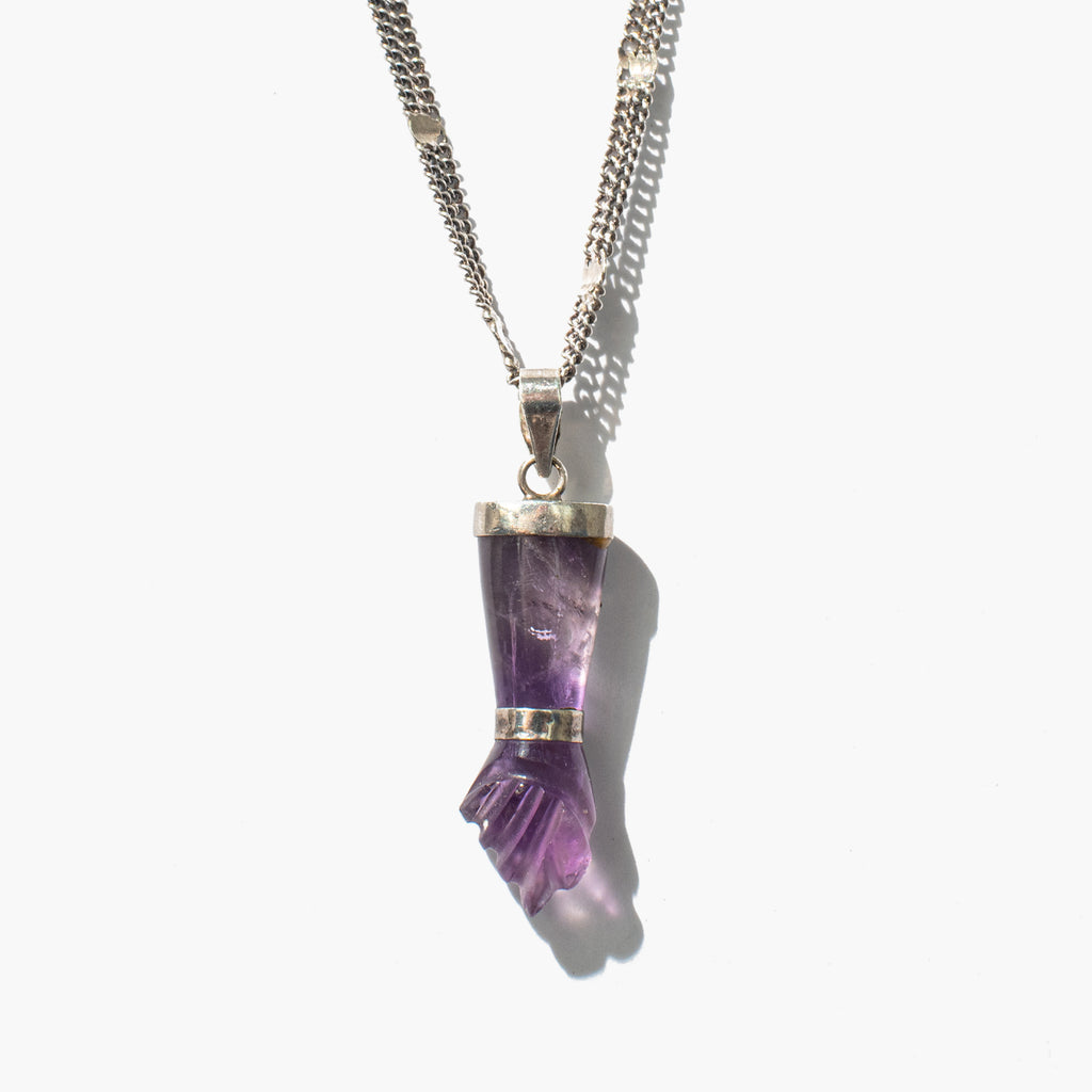 Spectral lavender amethyst figa charm trimmed in sterling silver and strung on an unusual multi-layer sterling silver chain. The mano figa, literally translated as "fig hand" is known as a magically protective talisman to ward off evil curses and bad energy. Amethyst is a gemstone known throughout the centuries as a symbol of purity and spirituality, an amulet of protection against evil, and as a talisman of success and wealth. This dreamy, translucent stone is also thought to be grounding, stress relieving, and helpful to those suffering from bad dreams and night terrors.
