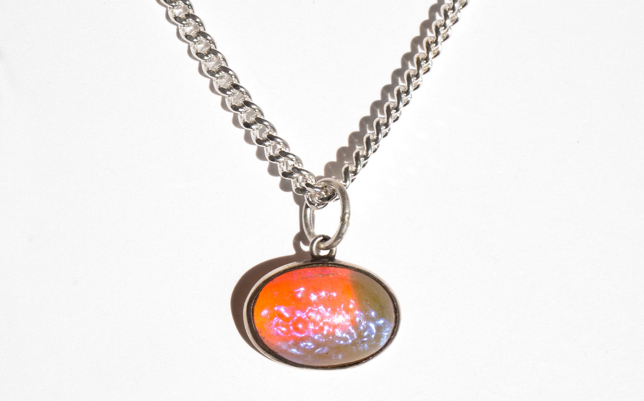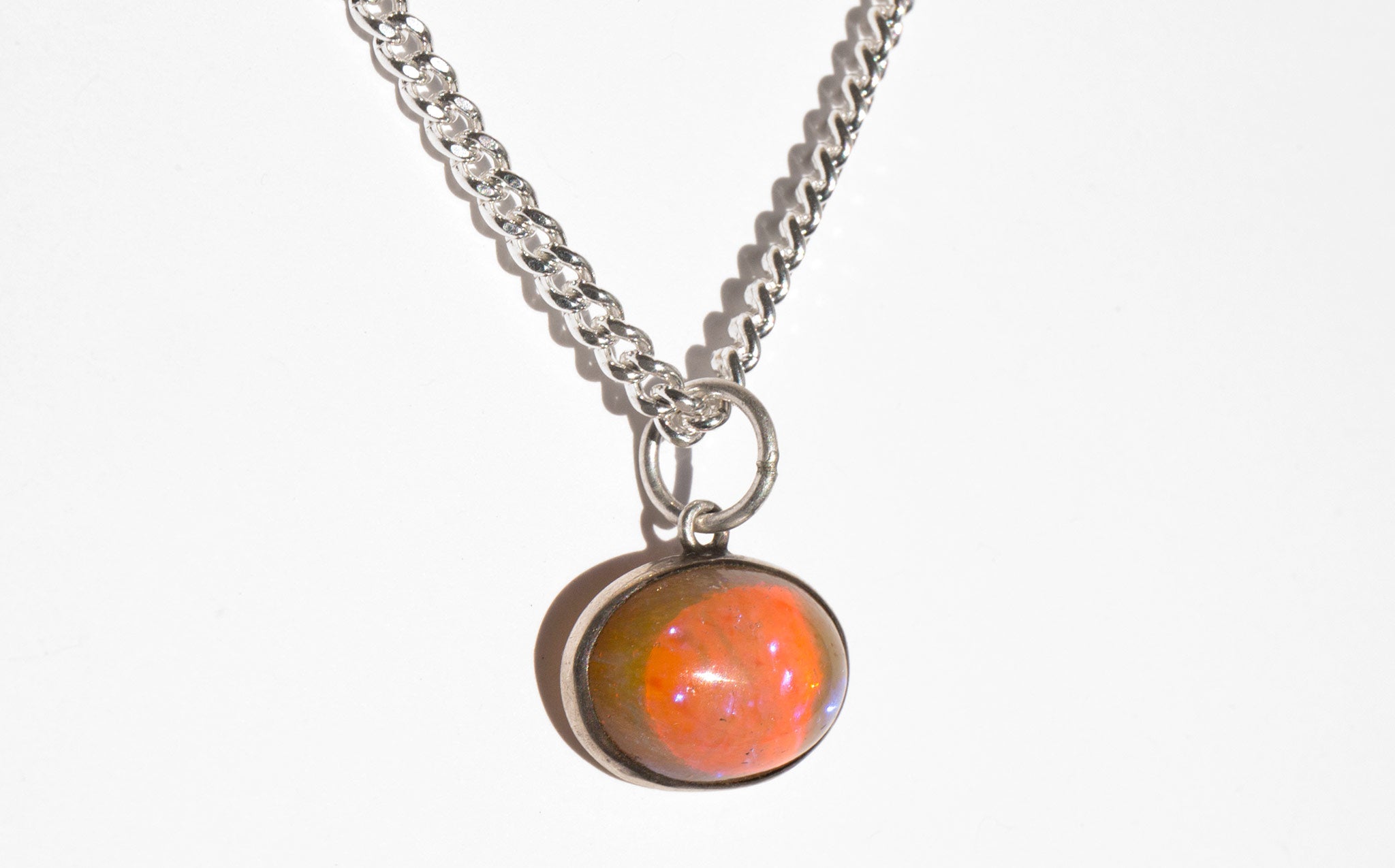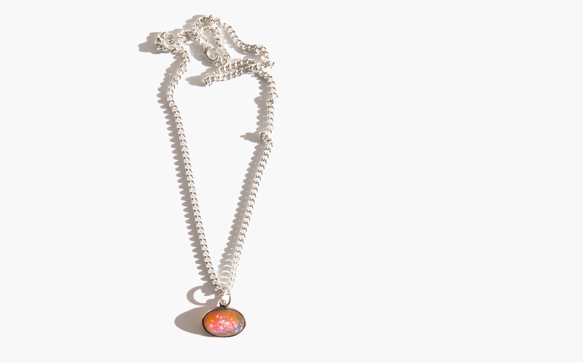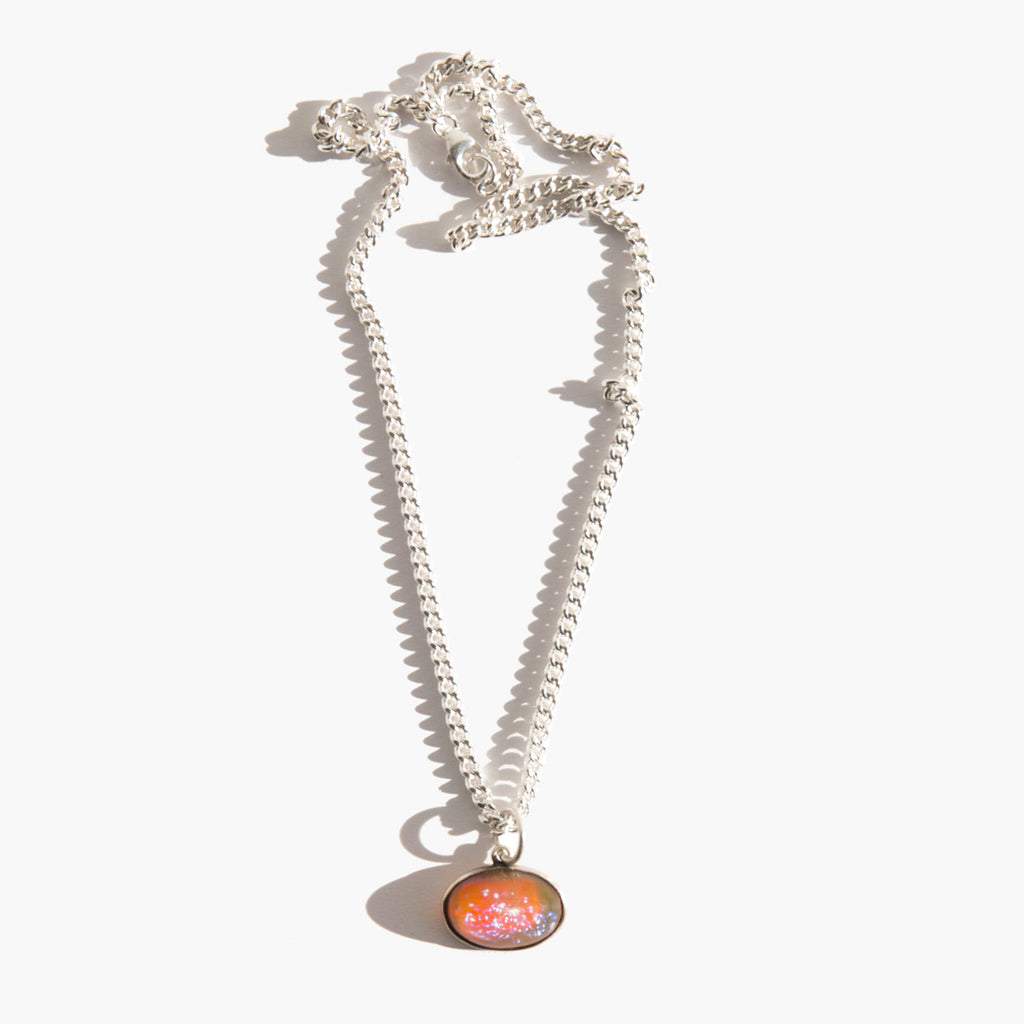 Vintage sherbet toned, iridescent Dragon's Breath pendant on a sterling silver link chain.