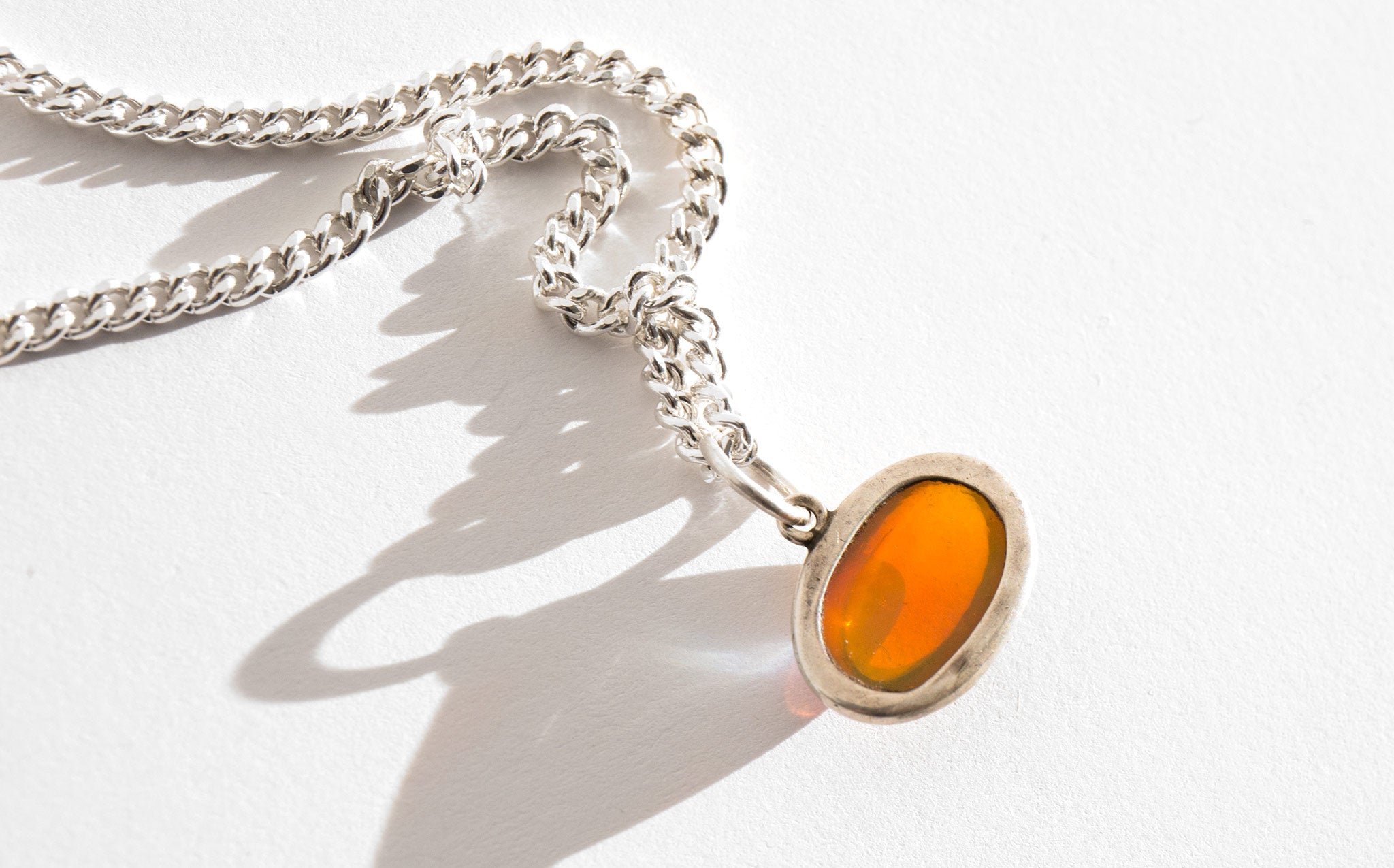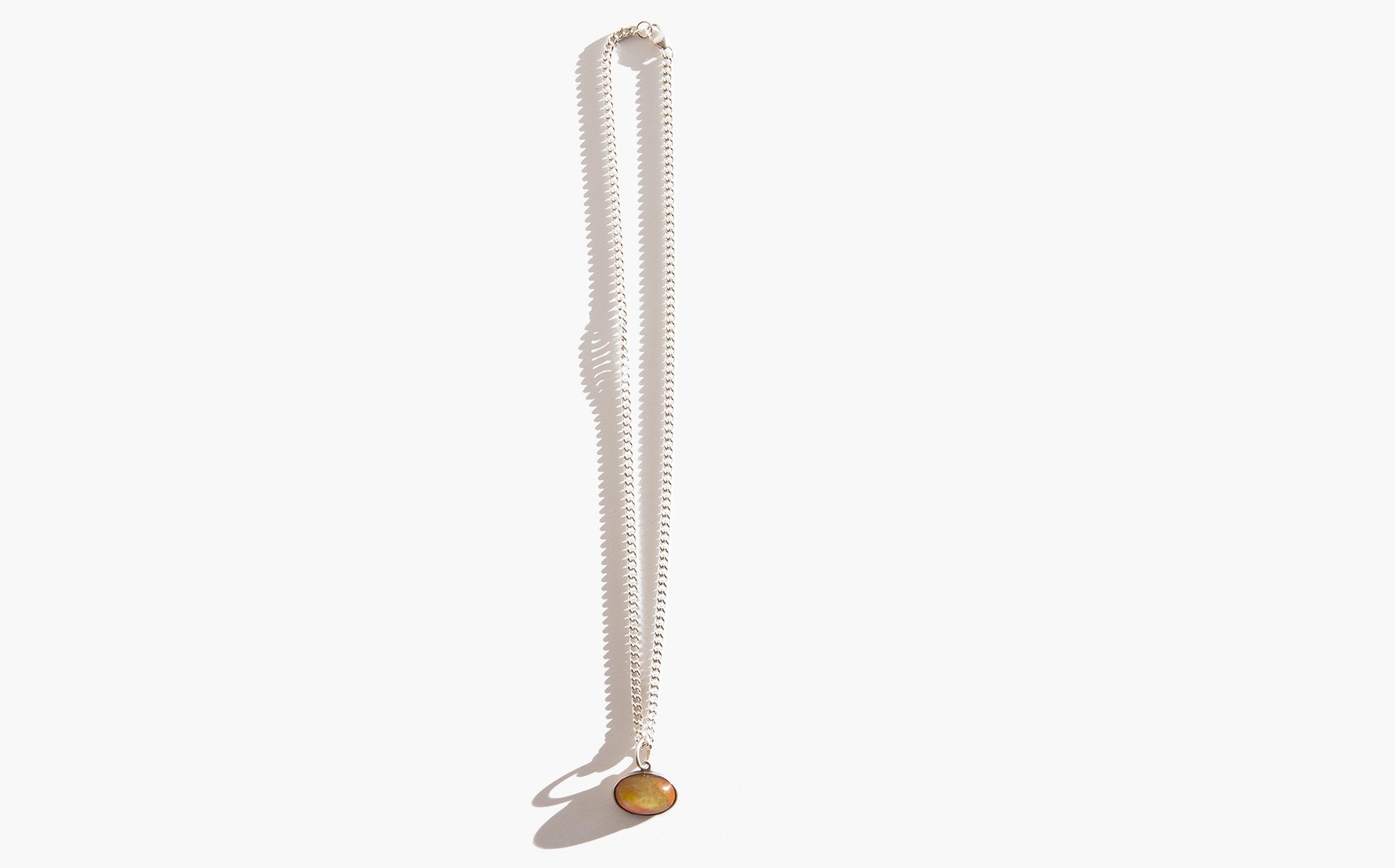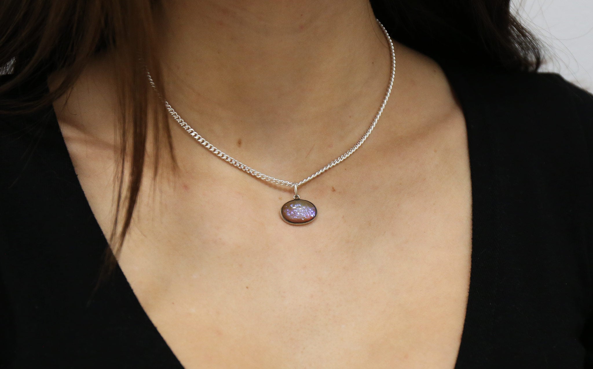 Vintage sherbet toned, iridescent Dragon's Breath pendant on a sterling silver link chain.