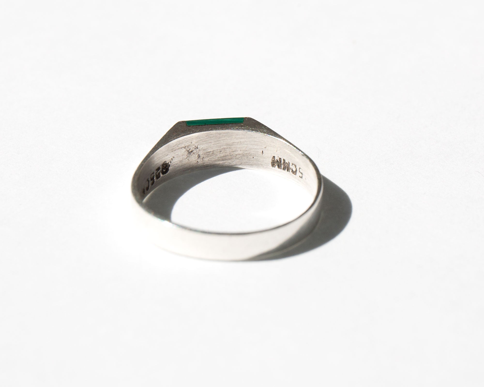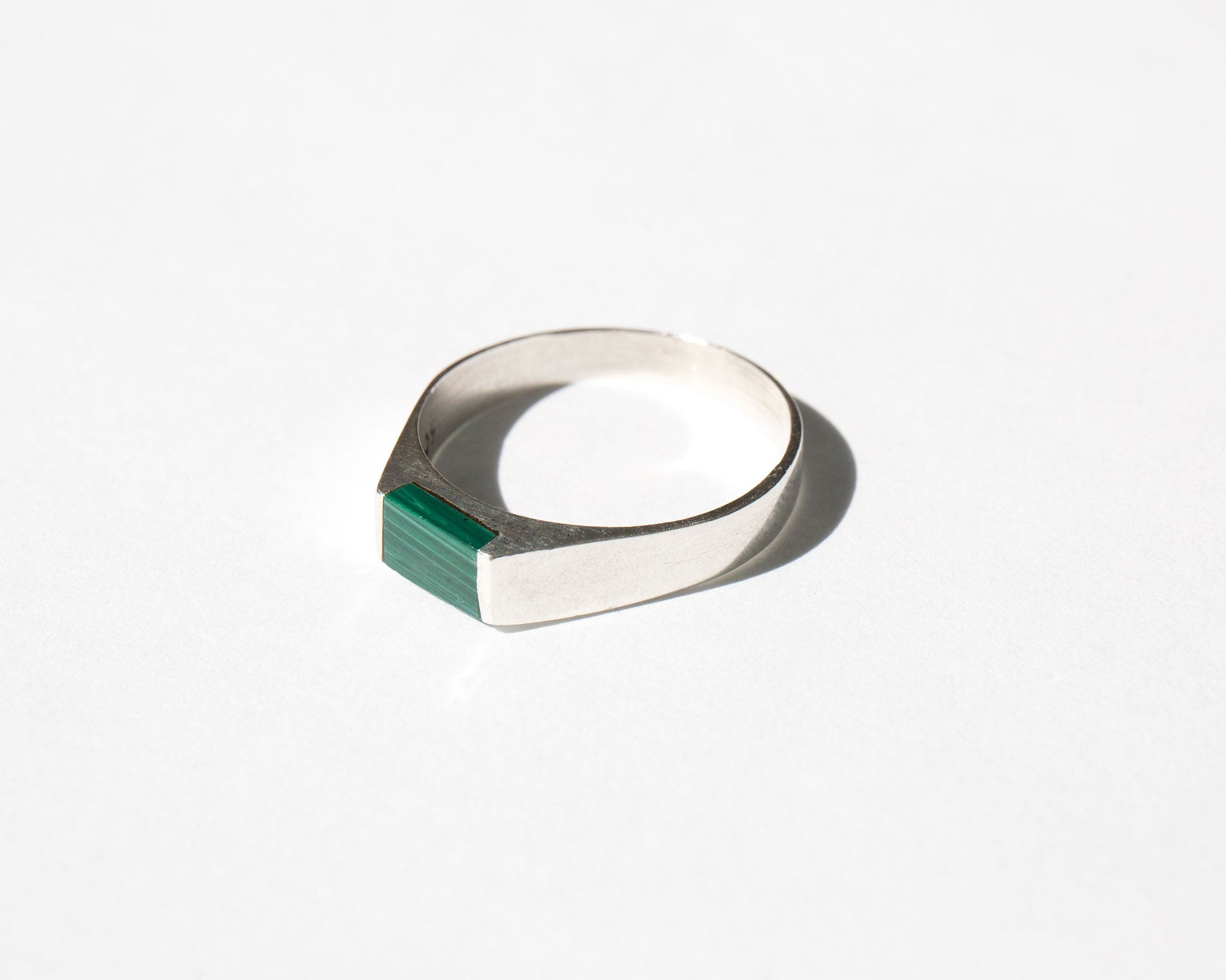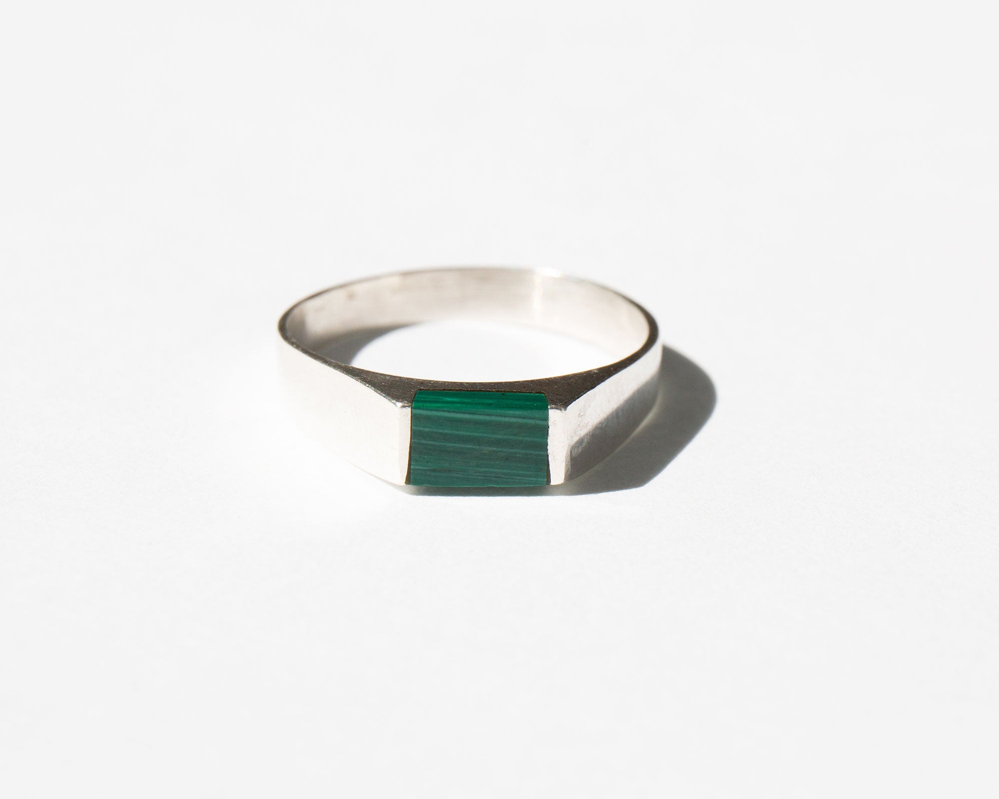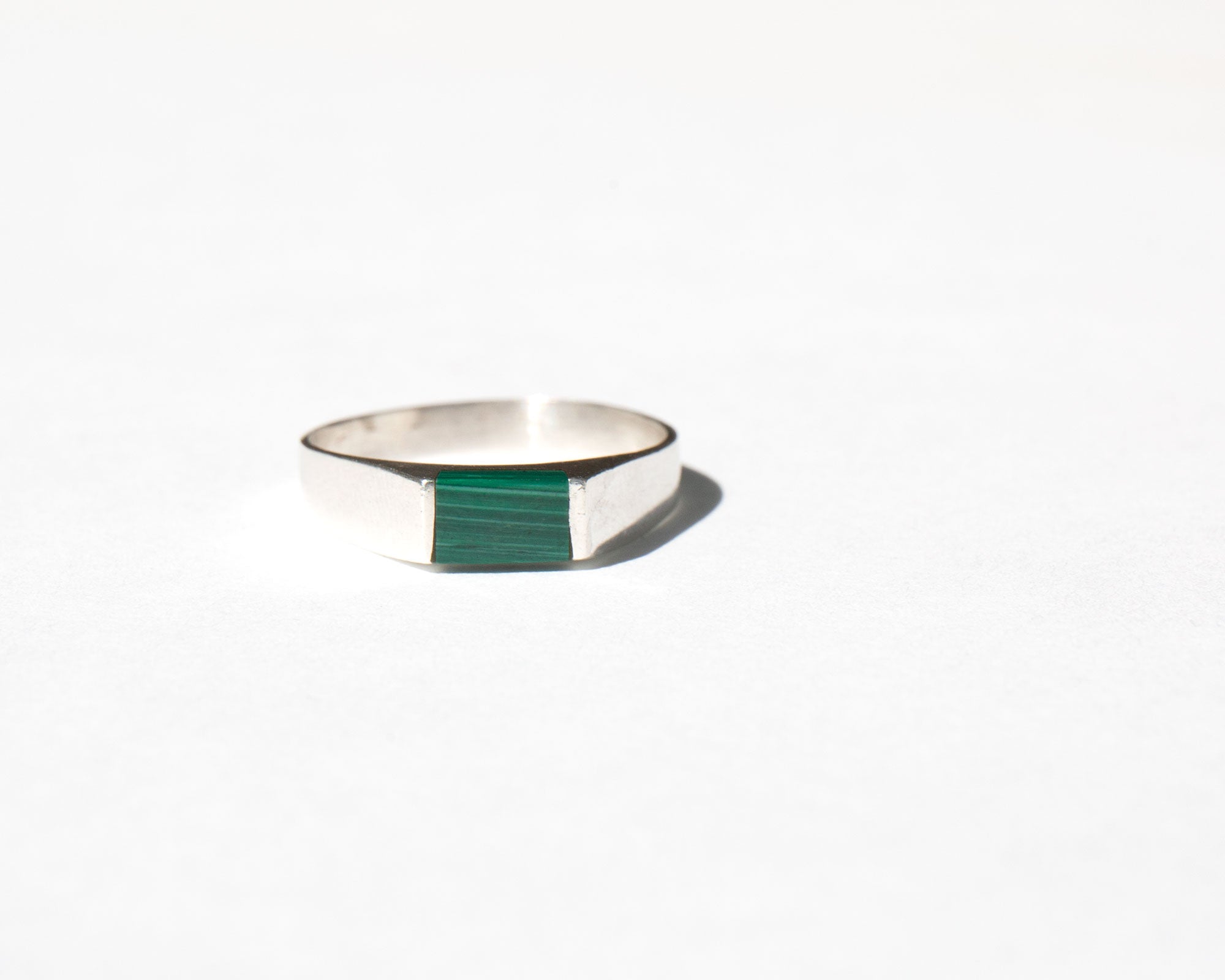 Light and pretty sterling silver ring with malachite. From the Greek word malakos, meaning soft, malachite is said to be a stone that opens the heart, clears negative energy, and protects one from the evil eye and other detrimental and draining forces.