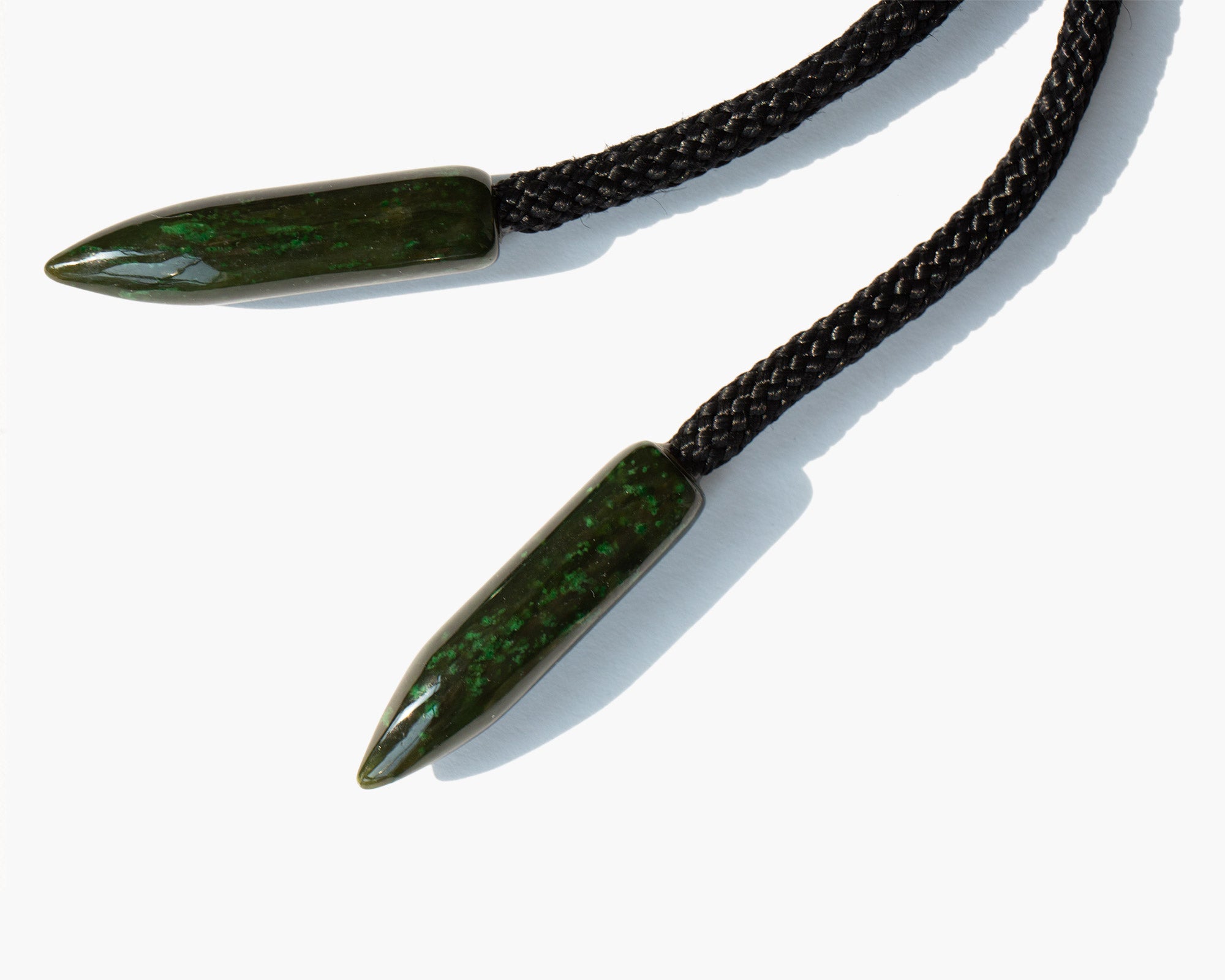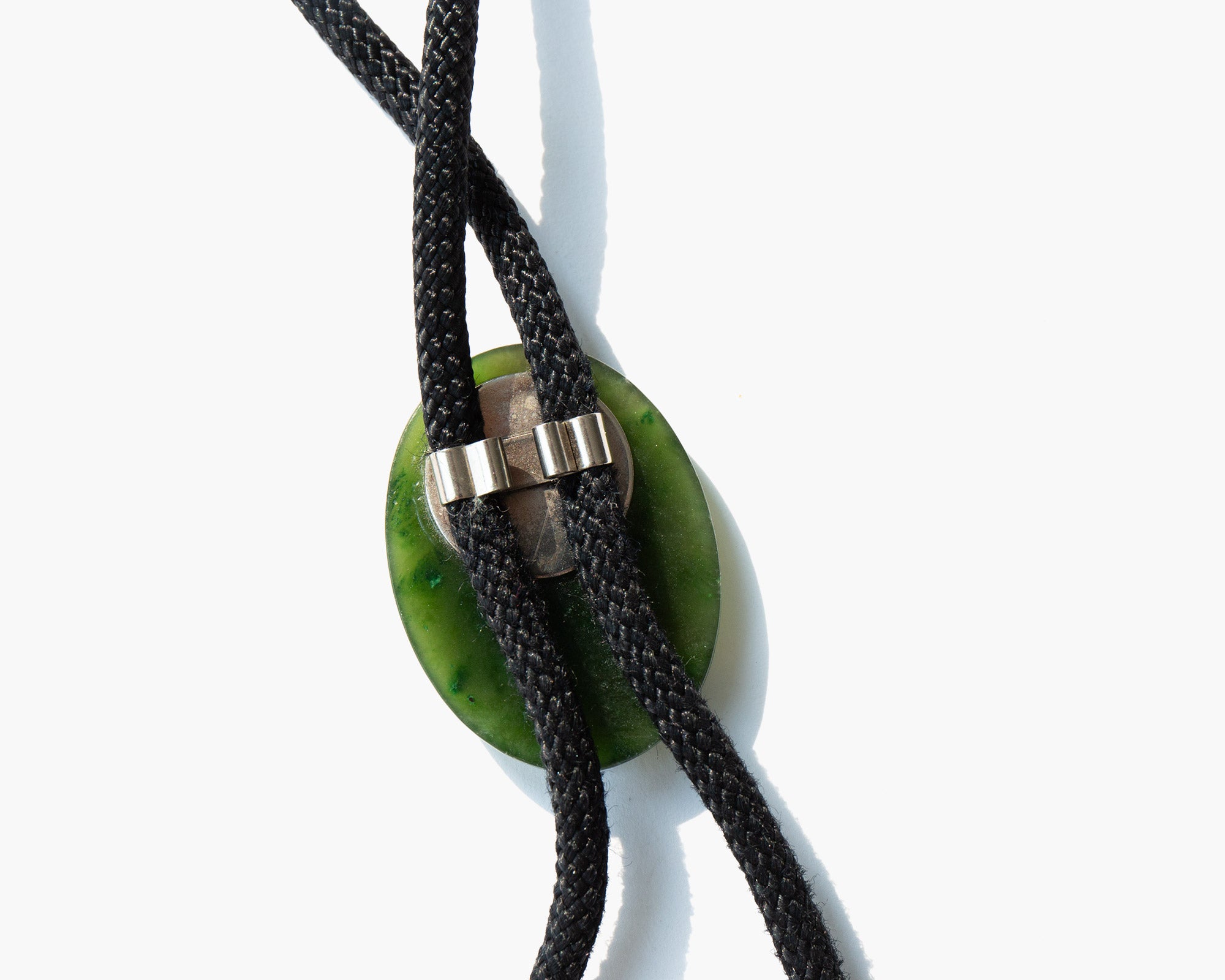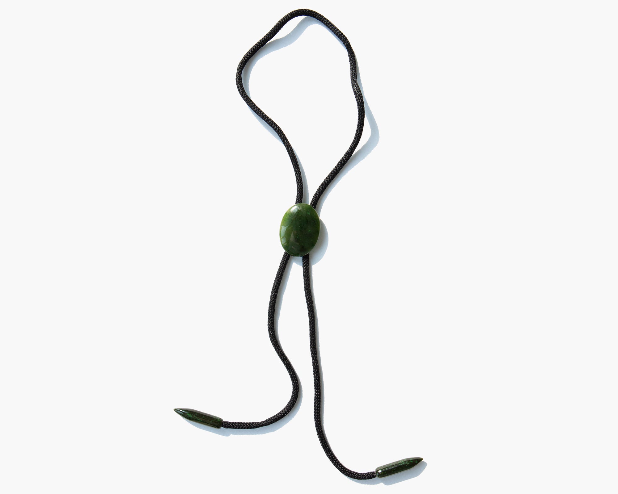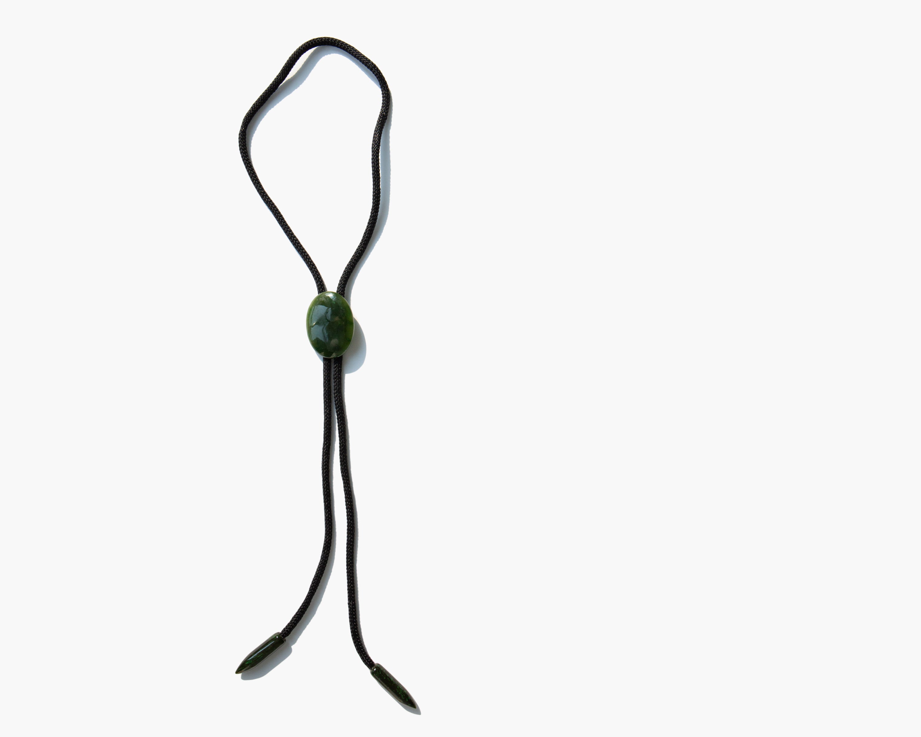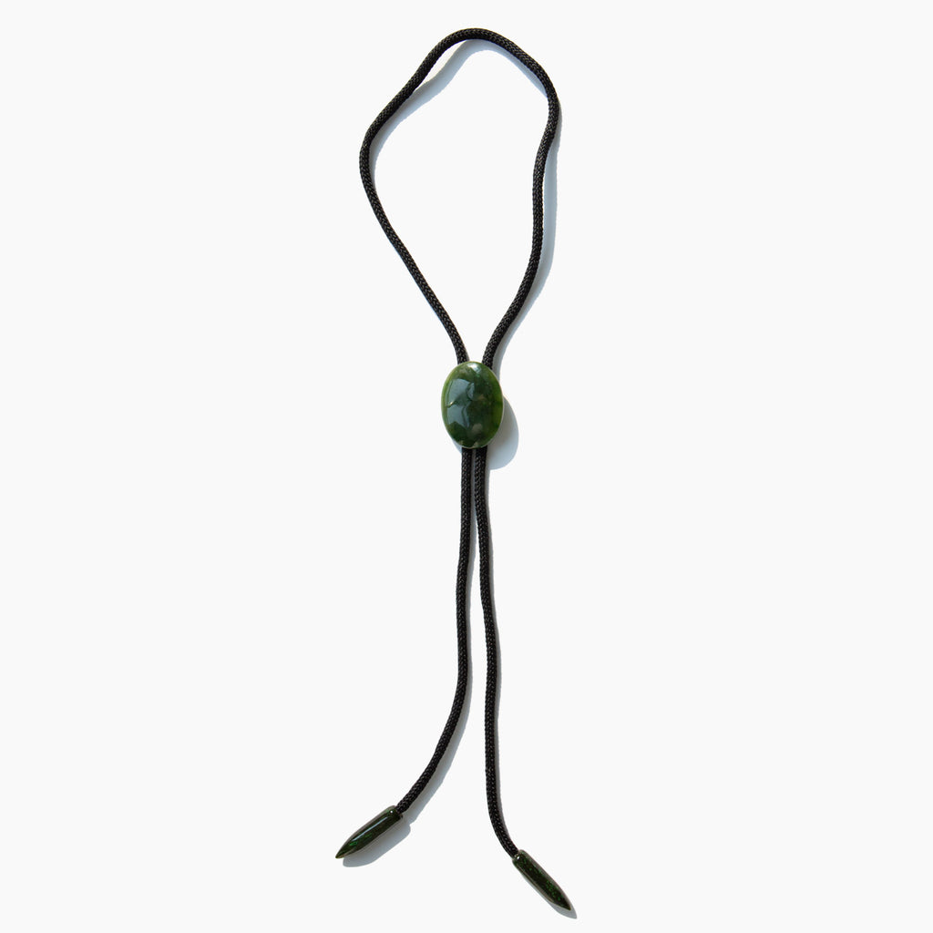 Handmade, chic string bolo tie with Wyoming nephrite jade slide and aiguillettes. Wyoming is home to one of the largest and purest troves of jade in the world and it is the state gem.