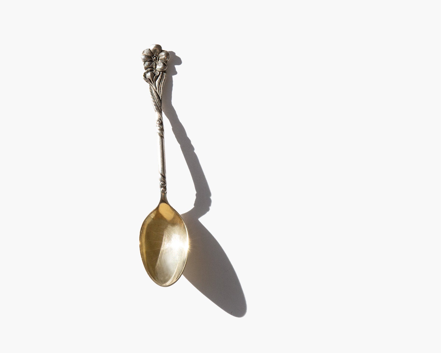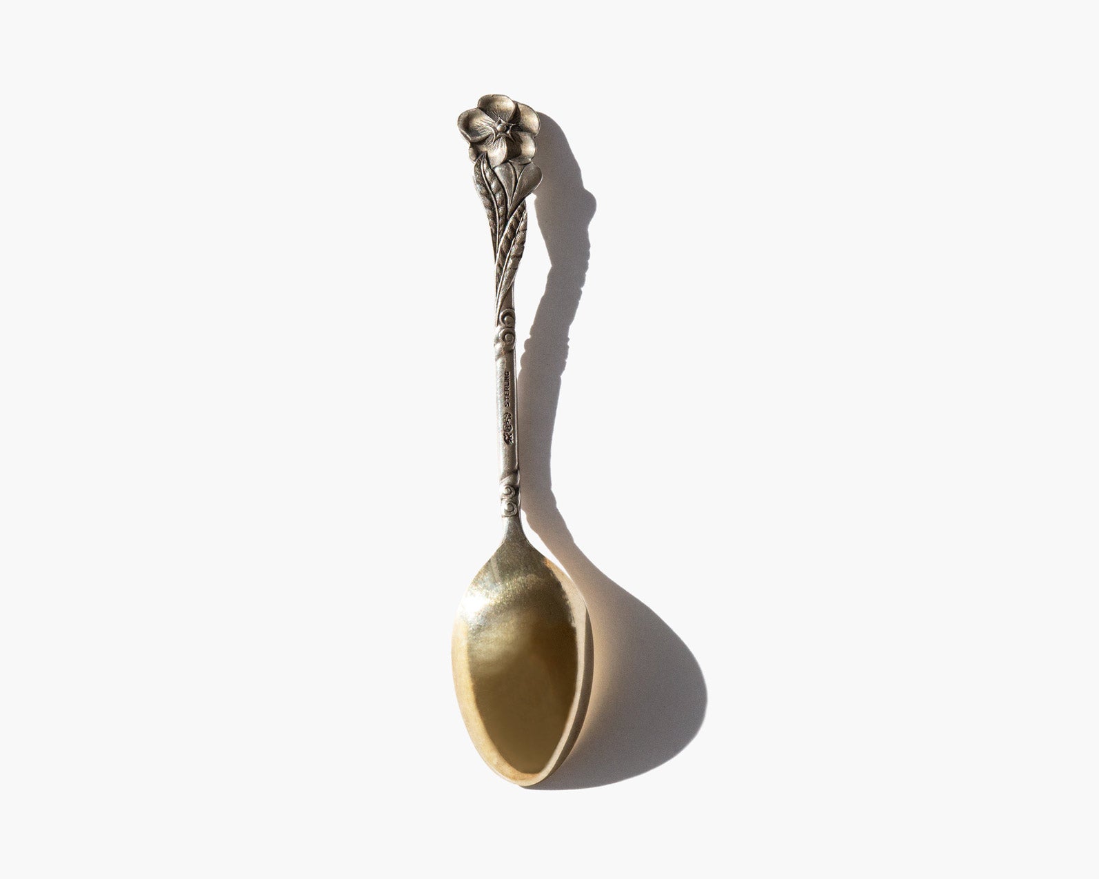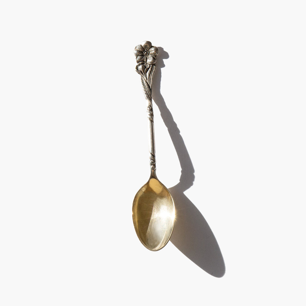 Antique sterling silver spoon with a gold wash bowl and intricately designed floral handle. A fantastic mask spoon for the vanity or curio piece.