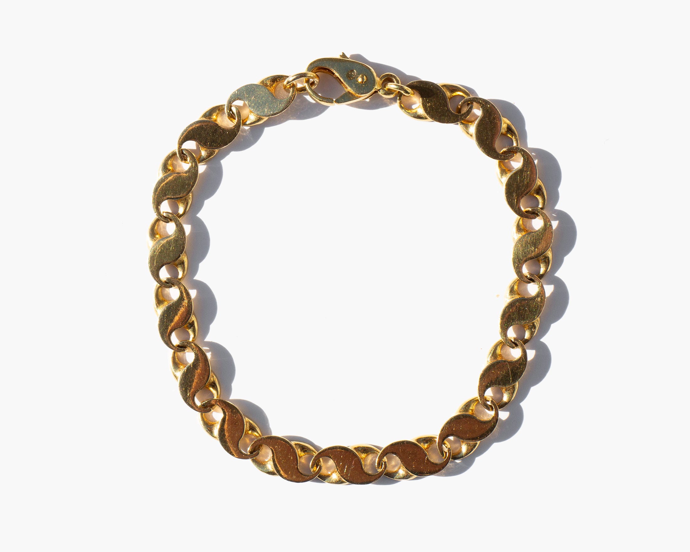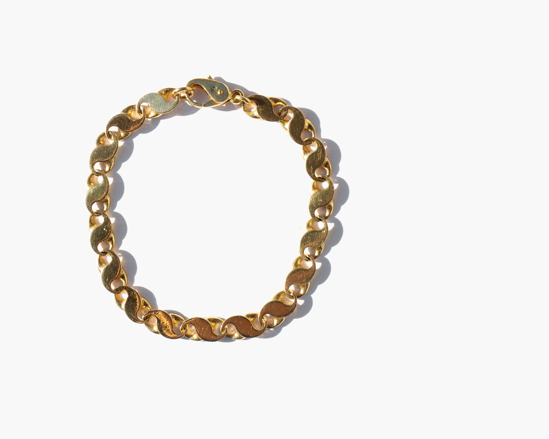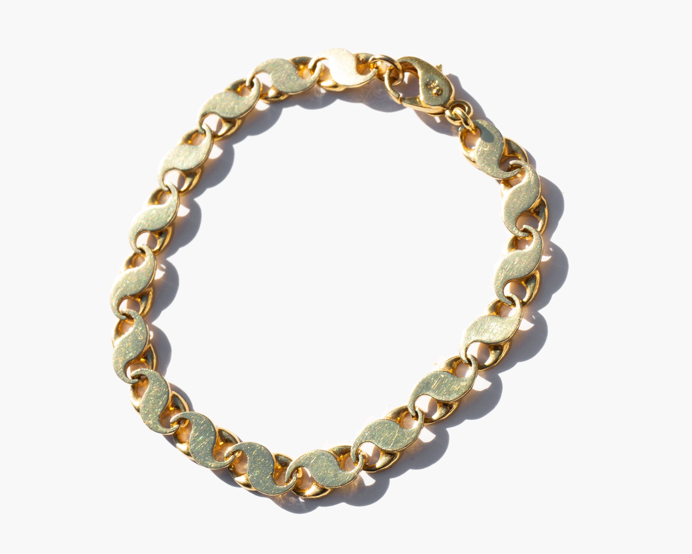 Solid 18k gold bracelet with an unusual link and lobster clasp closure. Made in Spain.