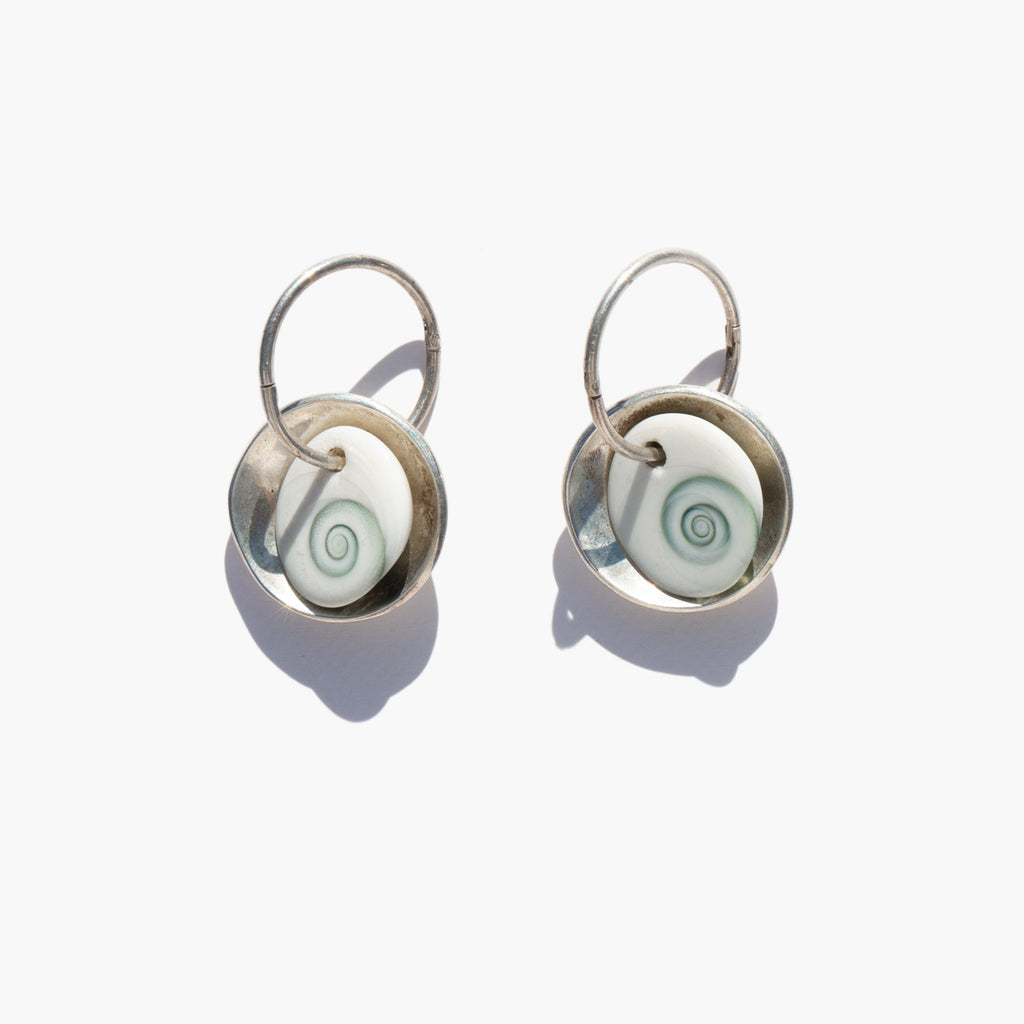 Sterling silver and opercula shell earrings. Opercula or "little lids" are part of the Mexican Turbo snail. Opercula act as a small door that can be closed when the soft body of the snail is retracted.