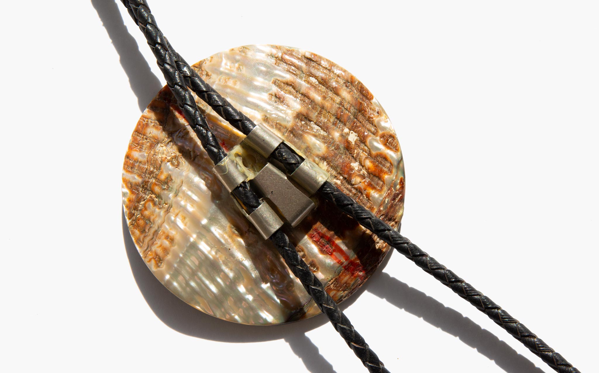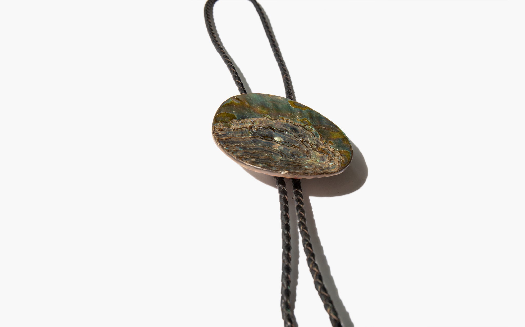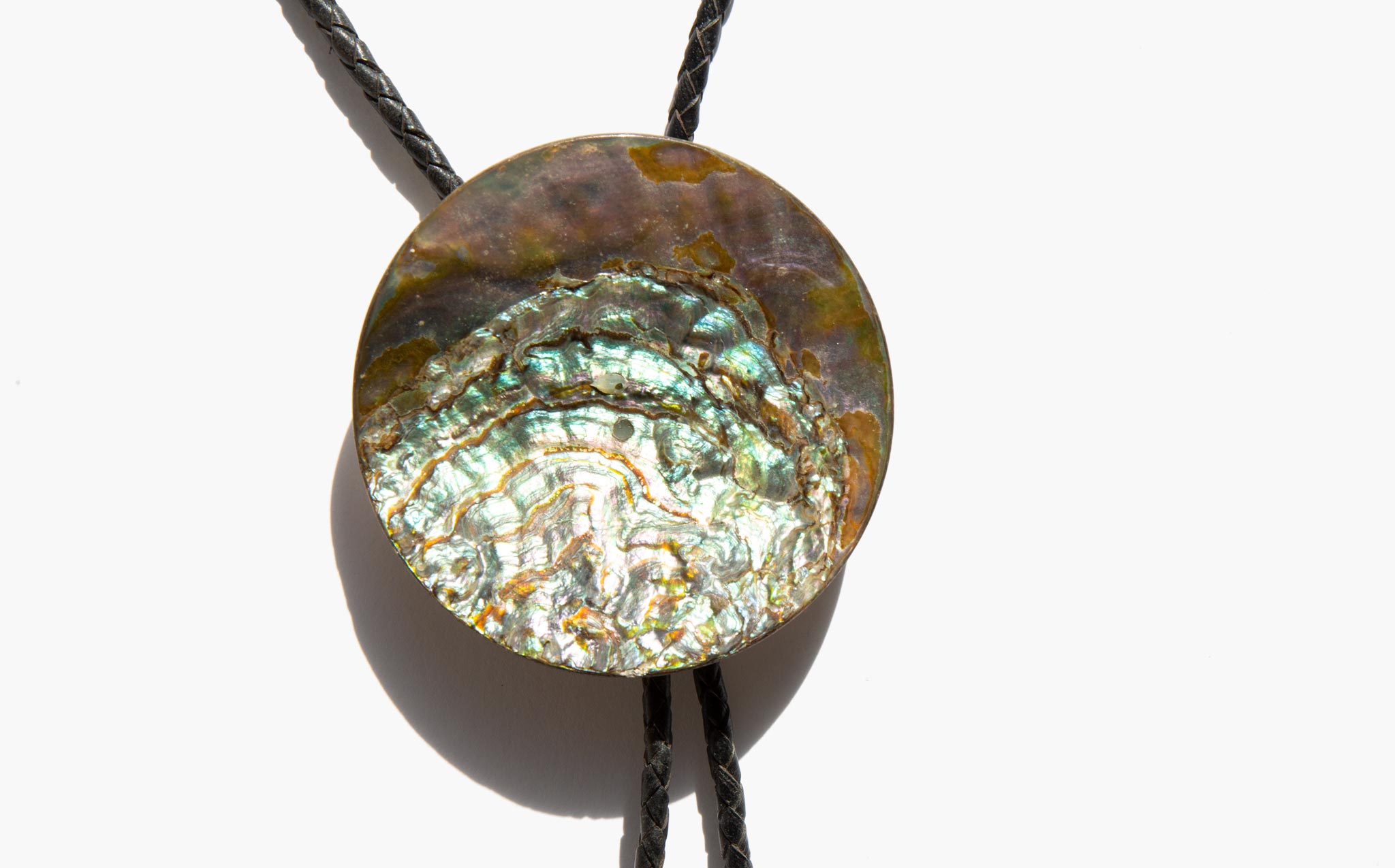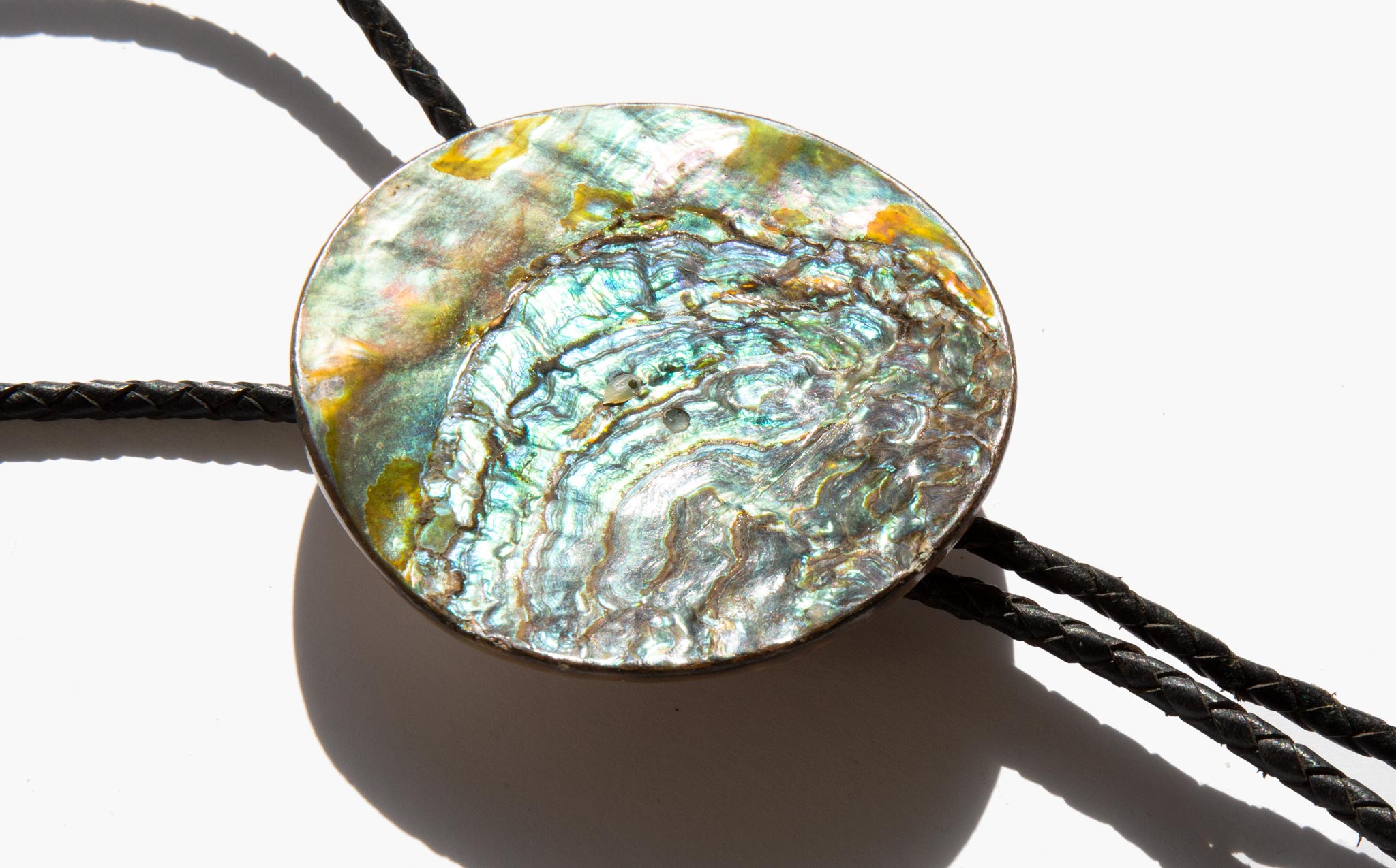 Handmade Southwestern bolo tie necklace with a large, brilliantly iridescent abalone slider. Abalone has long been heralded for its ability to promote harmony and connectedness in relationships by stimulating thoughtfulness and communication. It is also used in many cultures as a symbol of water, and by extension, of calmness and tranquility.
