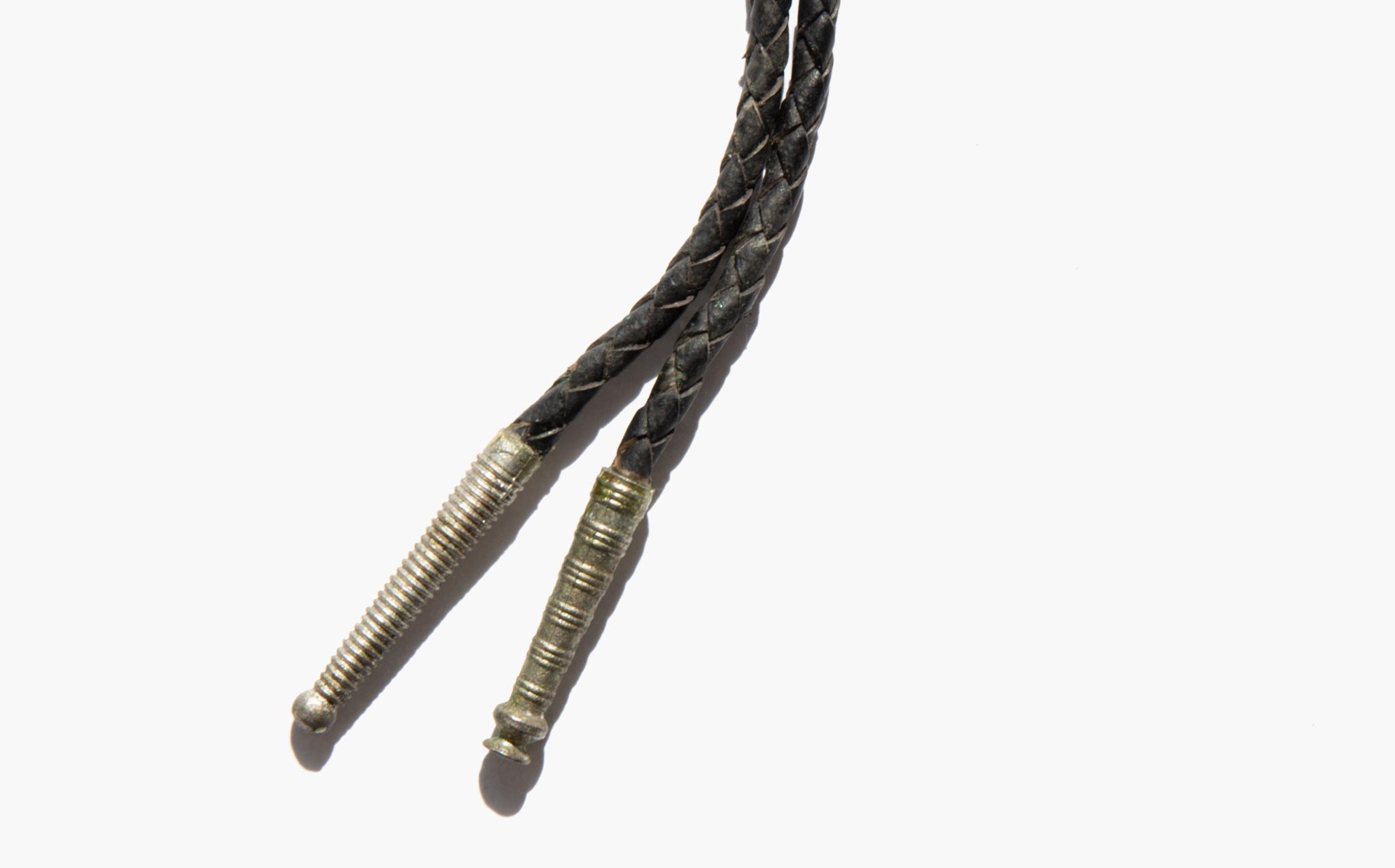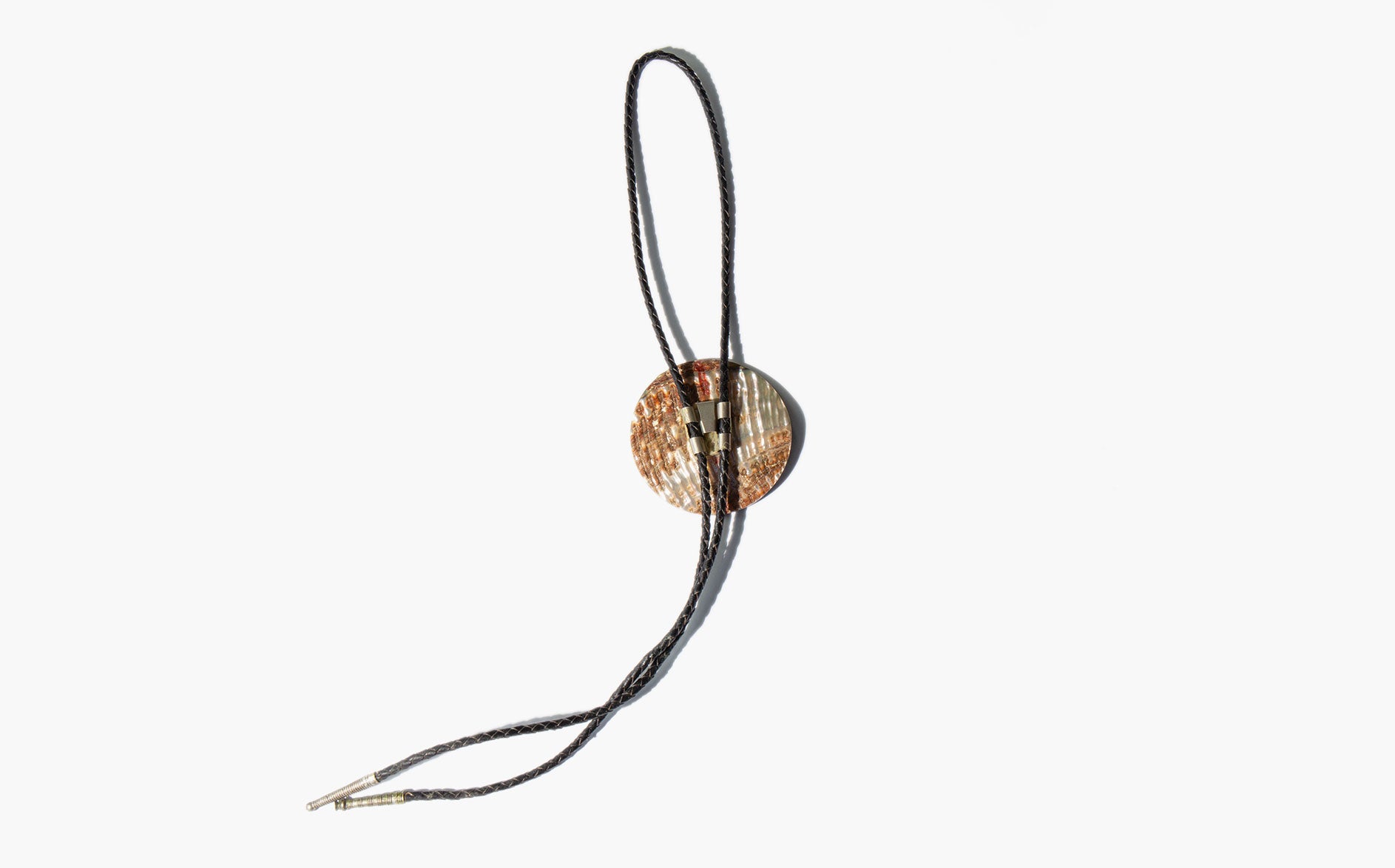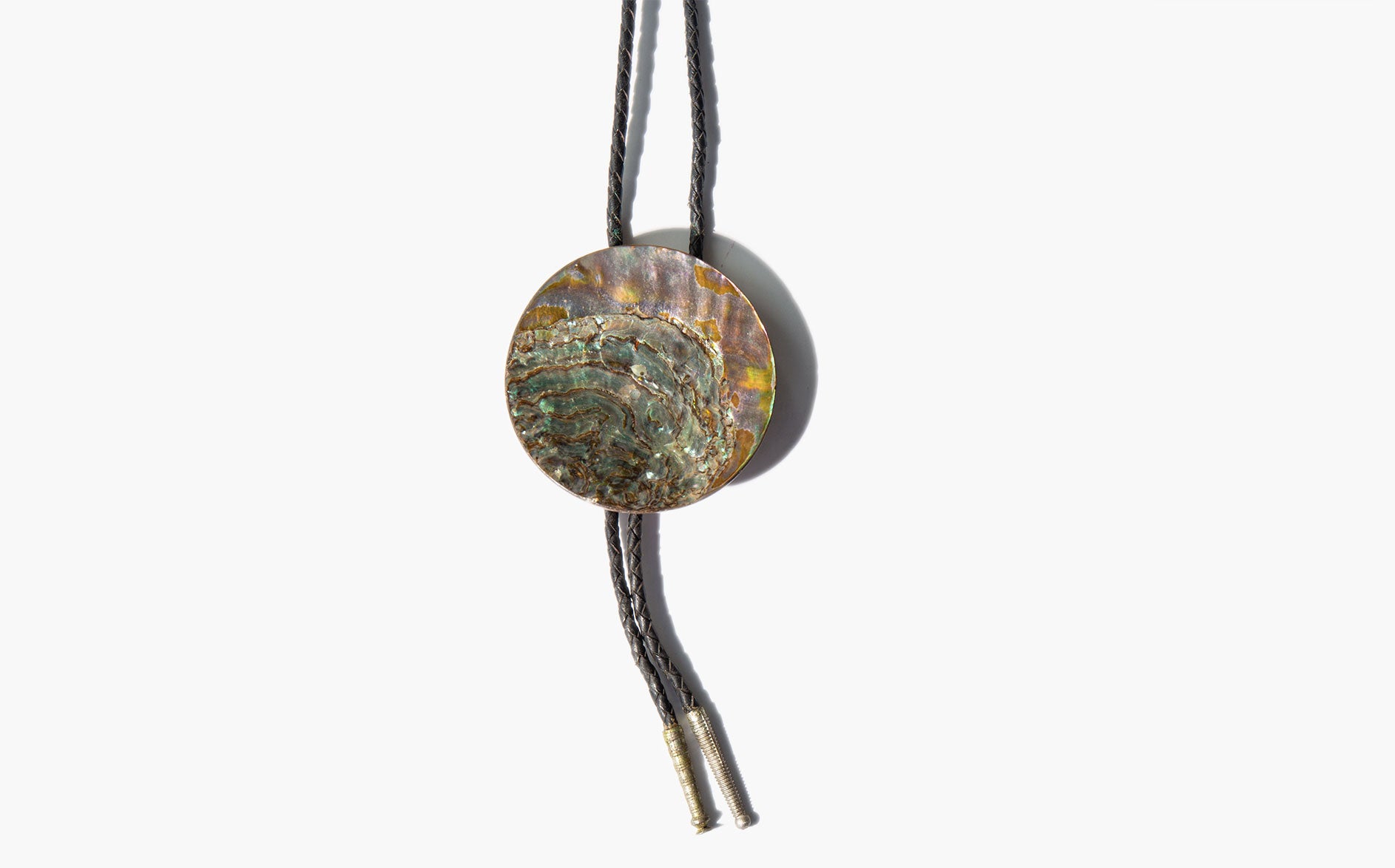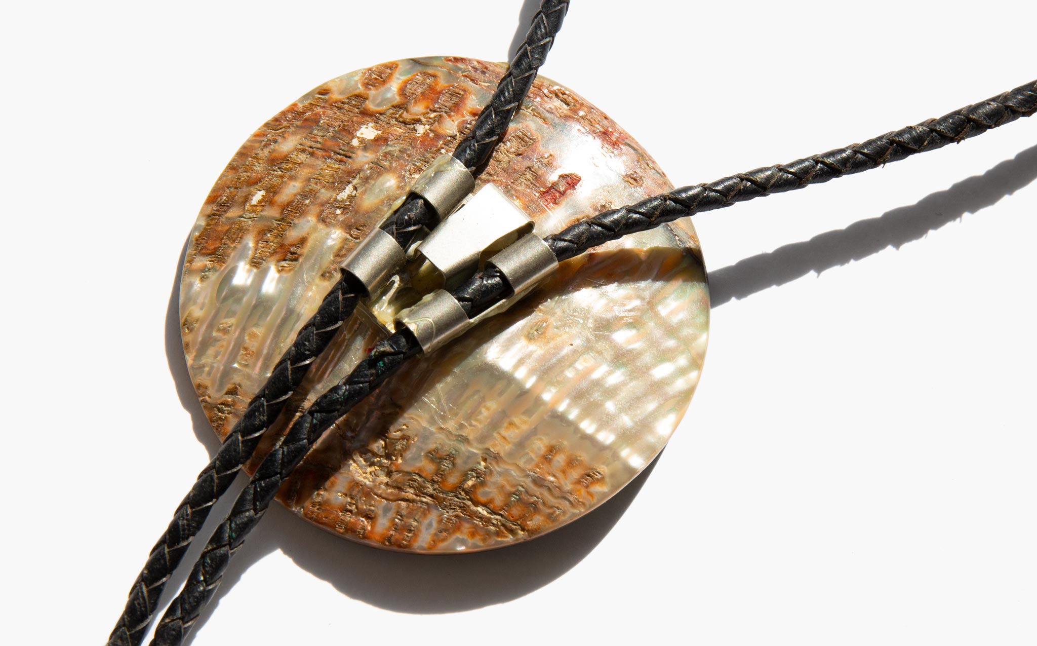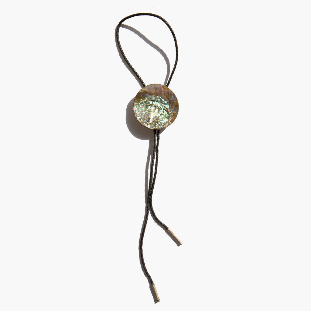 Handmade Southwestern bolo tie necklace with a large, brilliantly iridescent abalone slider. Abalone has long been heralded for its ability to promote harmony and connectedness in relationships by stimulating thoughtfulness and communication. It is also used in many cultures as a symbol of water, and by extension, of calmness and tranquility.
