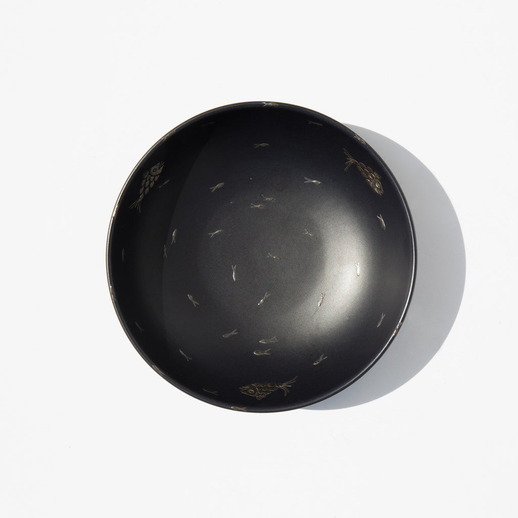 Signed Emilia Castillo Mexican silver overlay pottery bowl. Small, delicate sterling silver fish inlay over black matte glazed porcelain. Handmade in Mexico.