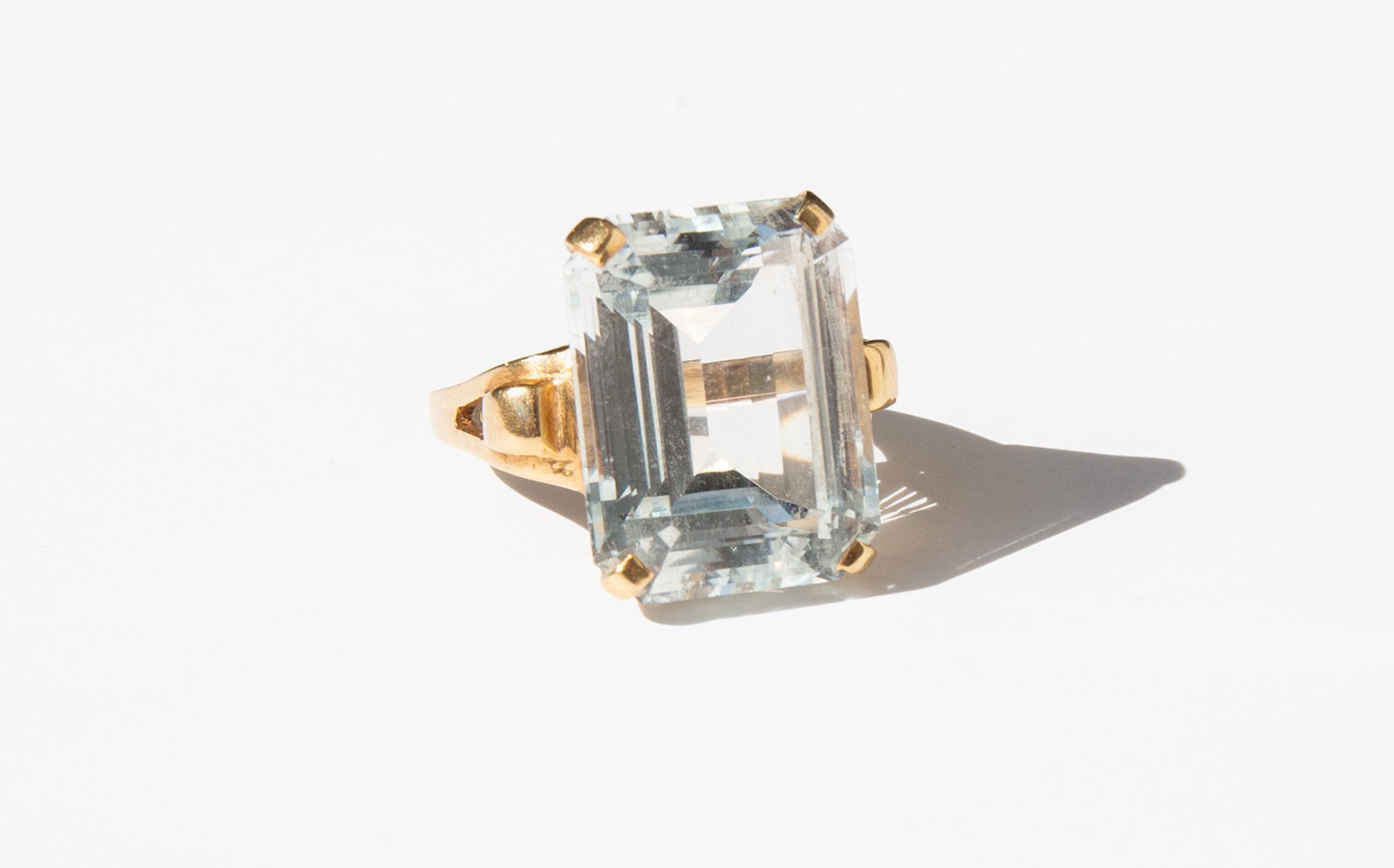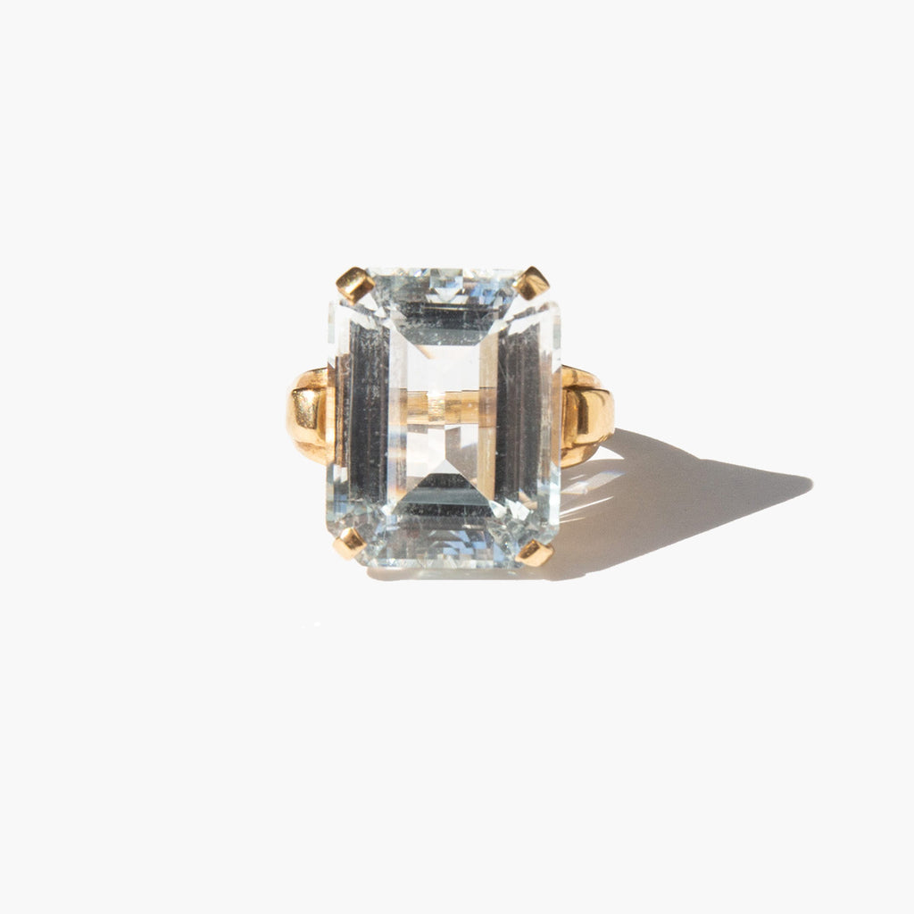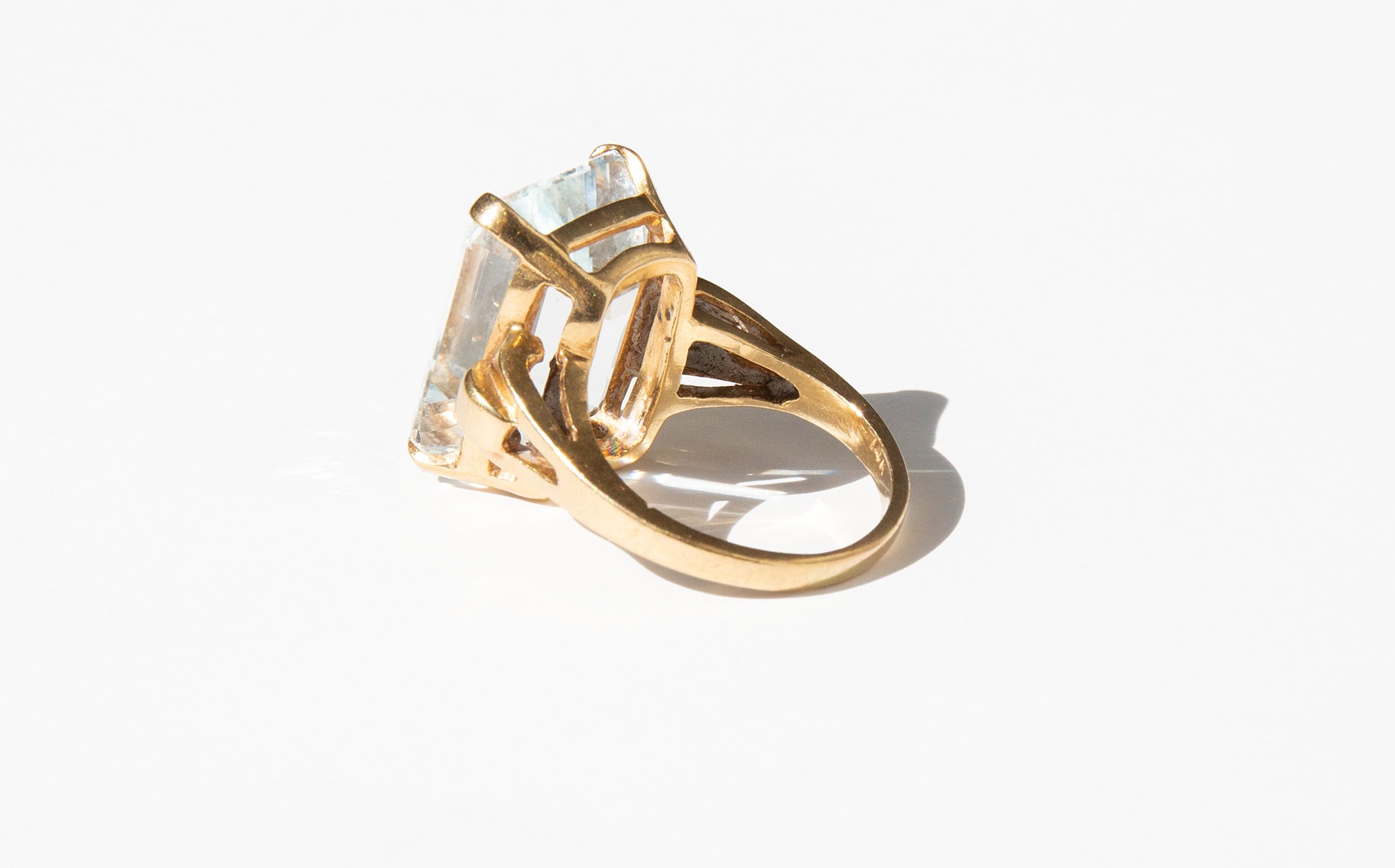 Stunning nearly crystal clear blue topaz with a hint of ethereal sky blue, set in 14k gold.