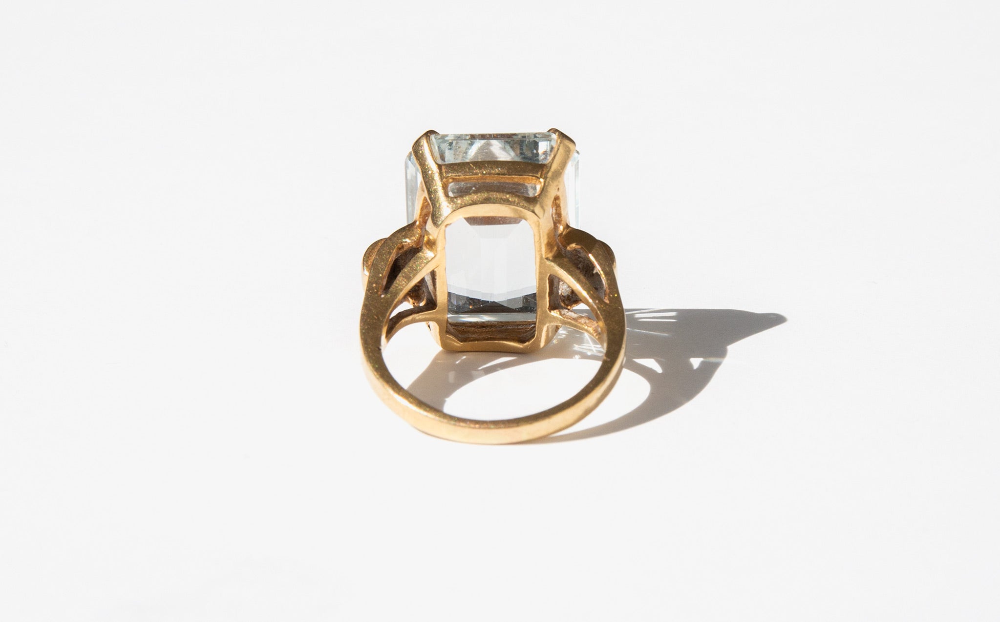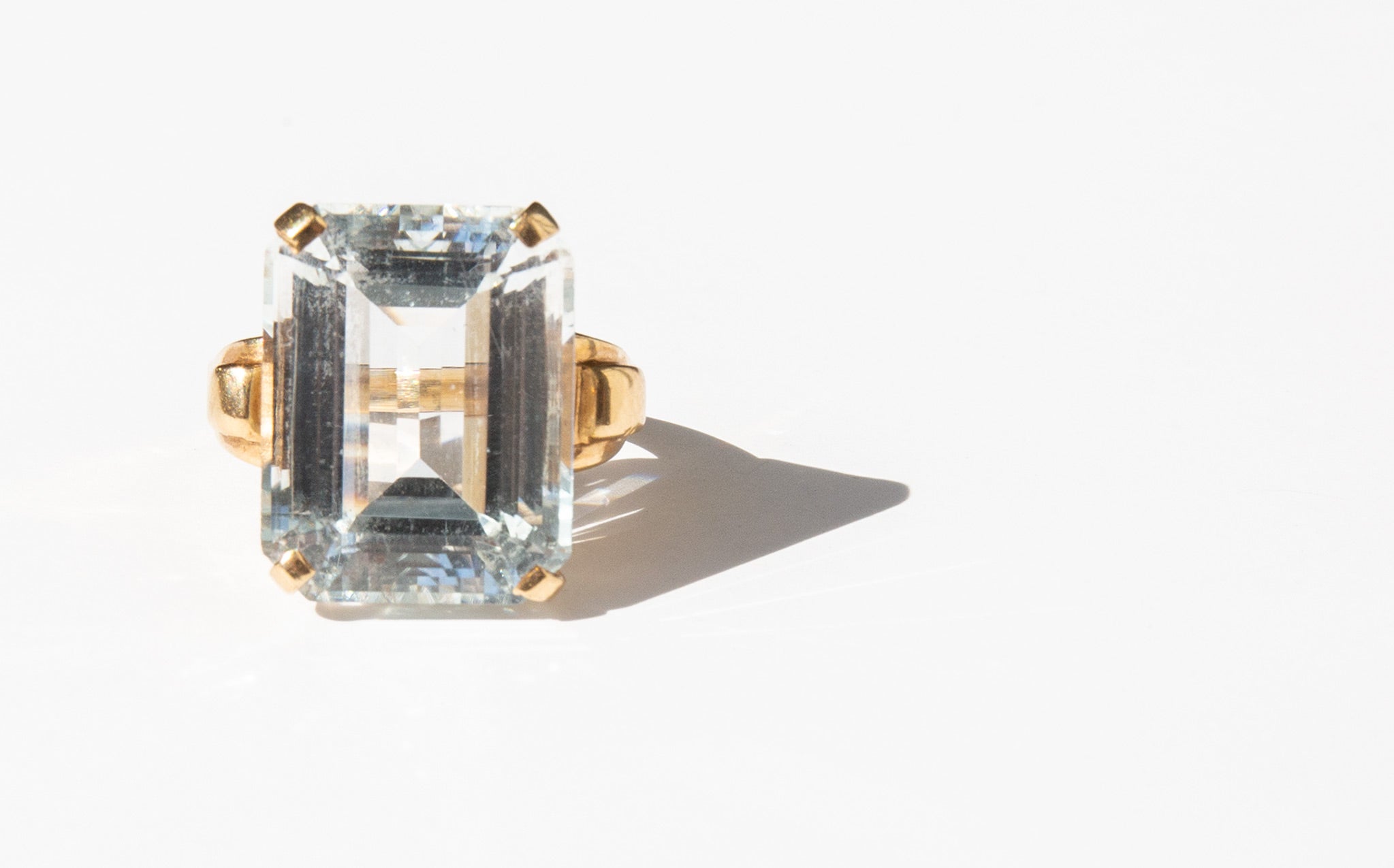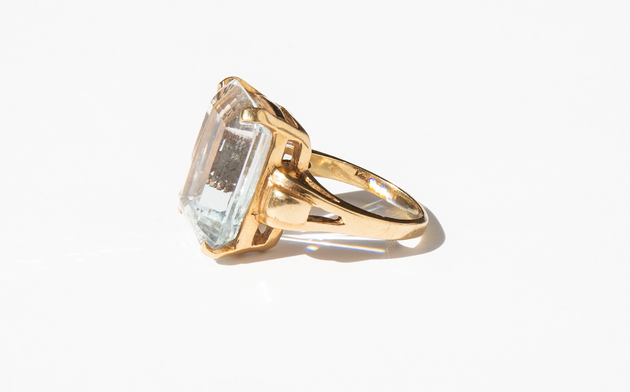 Stunning nearly crystal clear blue topaz with a hint of ethereal sky blue, set in 14k gold.