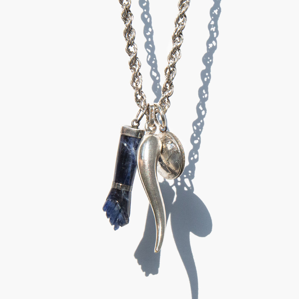 Sterling silver rope chain with a trio of charms for luck and to ward off evil energy.