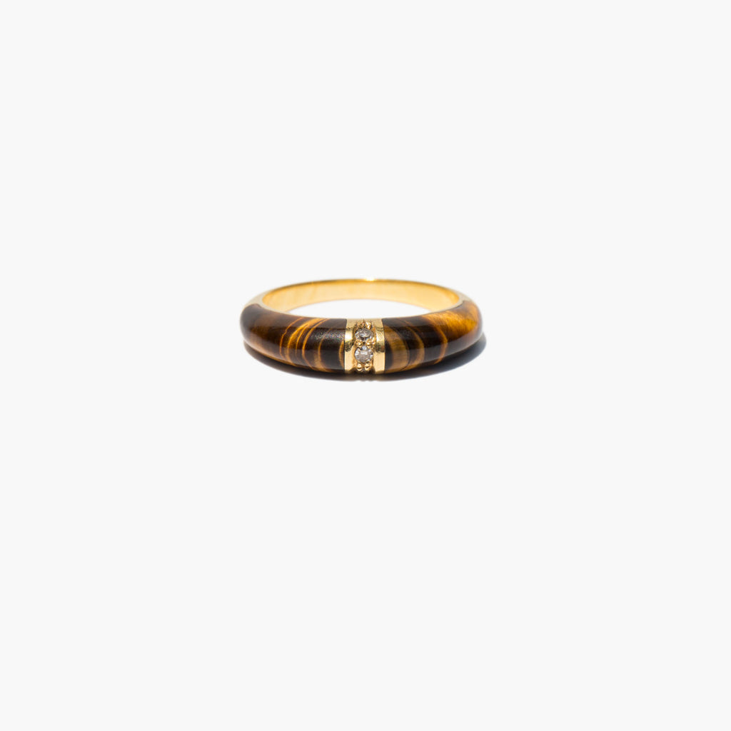 A rich band of striated tiger's eye and 18K gold with center diamond accents.