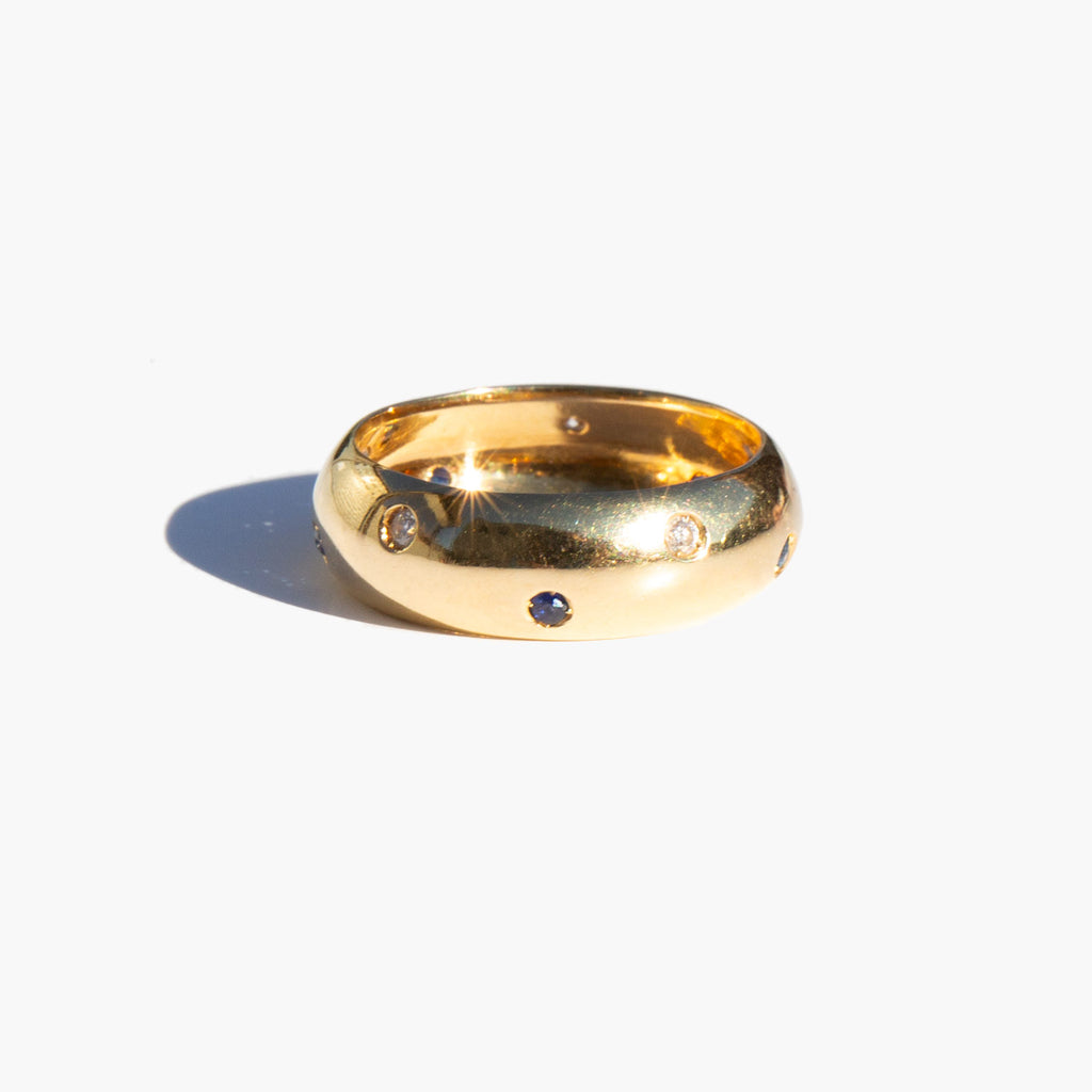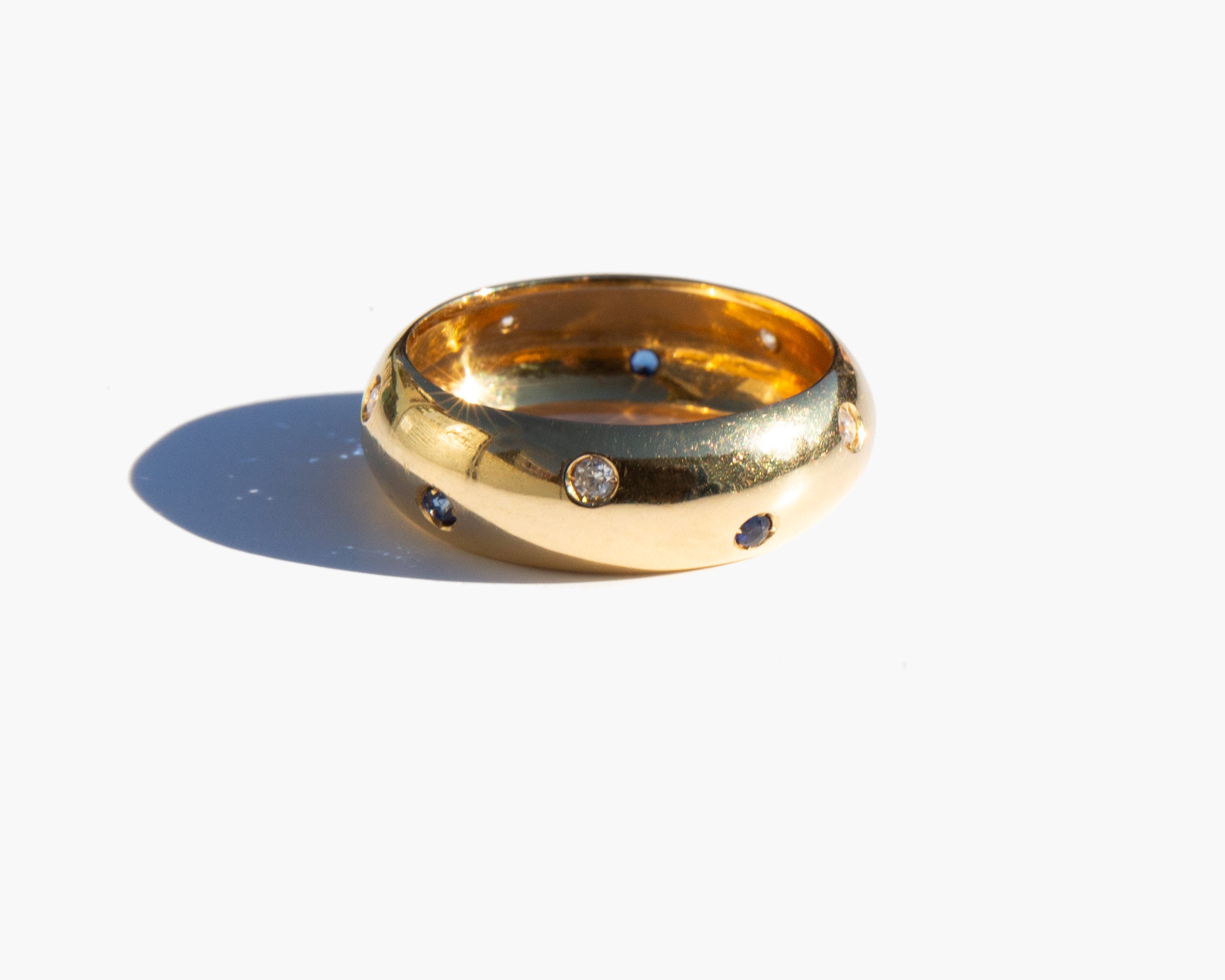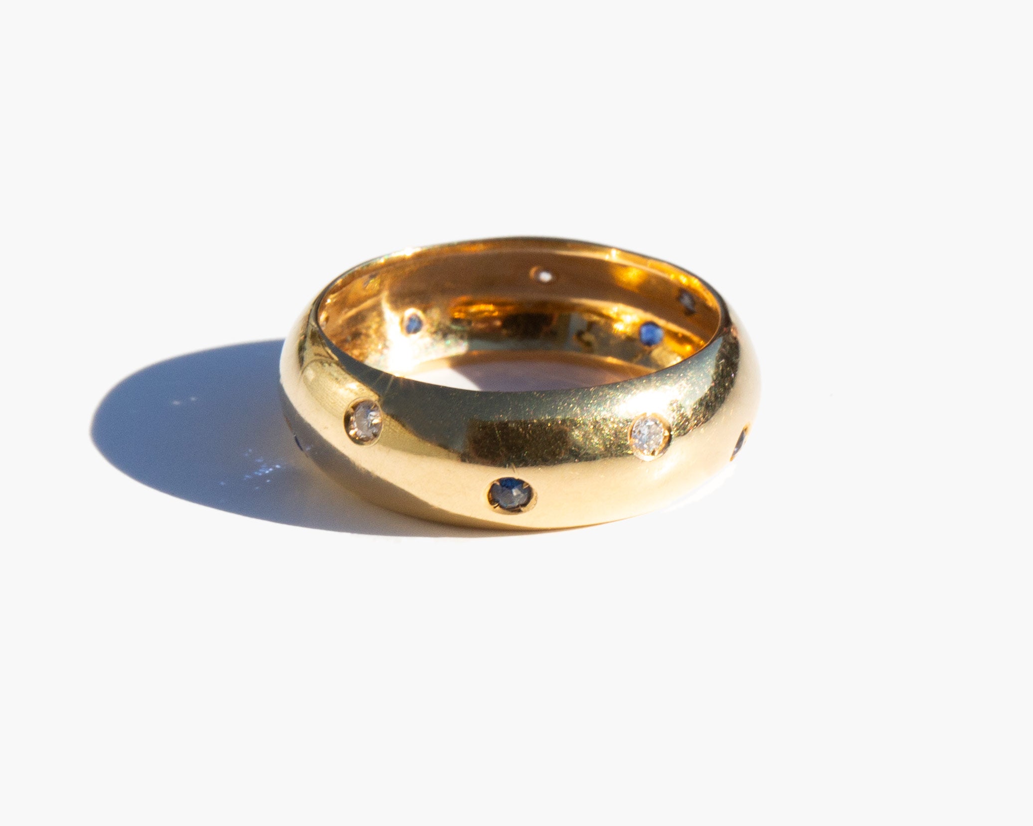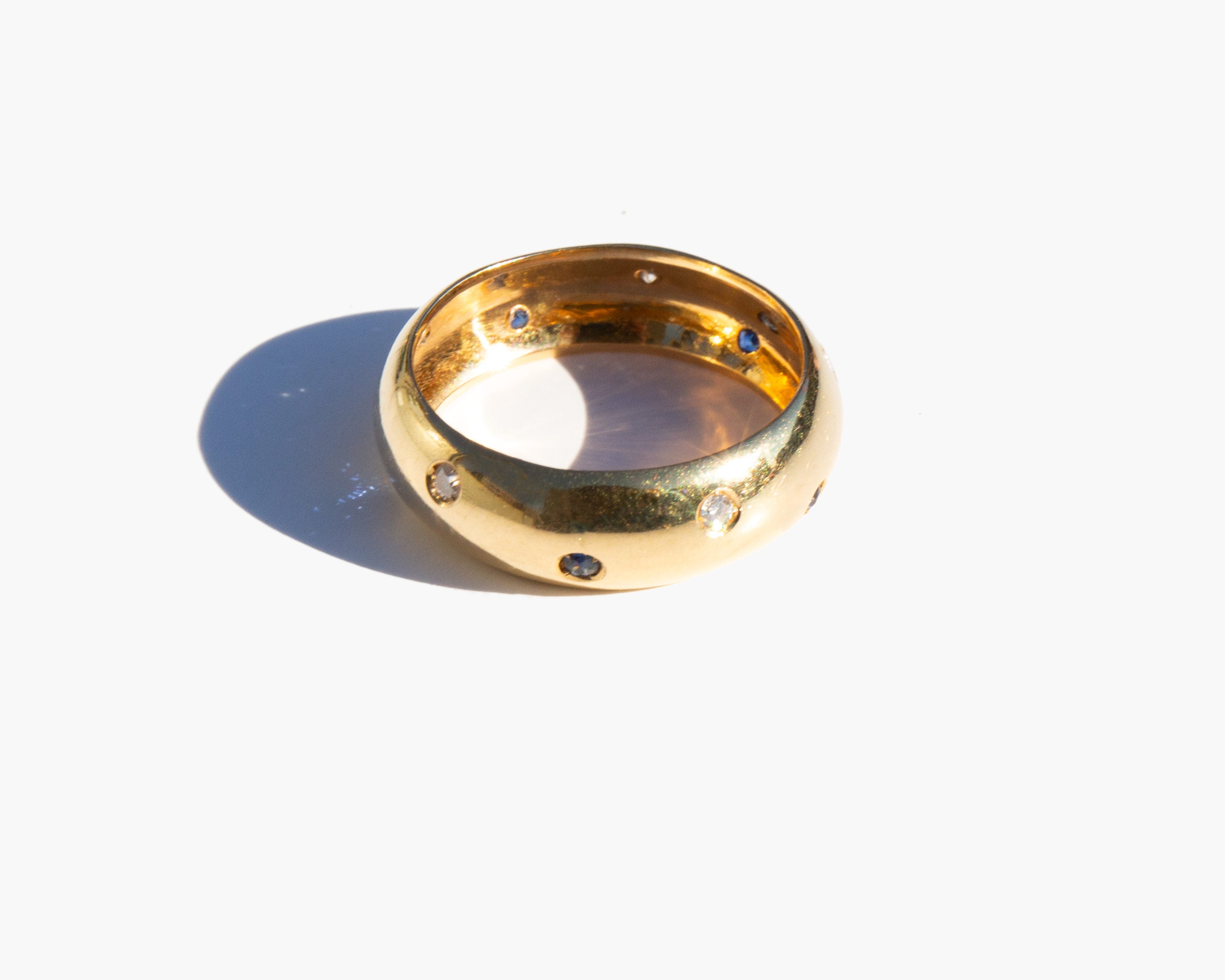 Simple 18k gold band with small star-like diamonds and blue sapphires.