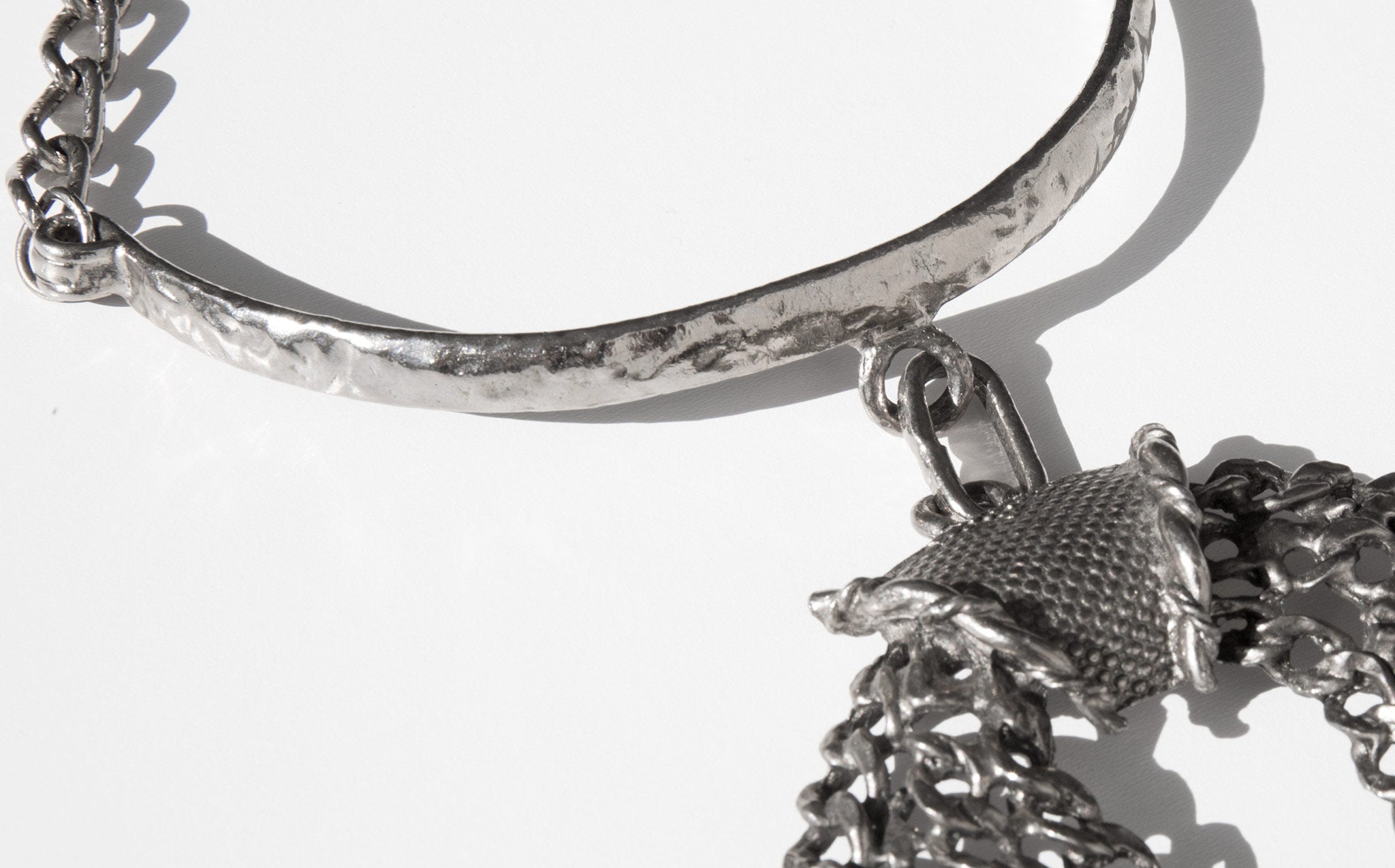 This necklace is vintage and is a costume piece made of silver tone metal.
