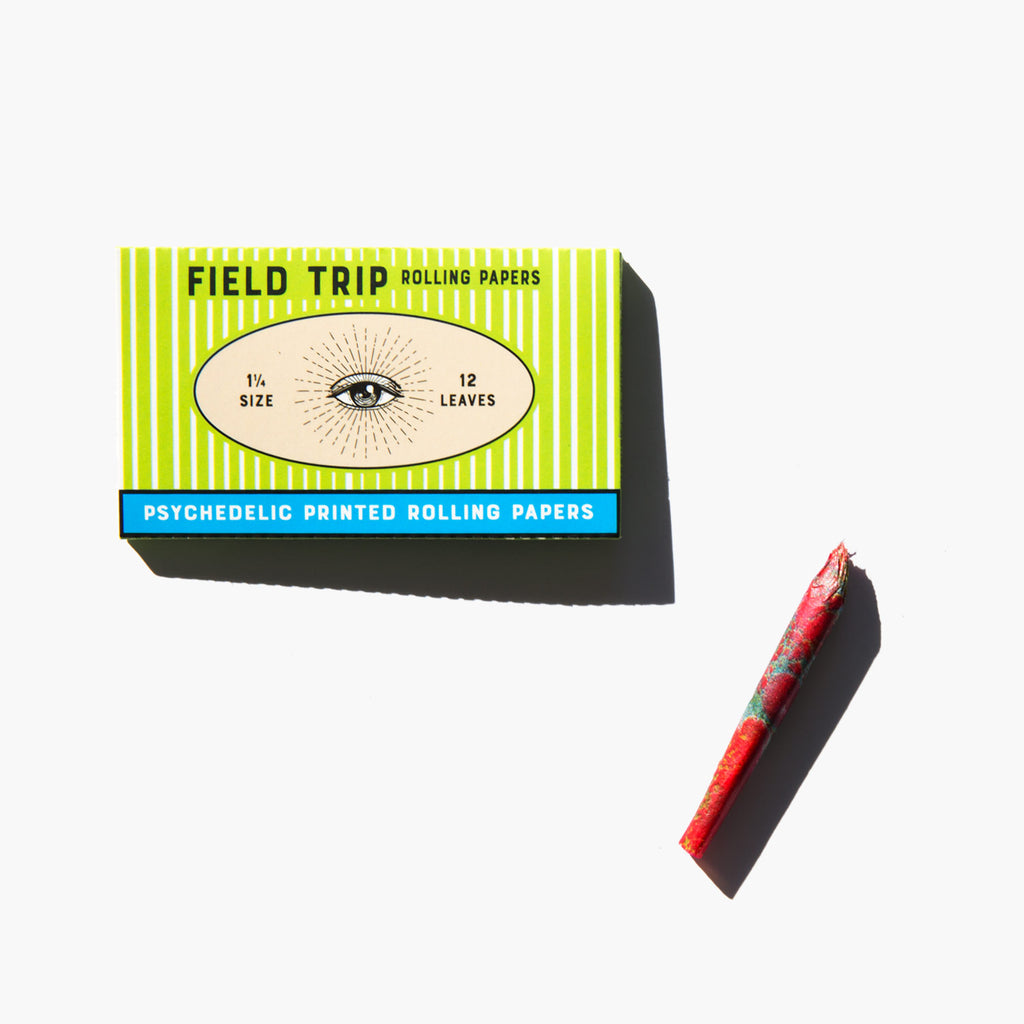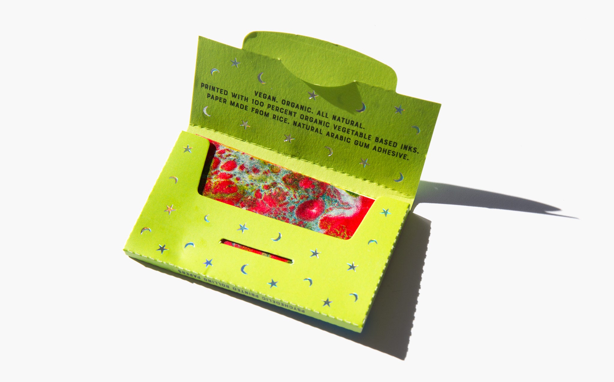 Vegan psychedelic printed rolling papers printed on natural rice paper using organic vegetable based inks and organic, fair-trade arabic gum from the acacia tree. Each booklet contains 12 papers (1 1/4") and 12 tips.
