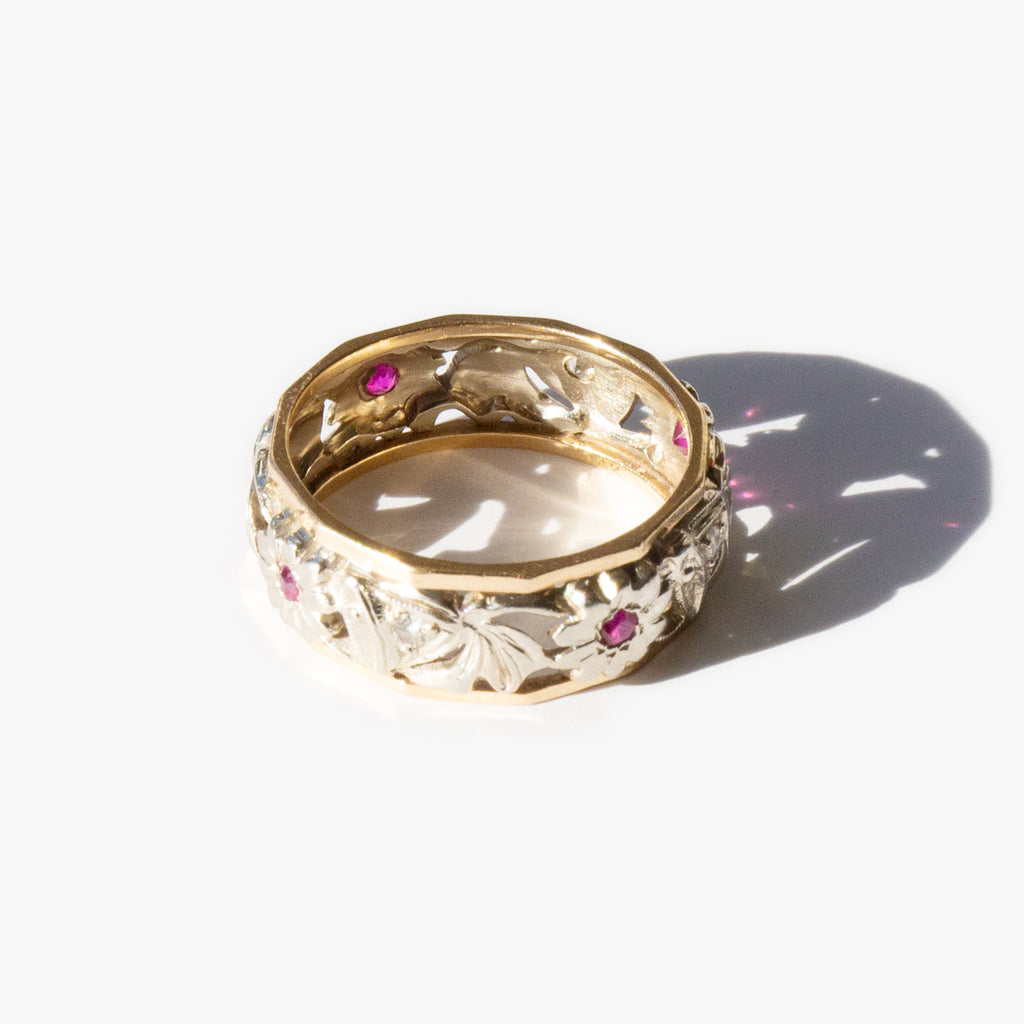 Charming two-tone 14k gold floral band accented with rubies and tiny diamonds. A symbol of powerful emotions and ardent passions, rubies are associated with love and commitment.