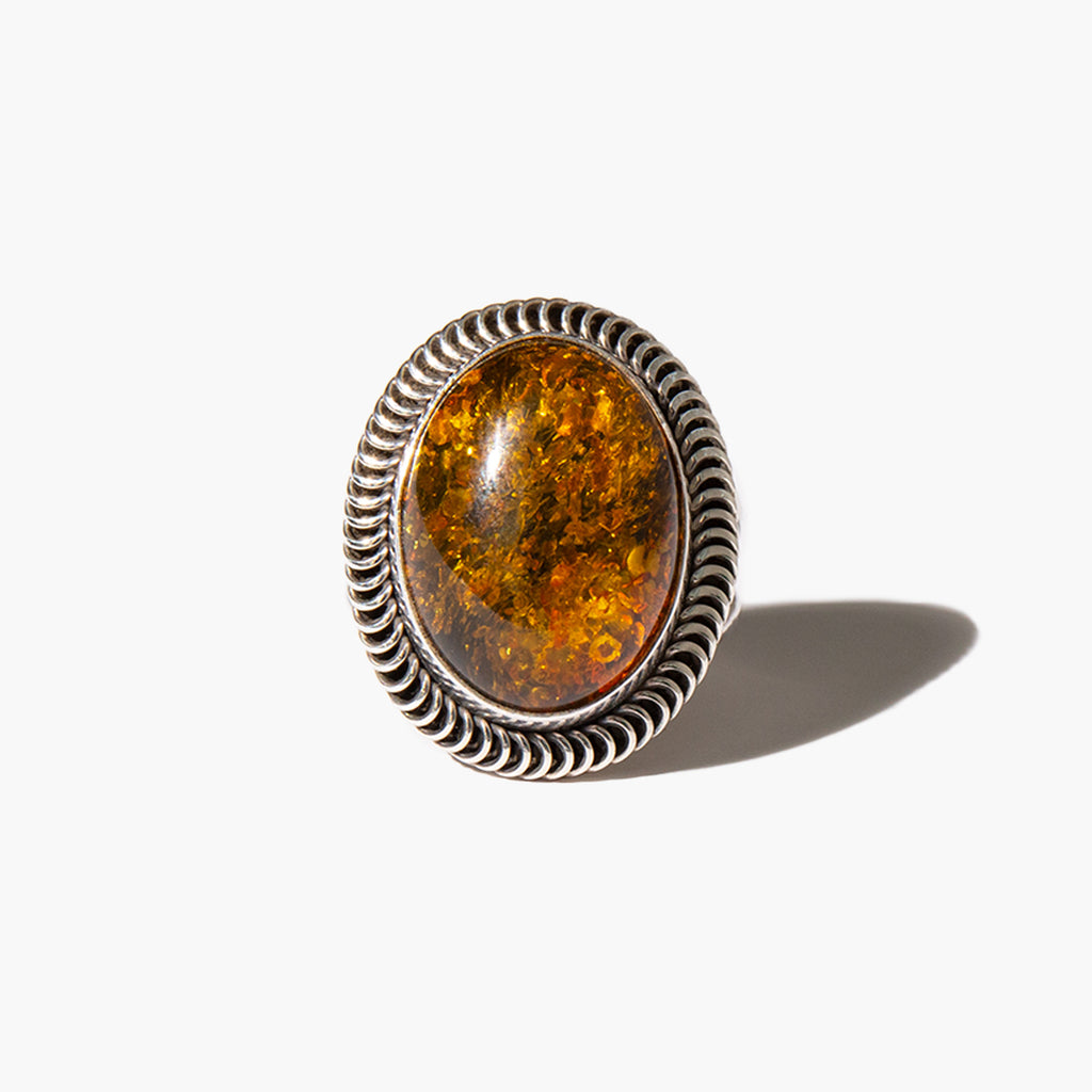 Oxidized sterling silver ring with shimmering, radiant amber.