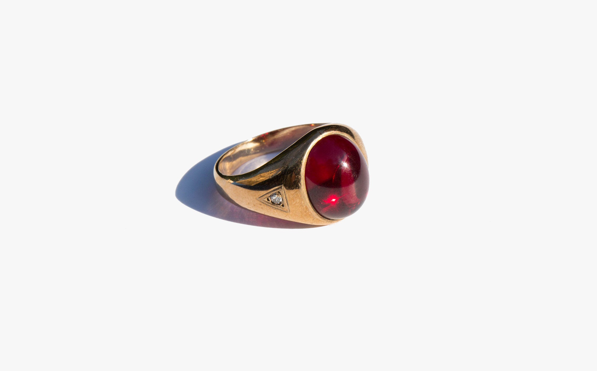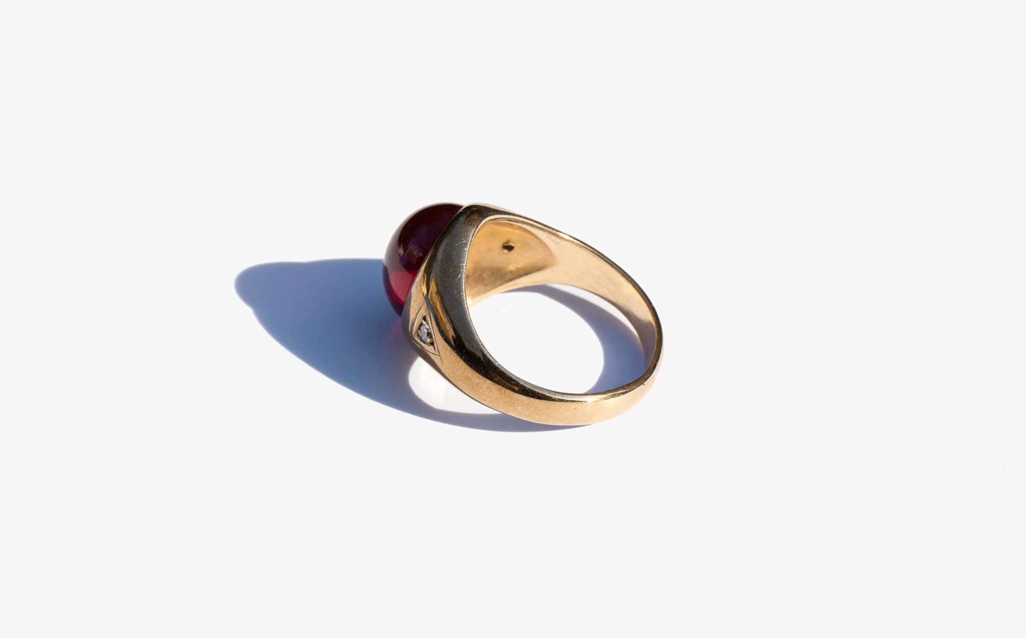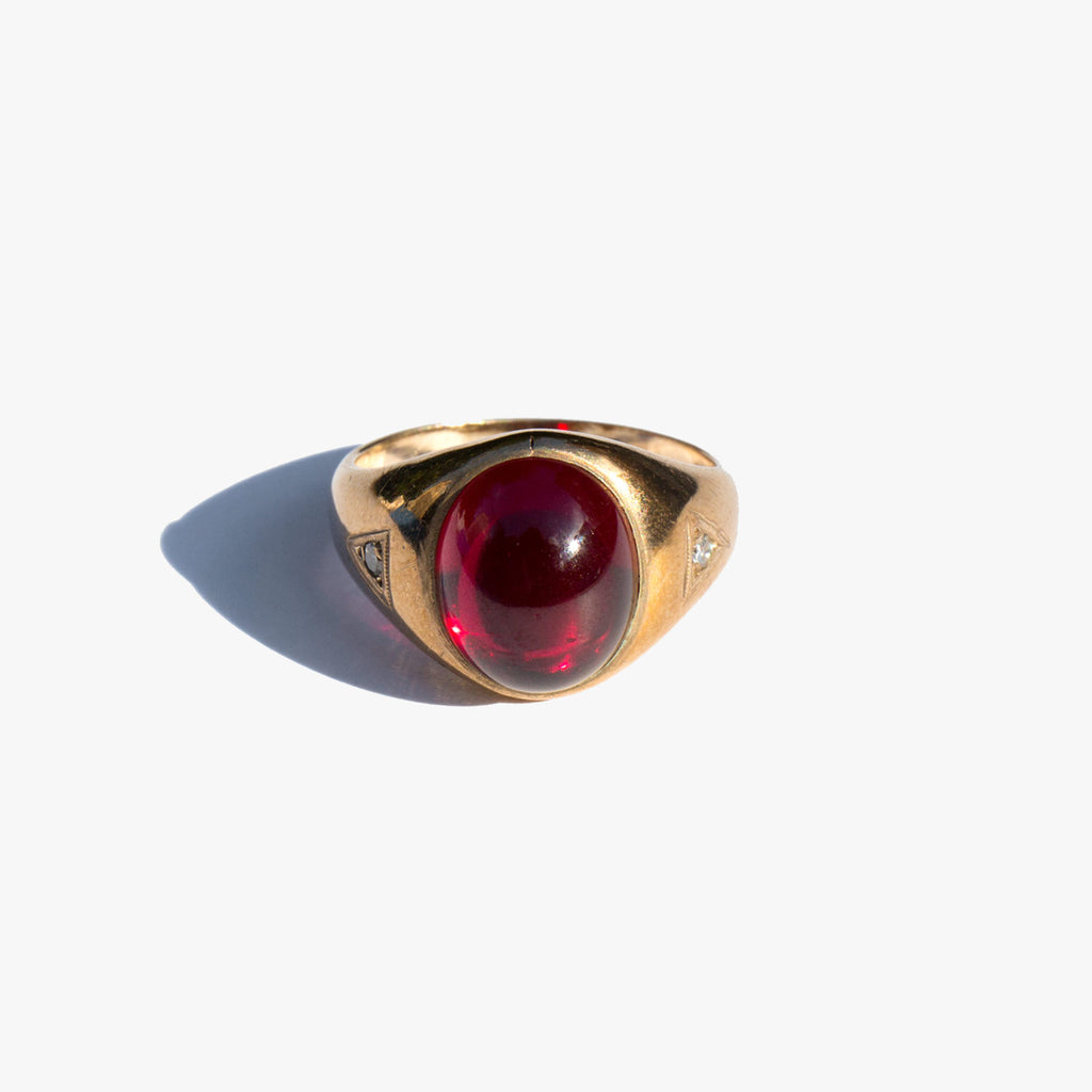 Vintage 14K gold signet ring with pave diamond accents and a deep, blood red center stone. This item ships by 10/23.
