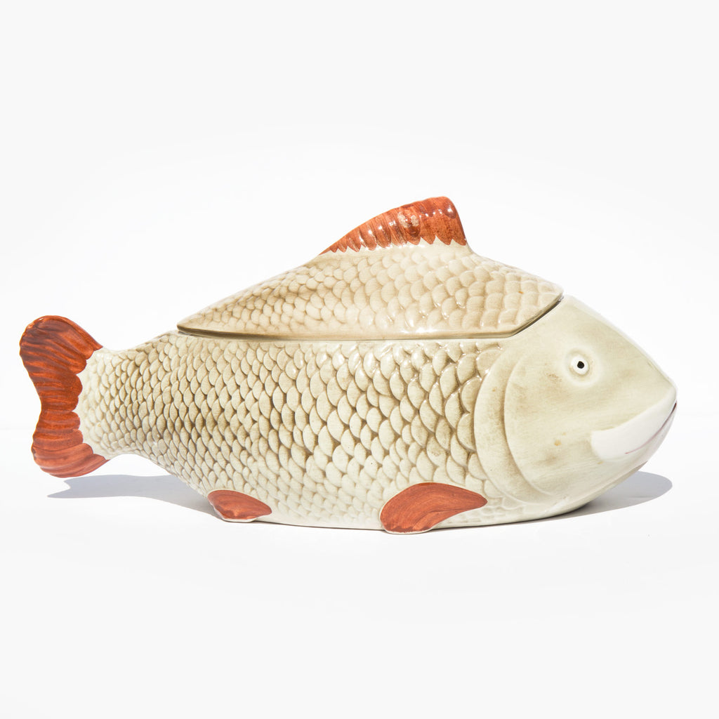 Large, painted fish soup or stew dish with lid.