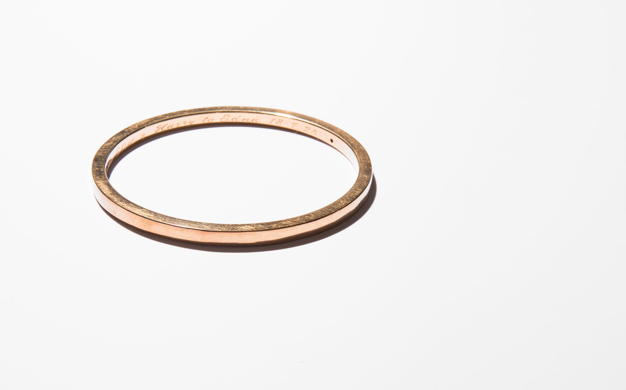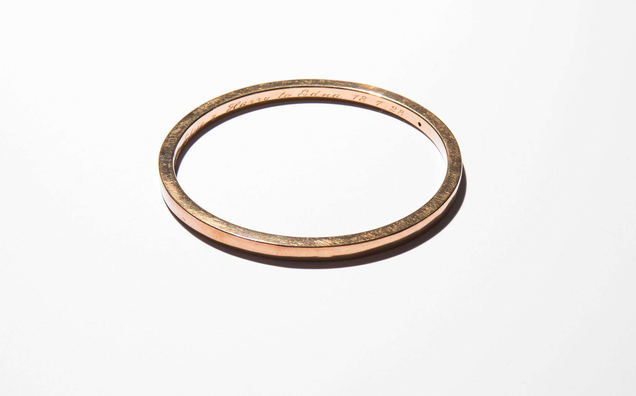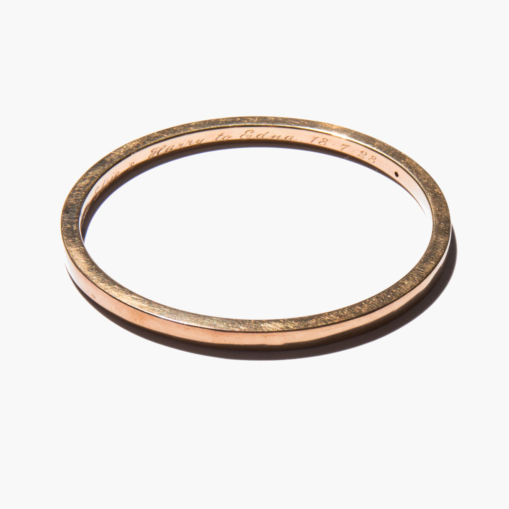 English 9k gold upper arm band bracelet, inscribed "Harry to Edna 18.7.28" An unusual piece that can be worn dressed up or down.
