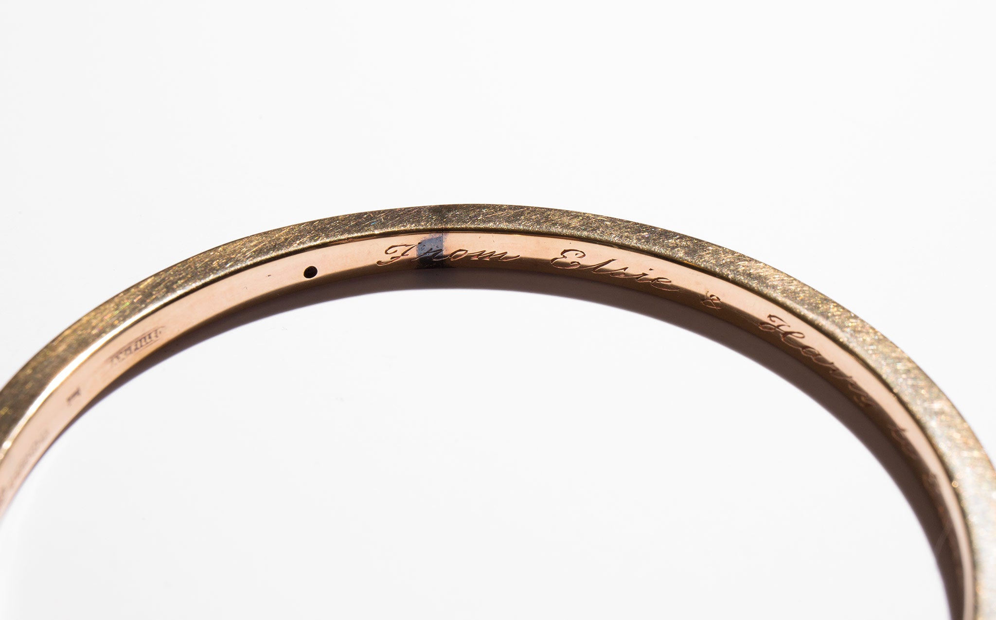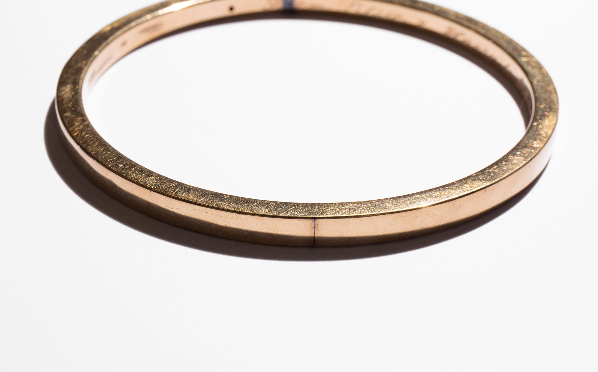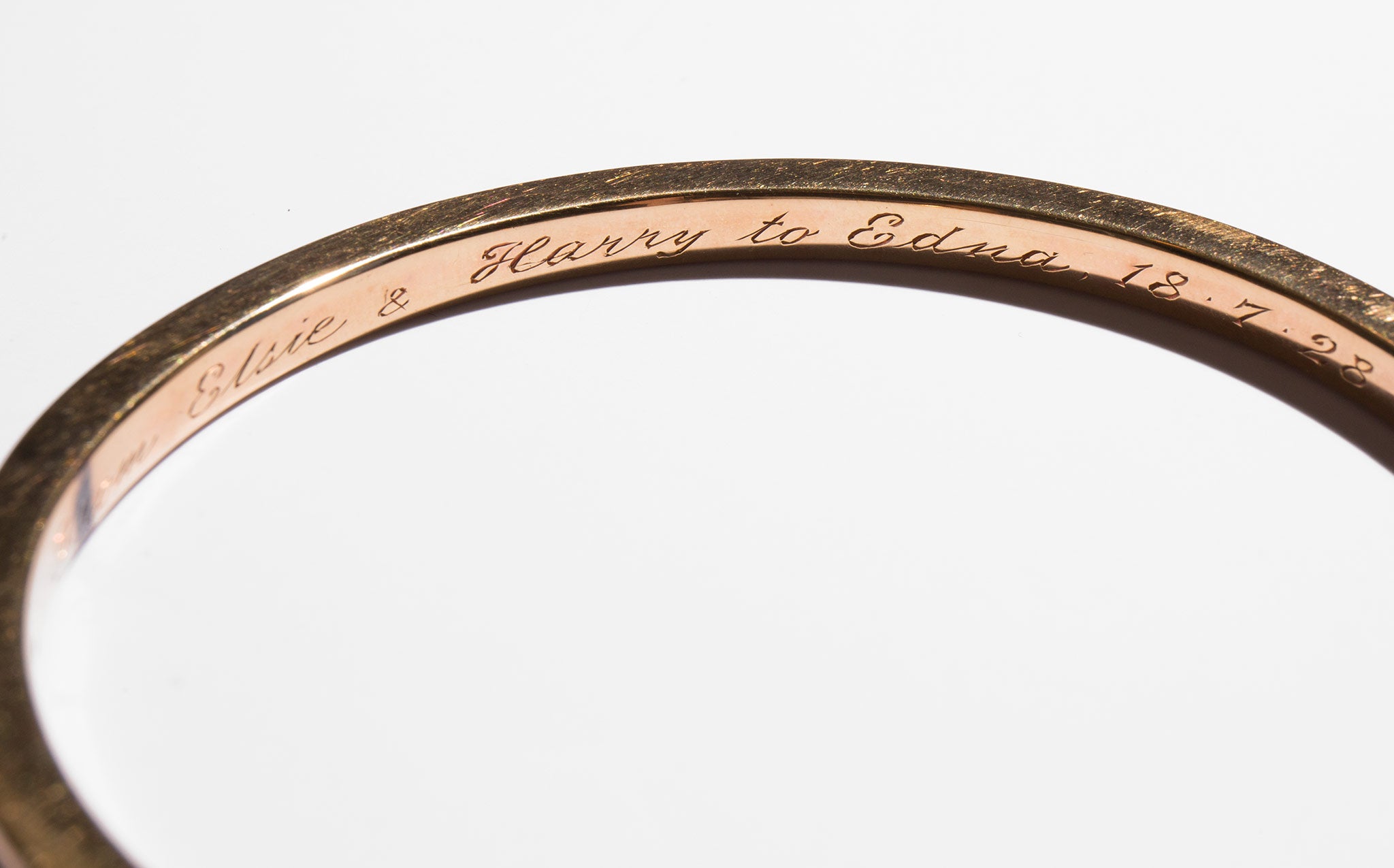 English 9k gold upper arm band bracelet, inscribed "Harry to Edna 18.7.28" An unusual piece that can be worn dressed up or down.