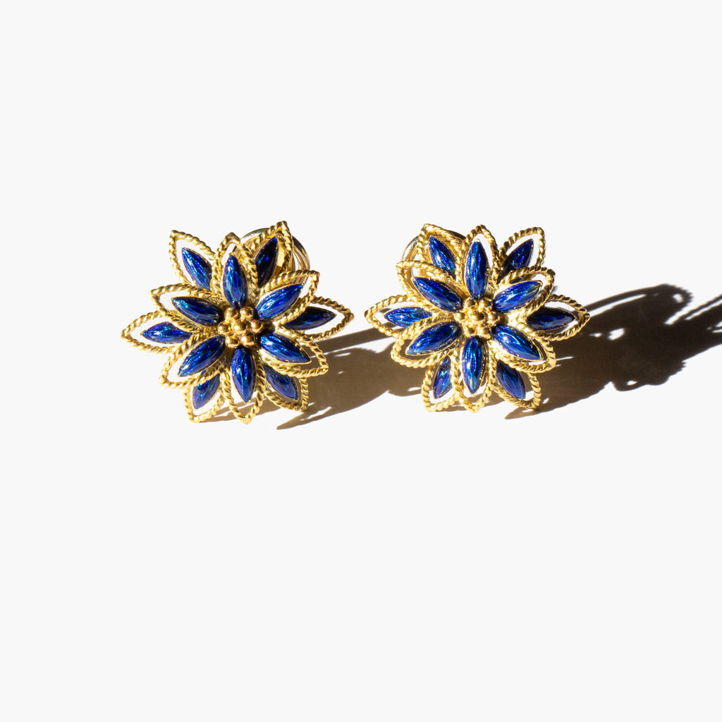 Flower burst earrings crafted with 14k gold and bold blue enamel.