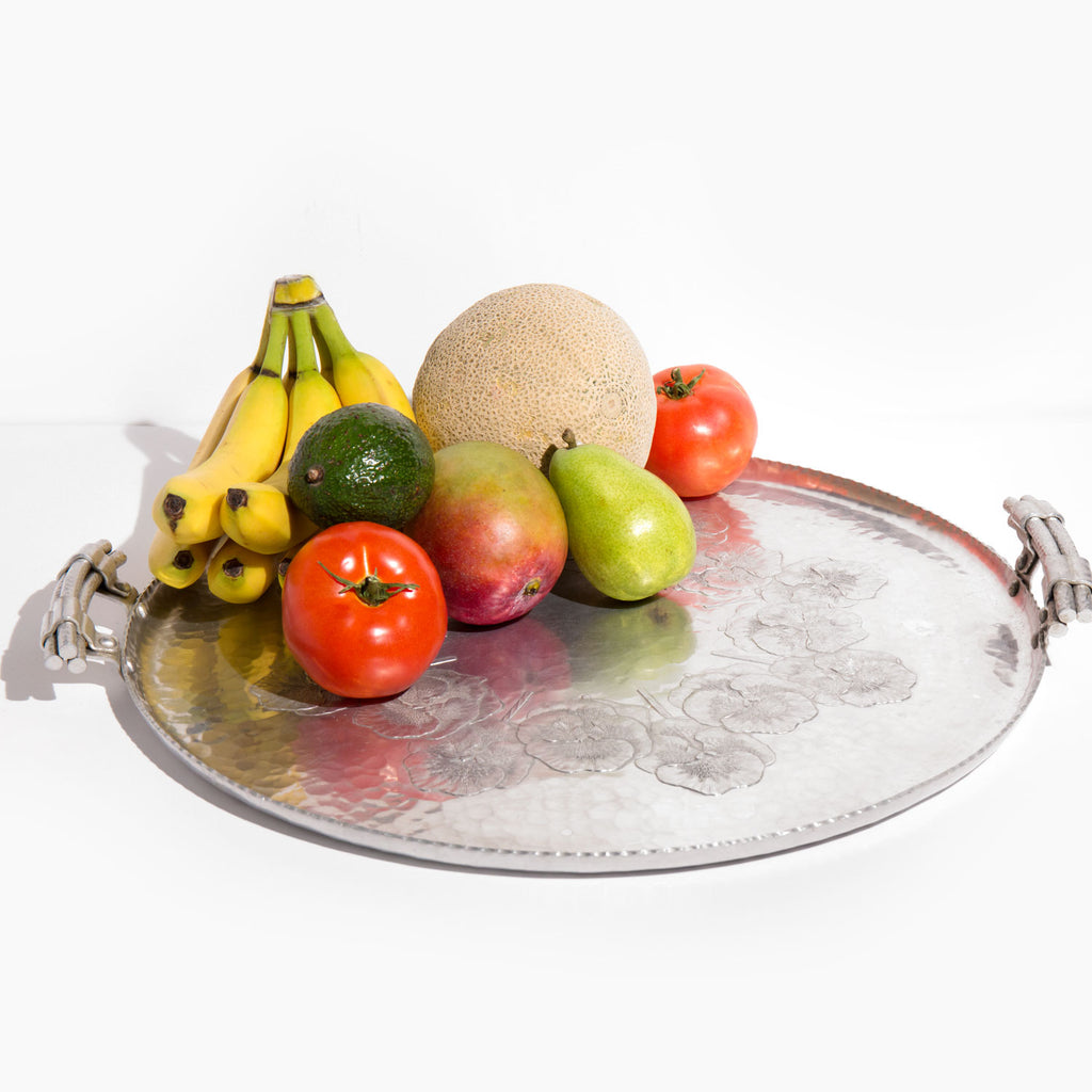 A large pewter platter adorned with striking, oversized pansies. A perfect, unusual serving piece for holiday entertaining.
