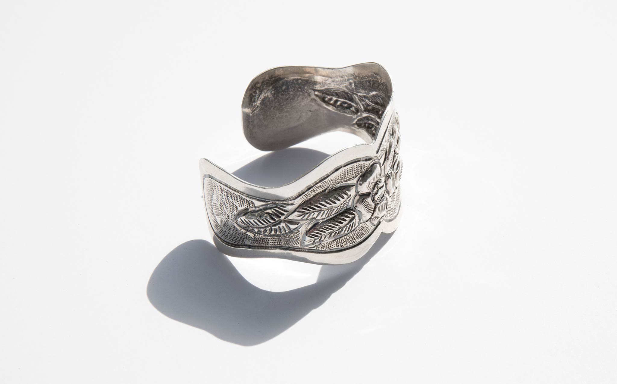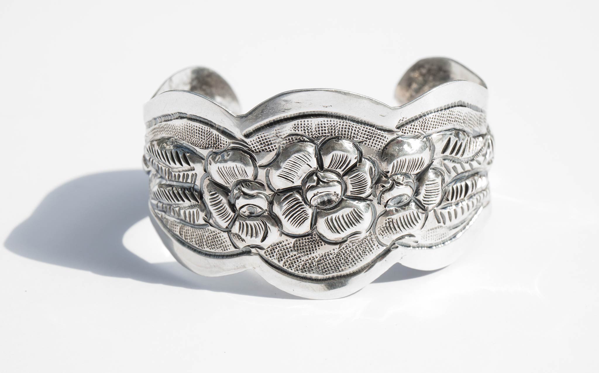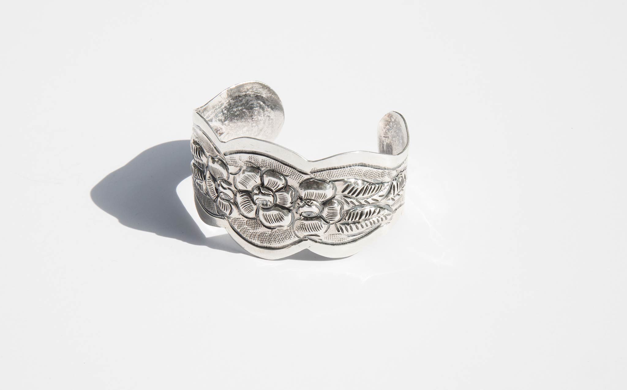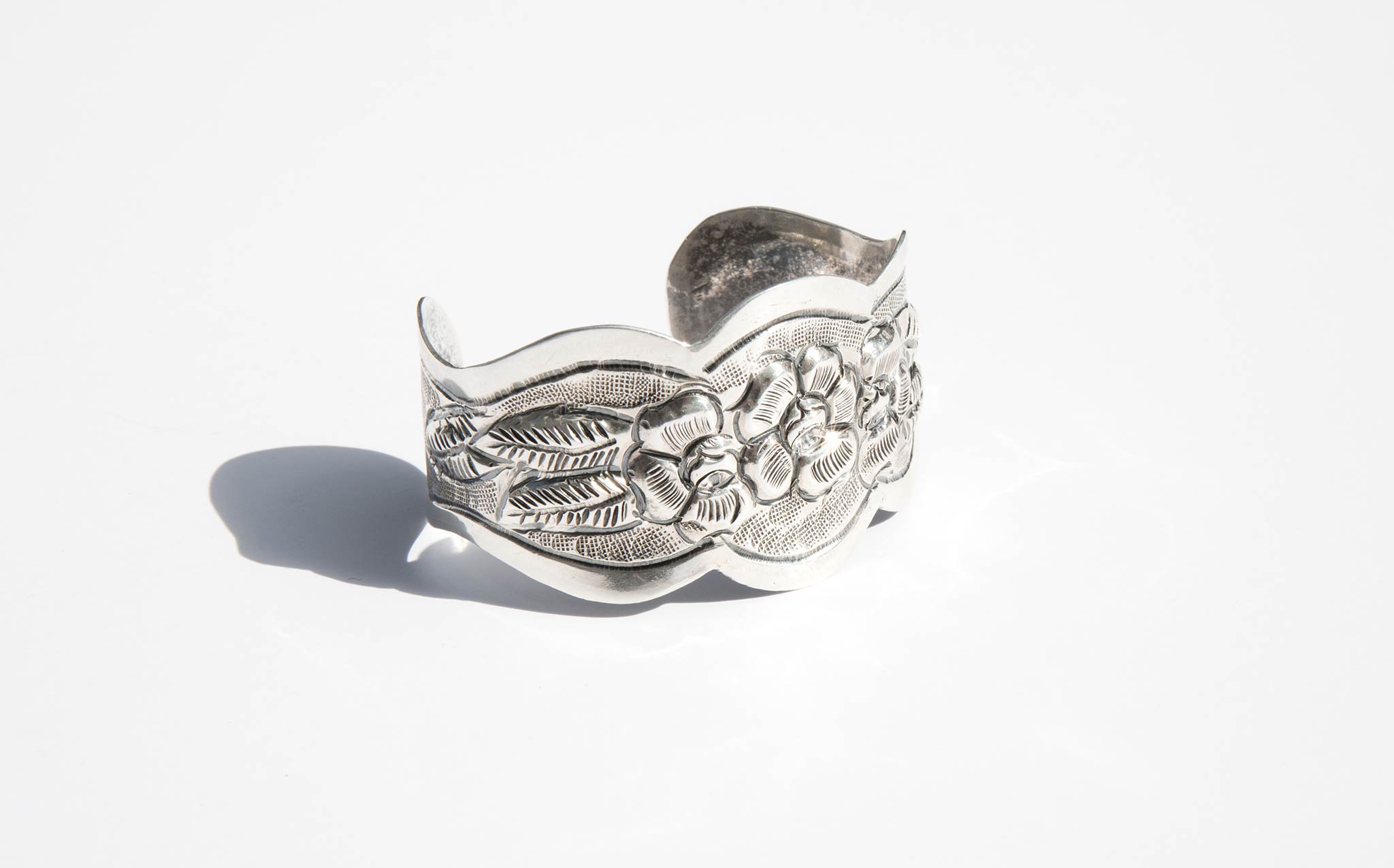 Beautifully etched, perfect fit, silver floral cuff. Chic and interesting worn alone and makes a statement stacked with the Braid Strand Silver Cuff and the Double Strand Silver Cuff.