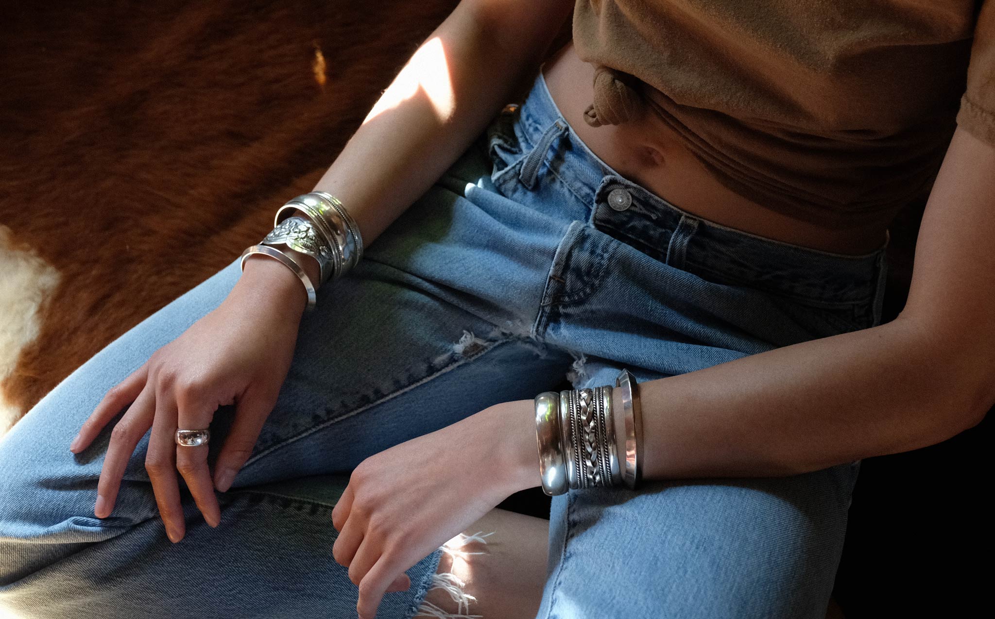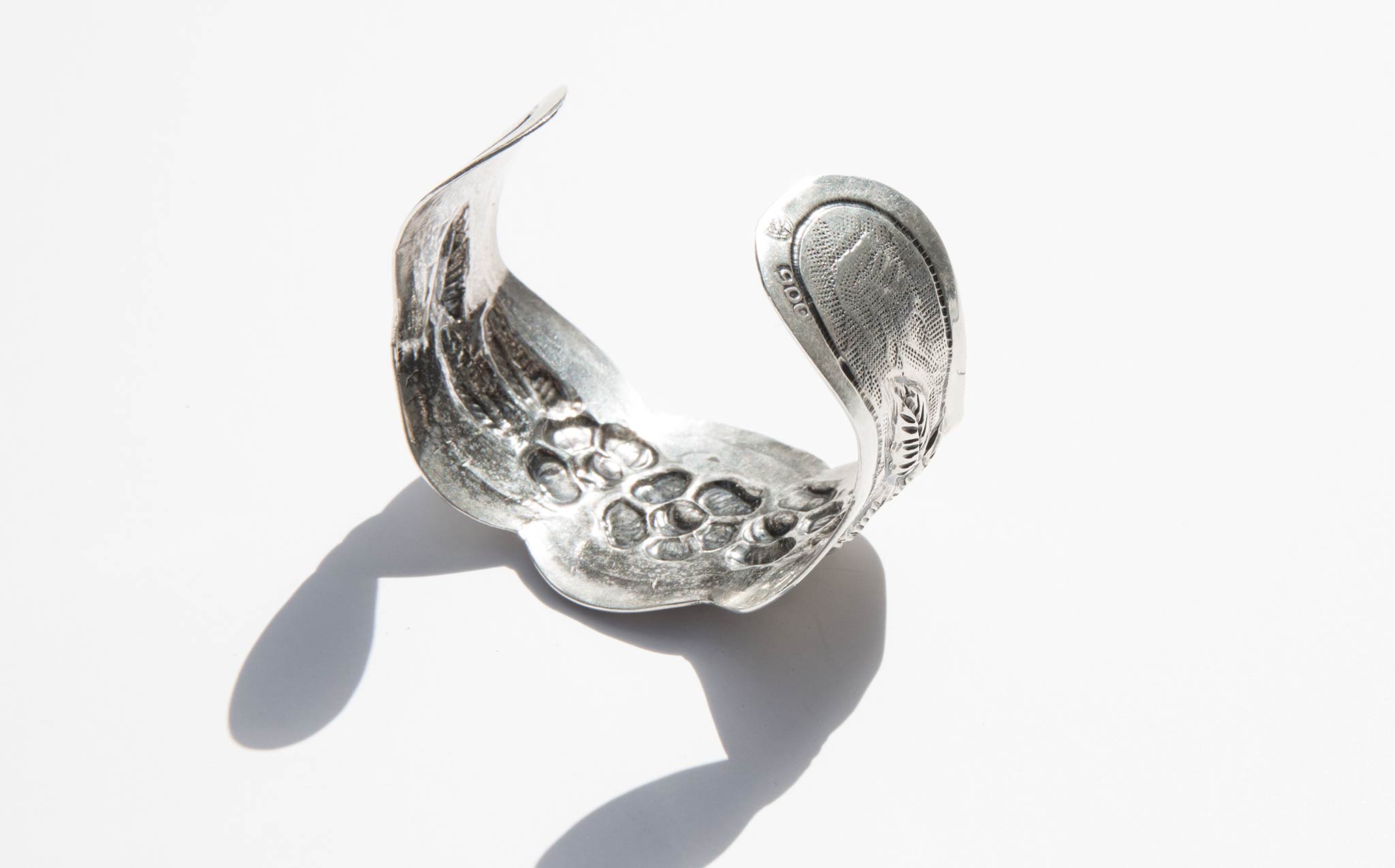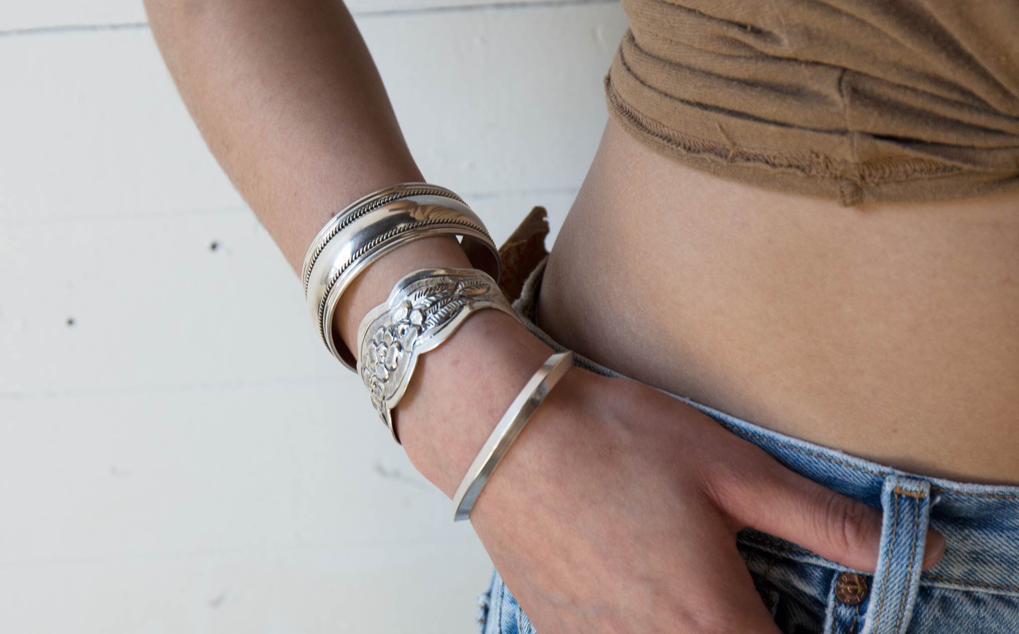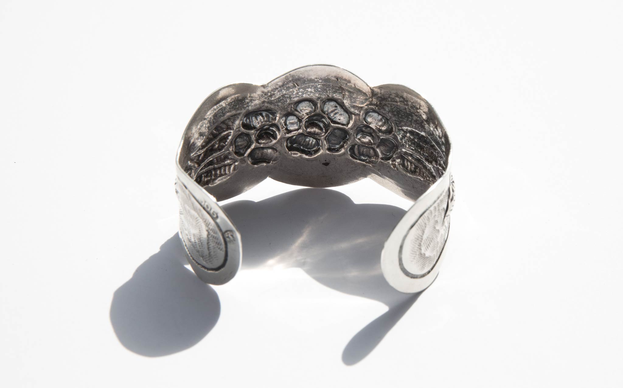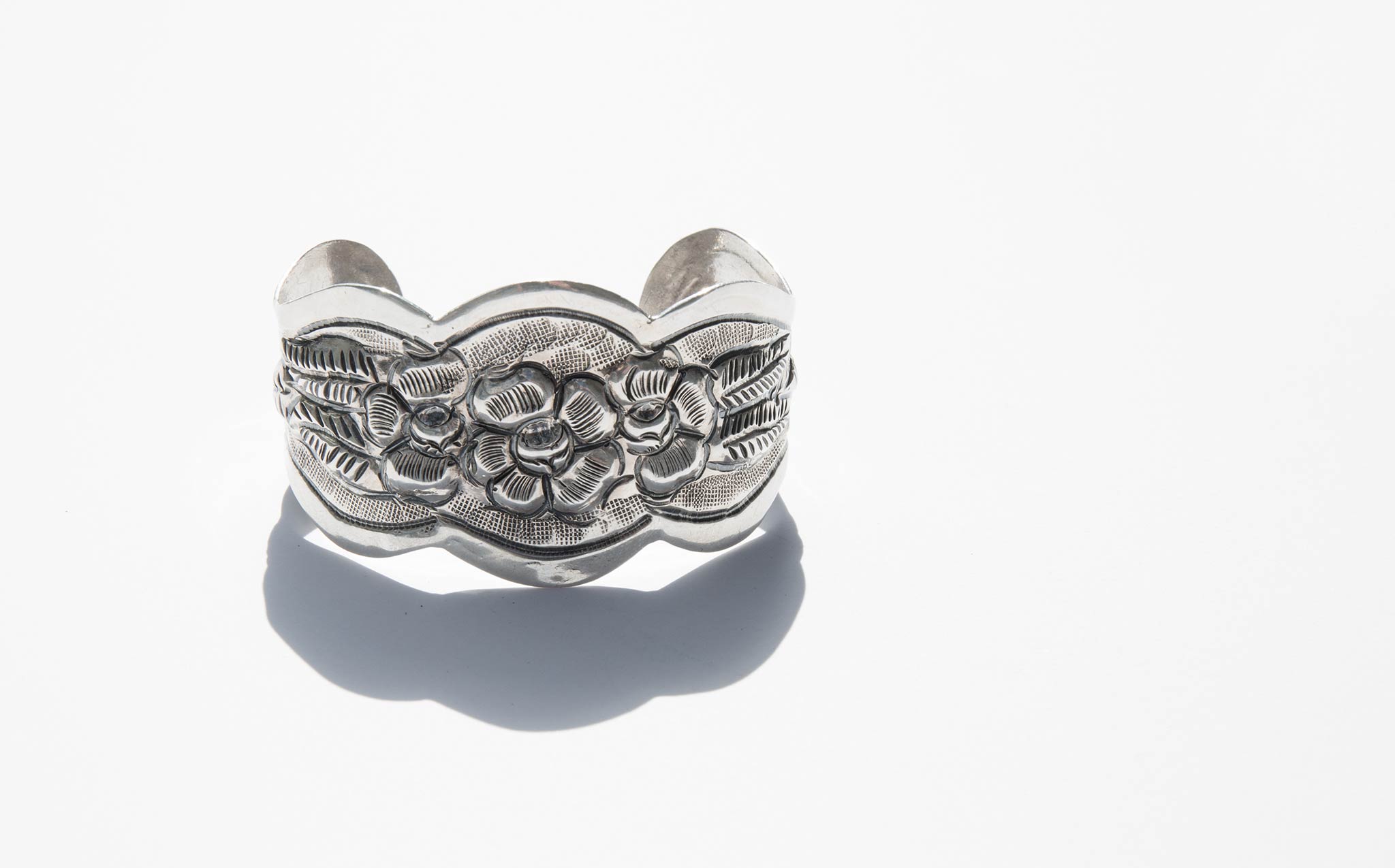 Beautifully etched, perfect fit, silver floral cuff. Chic and interesting worn alone and makes a statement stacked with the Braid Strand Silver Cuff and the Double Strand Silver Cuff.