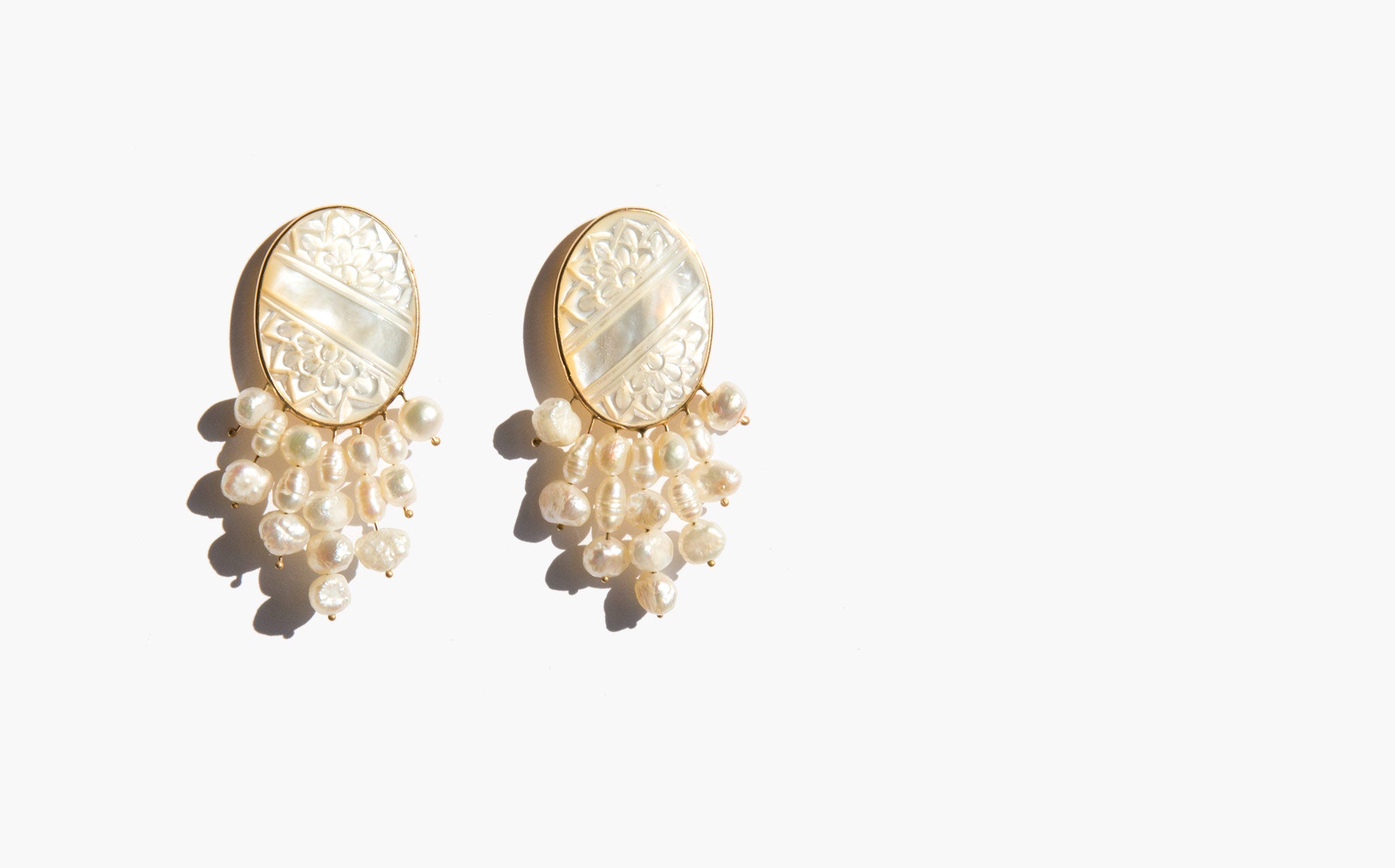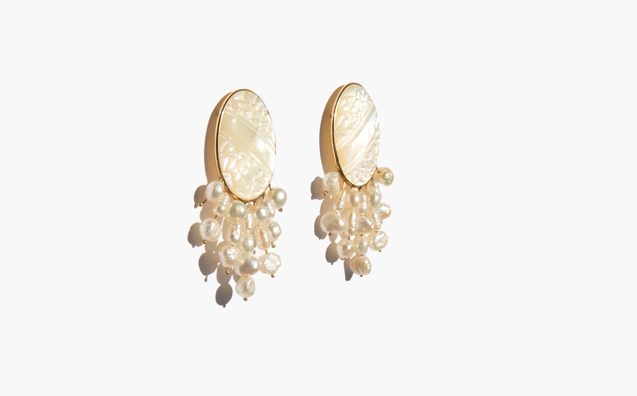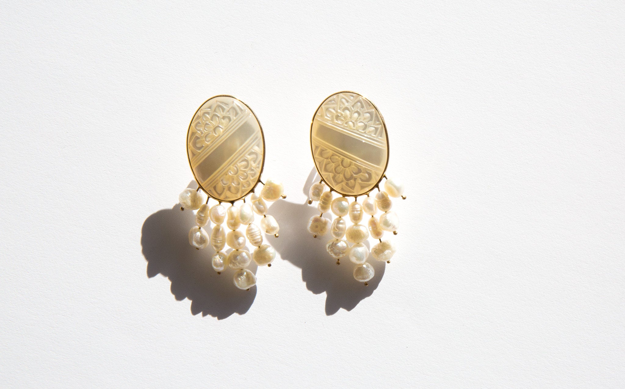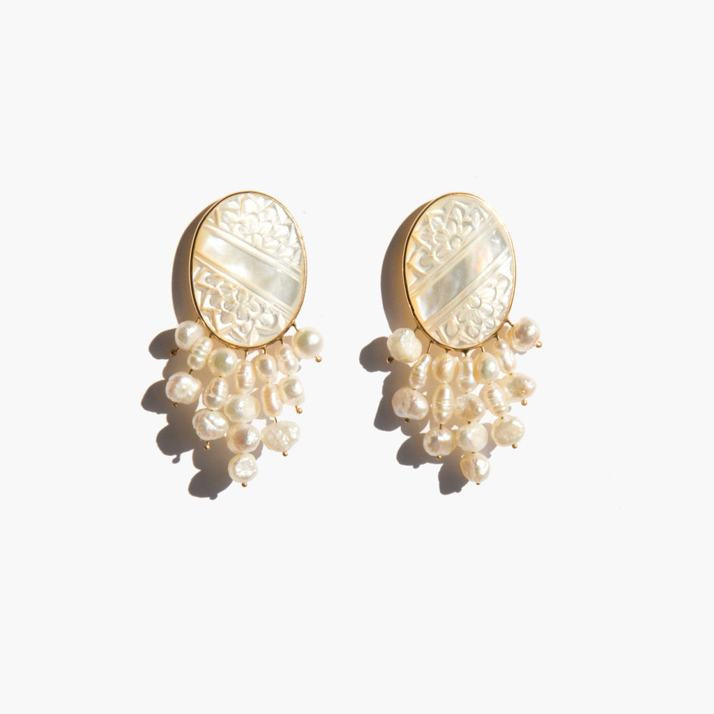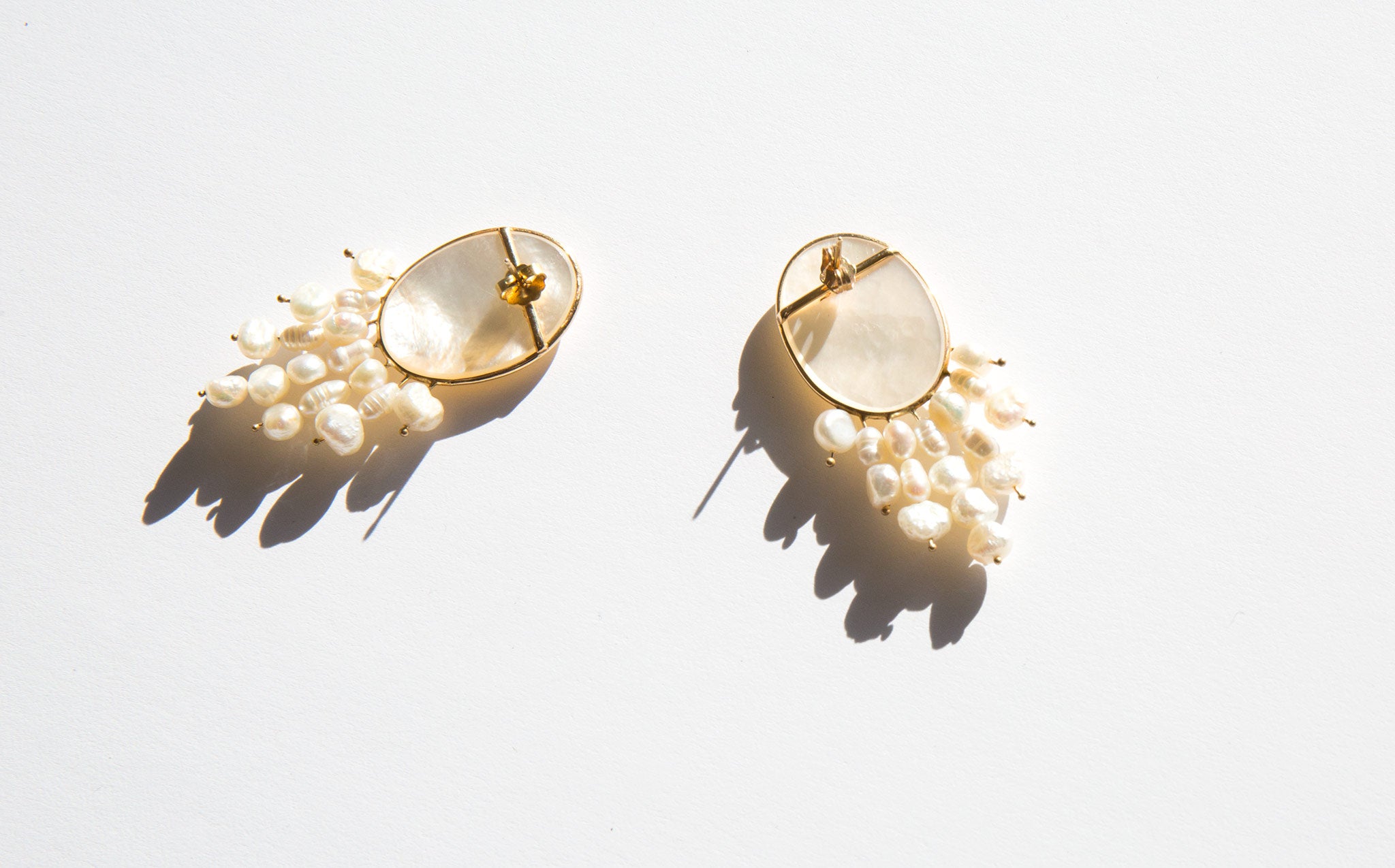 Dazzling statement earrings of 14k gold, mother-of-pearl, and freshwater pearl.