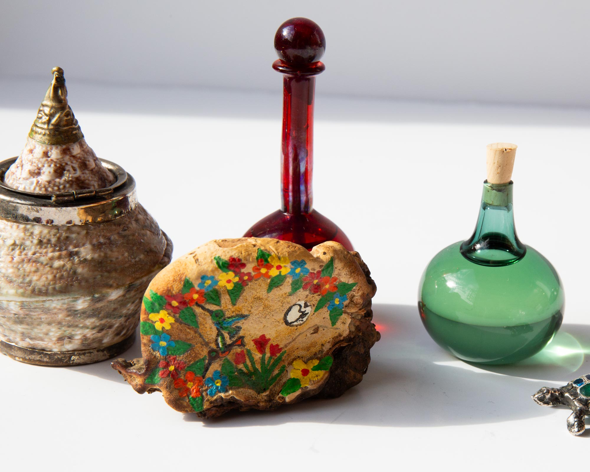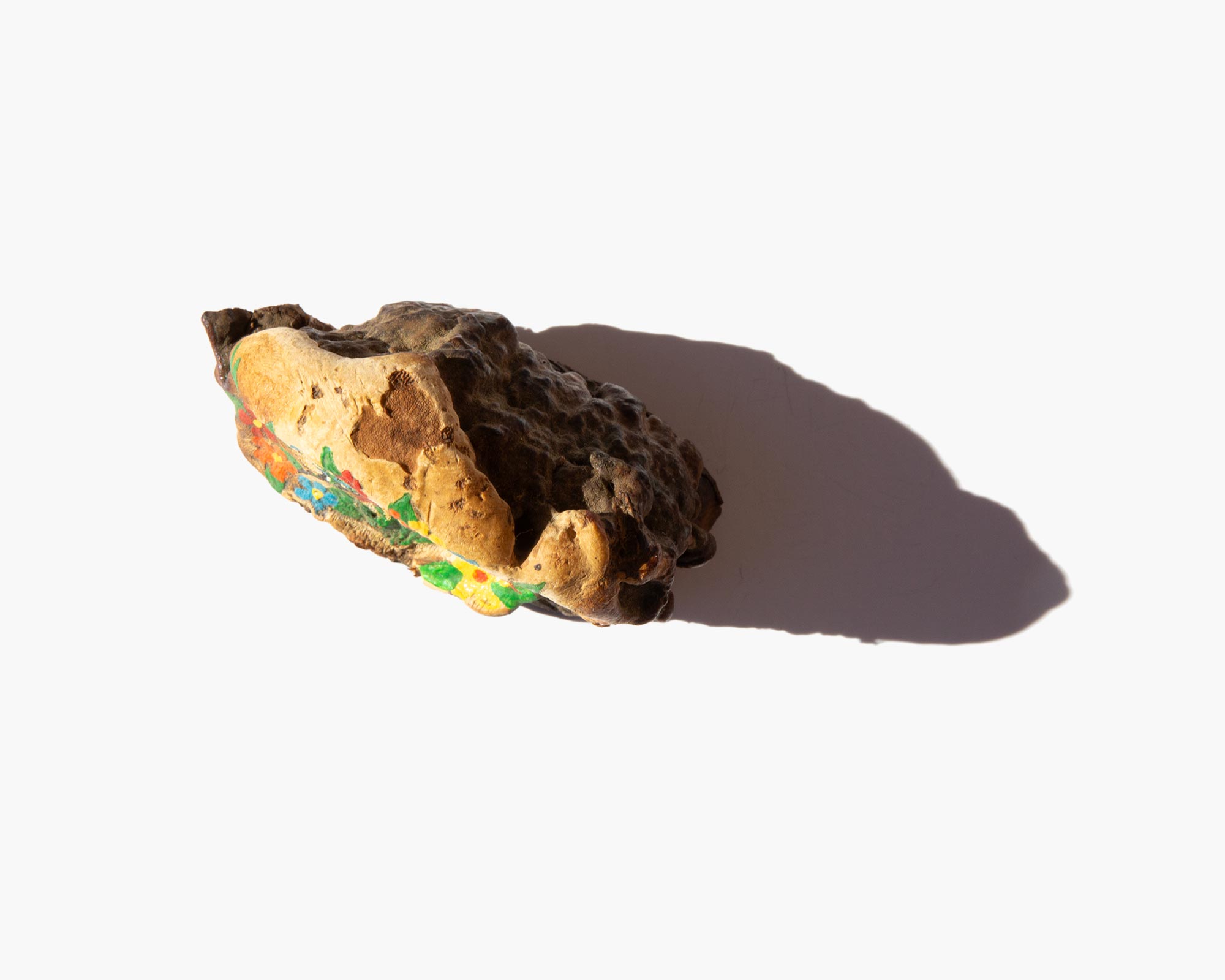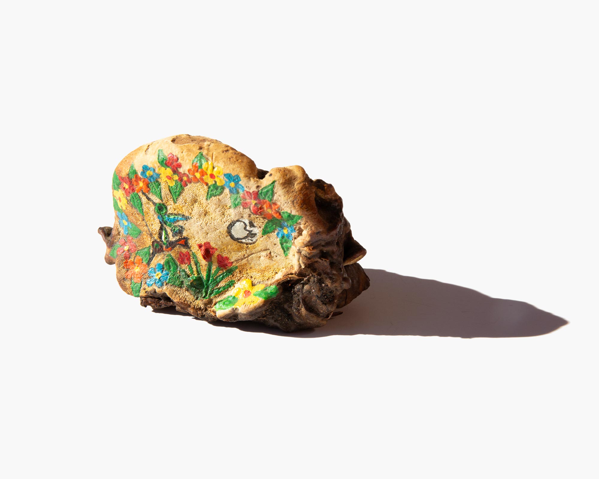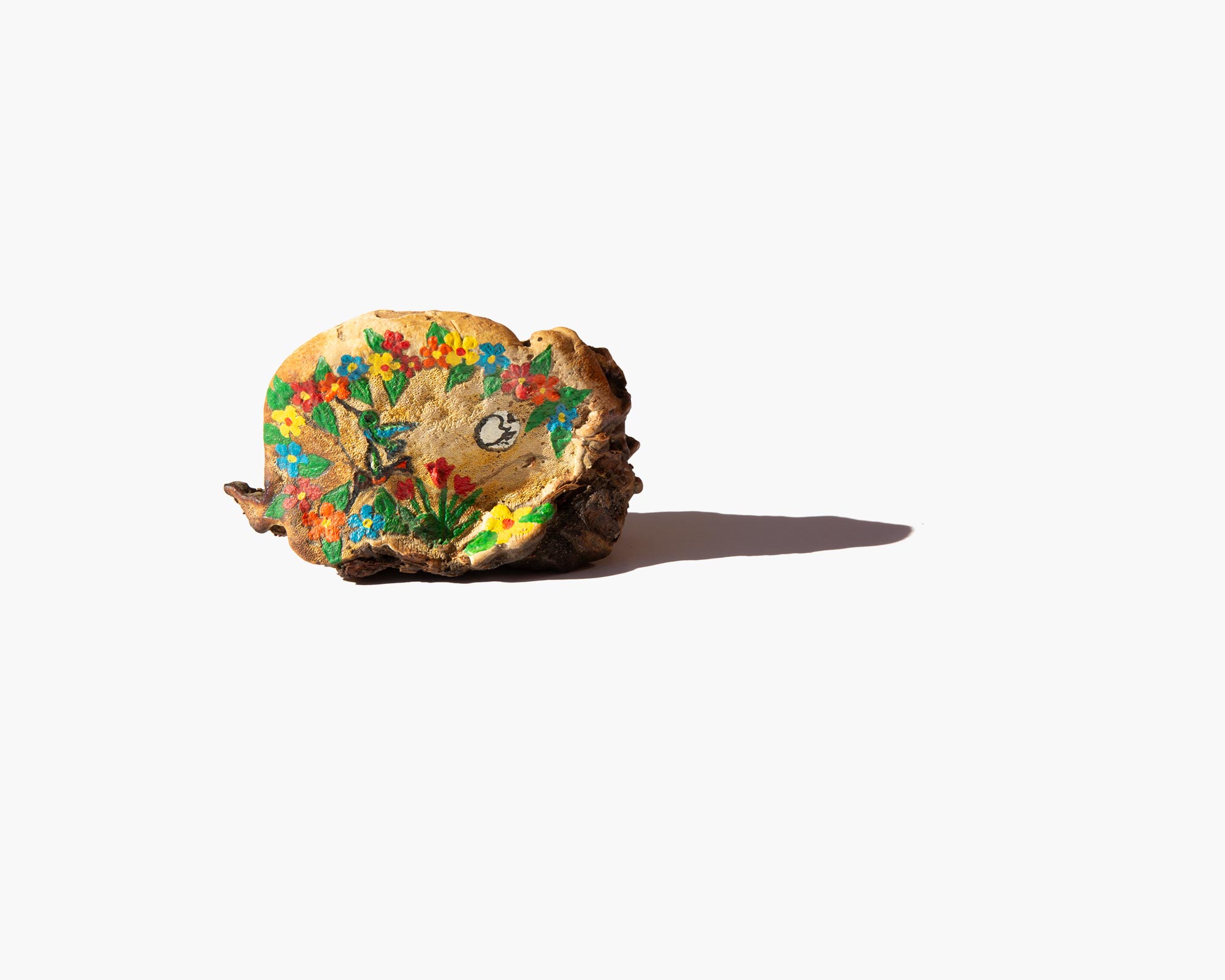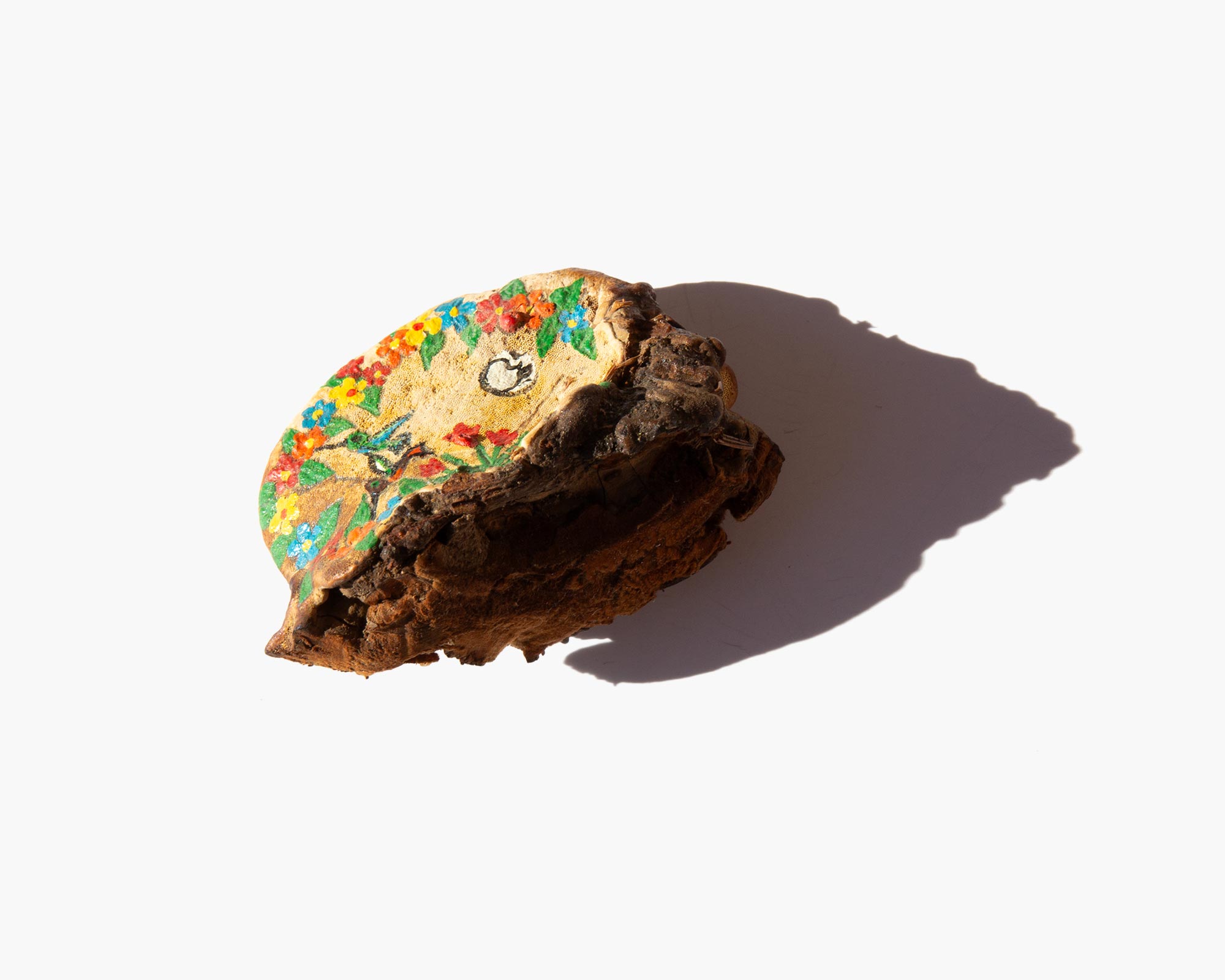 Small handmade folk art hummingbird and flowers painting on a conk mushroom.