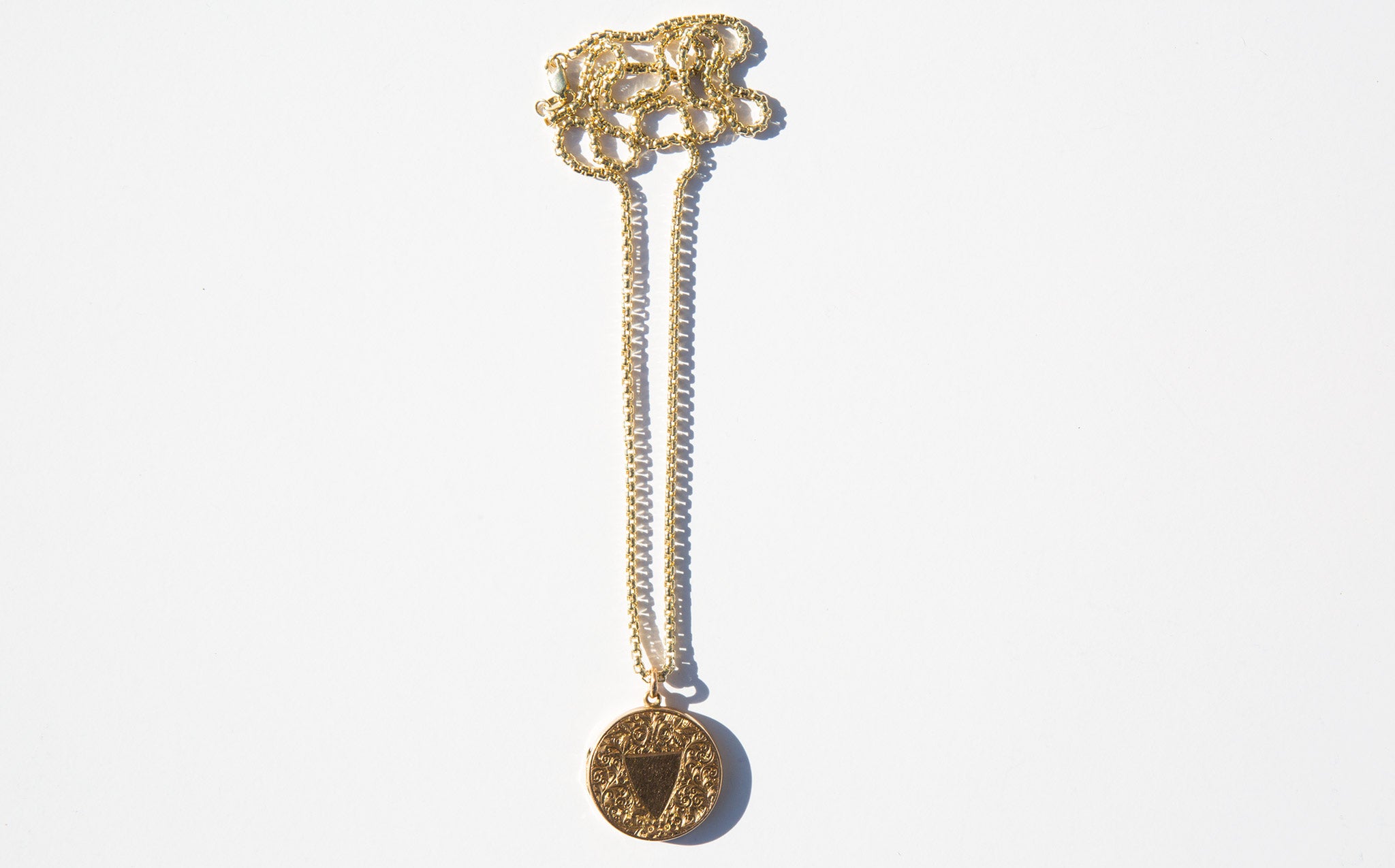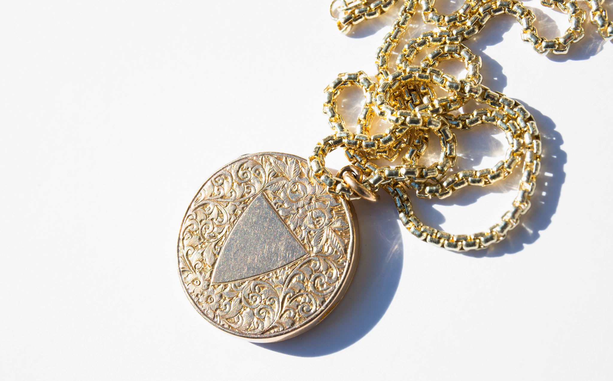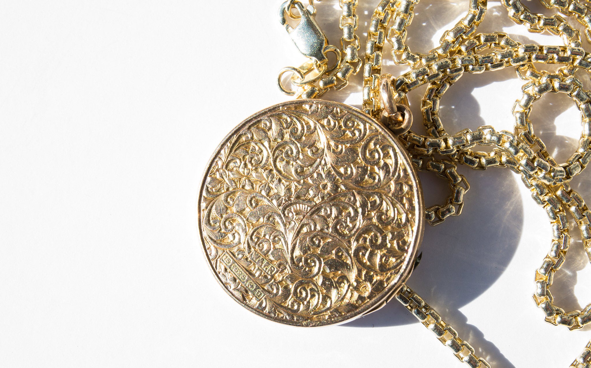 Detailed antique 15k gold locket on an interesting 14k gold round link chain.