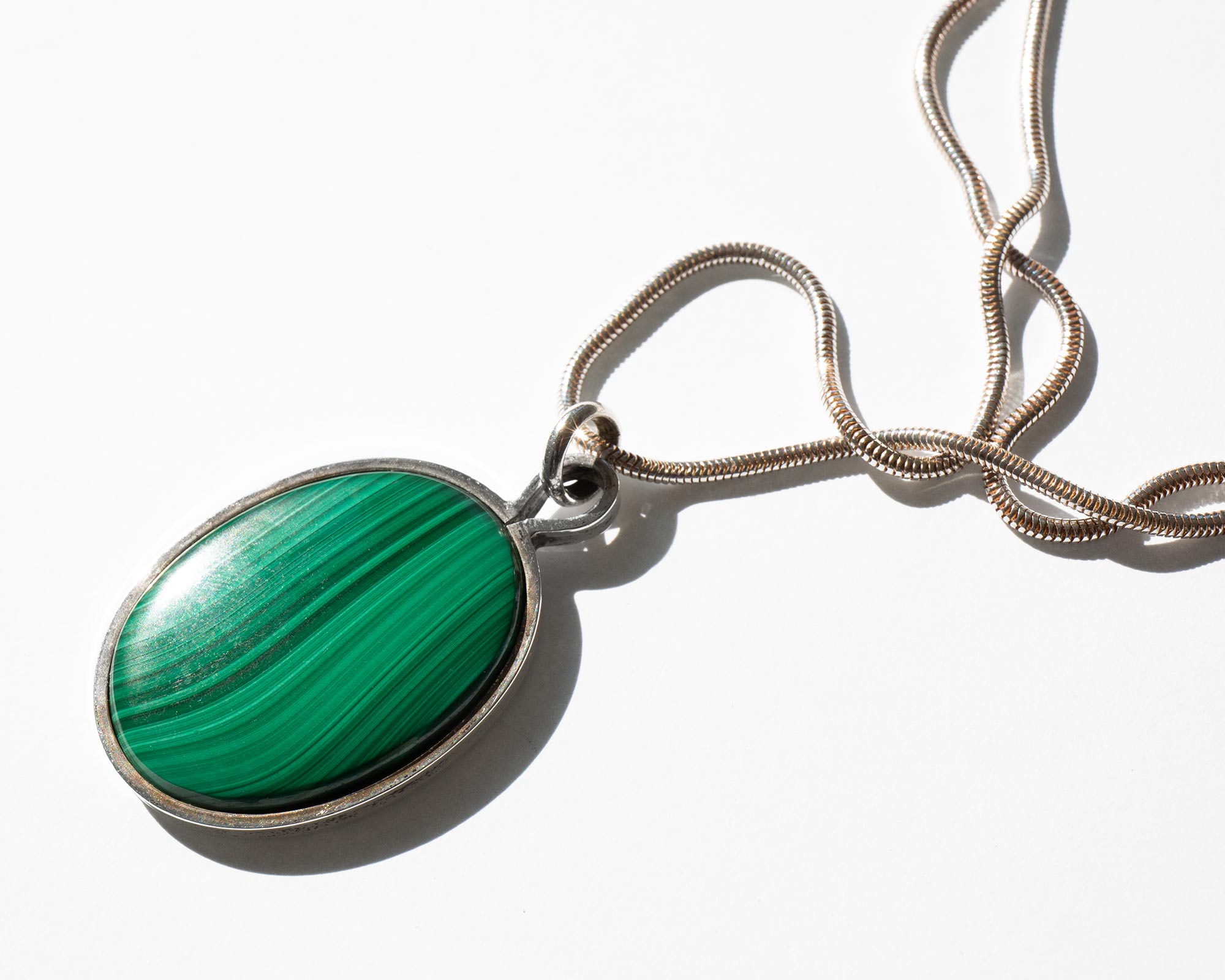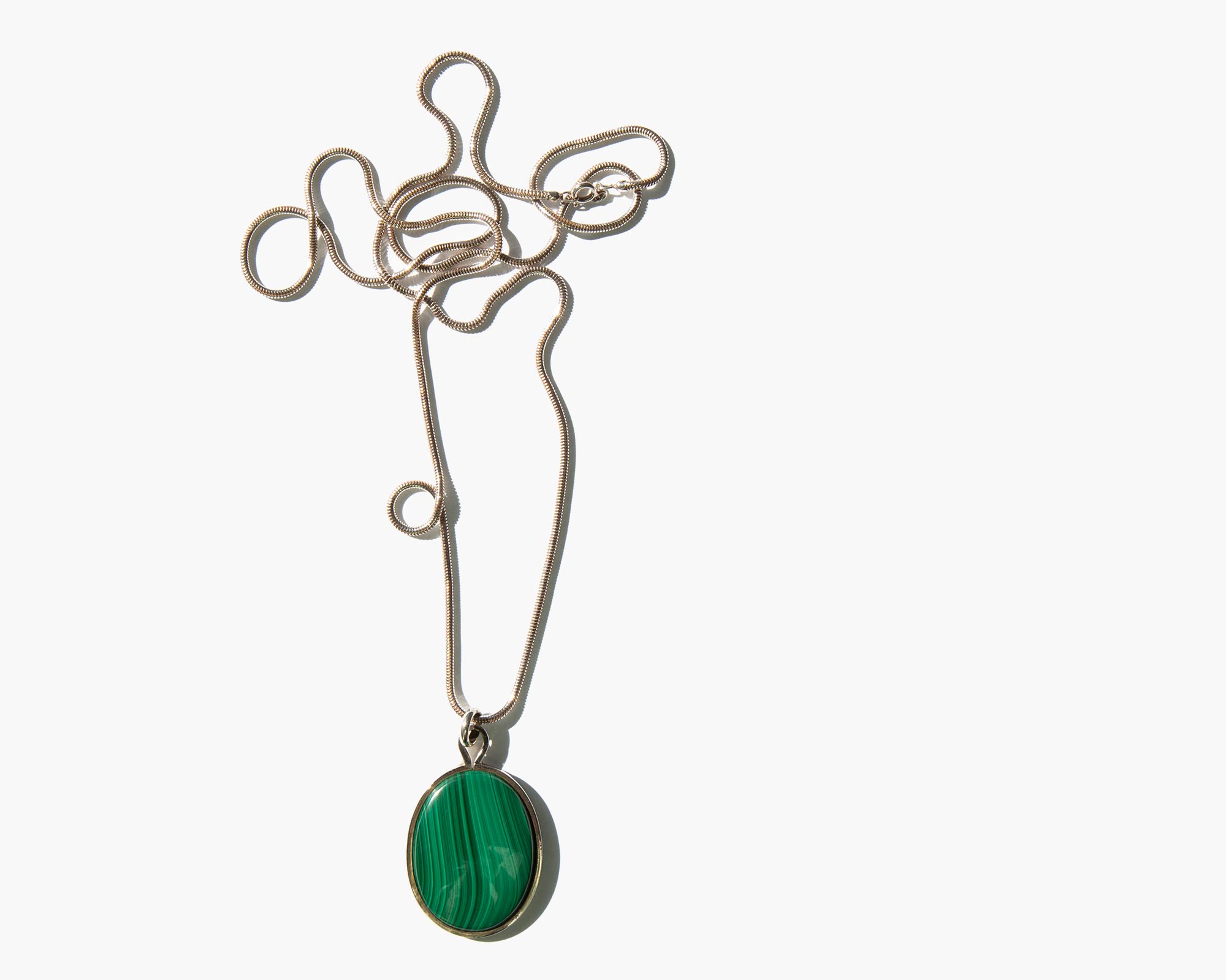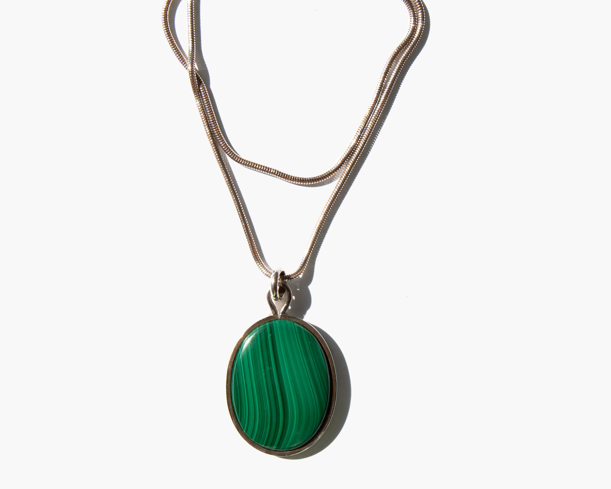 Simple and chic sterling and malachite pendant on a sterling silver snake chain. From the Greek word malakos, meaning soft, malachite is said to be a stone that opens the heart, clears negative energy, and protects one from the evil eye and other detrimental and draining forces.