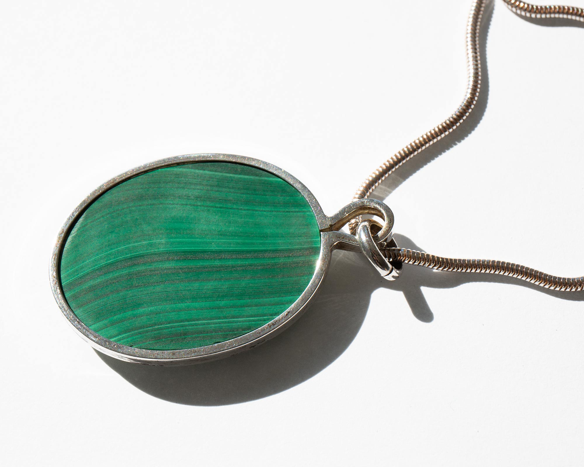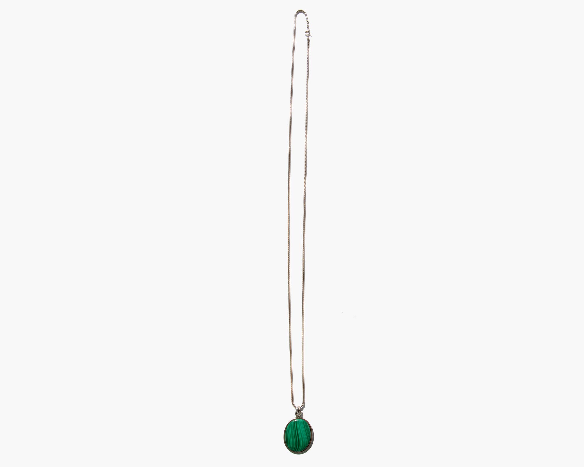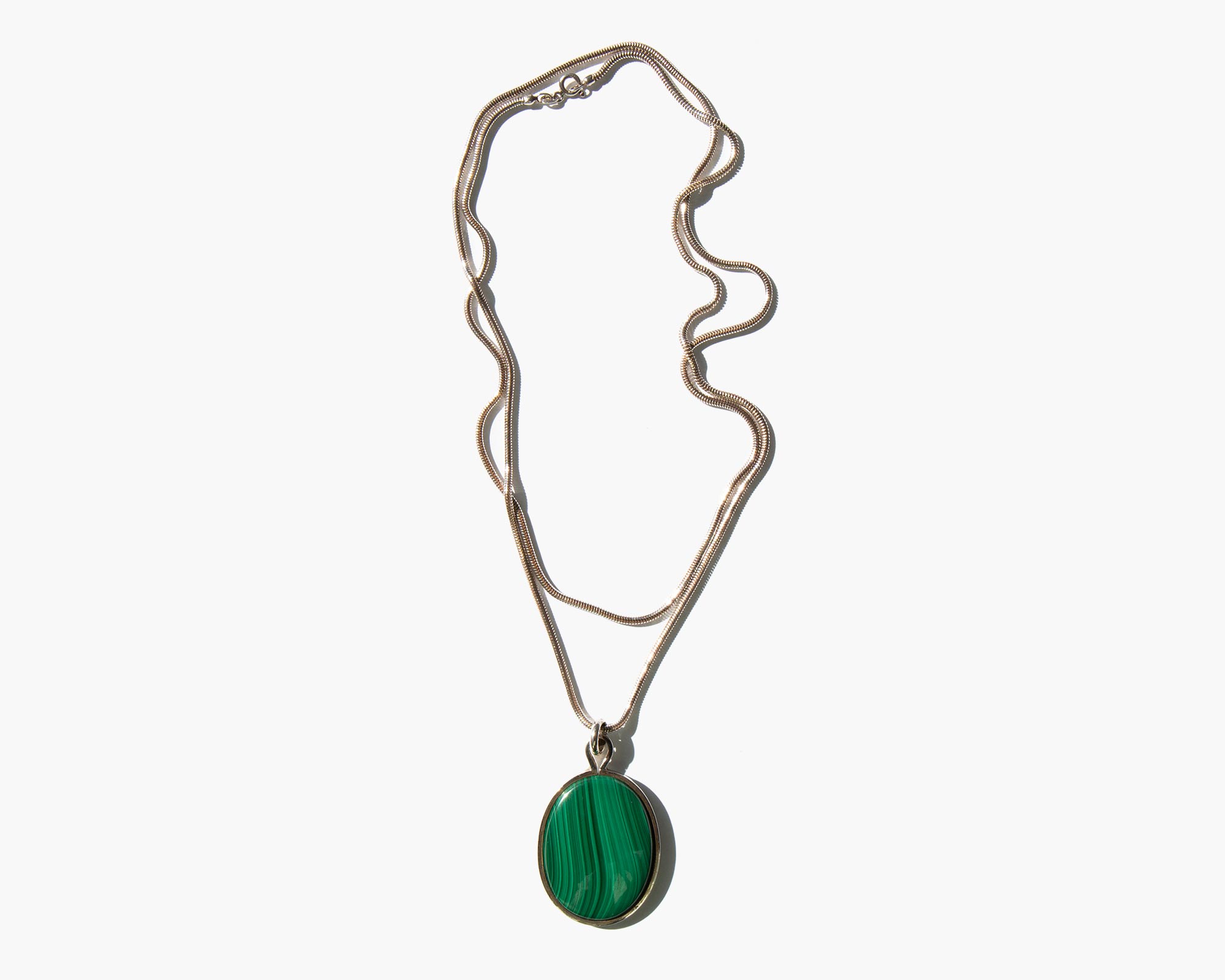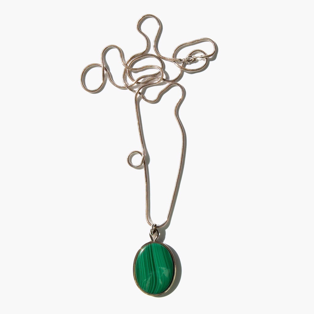 Simple and chic sterling and malachite pendant on a sterling silver snake chain. From the Greek word malakos, meaning soft, malachite is said to be a stone that opens the heart, clears negative energy, and protects one from the evil eye and other detrimental and draining forces.